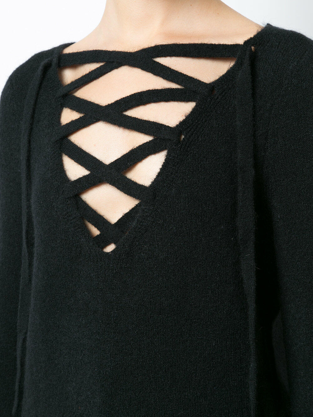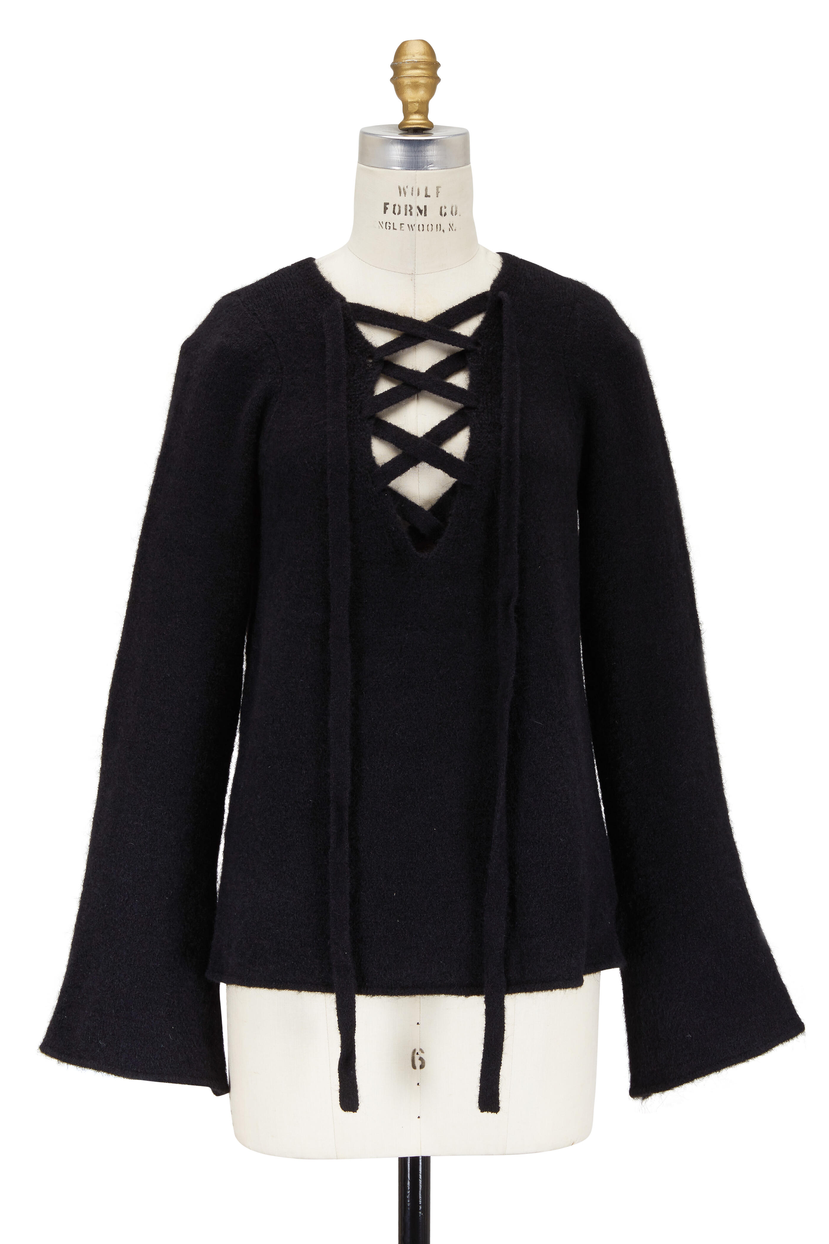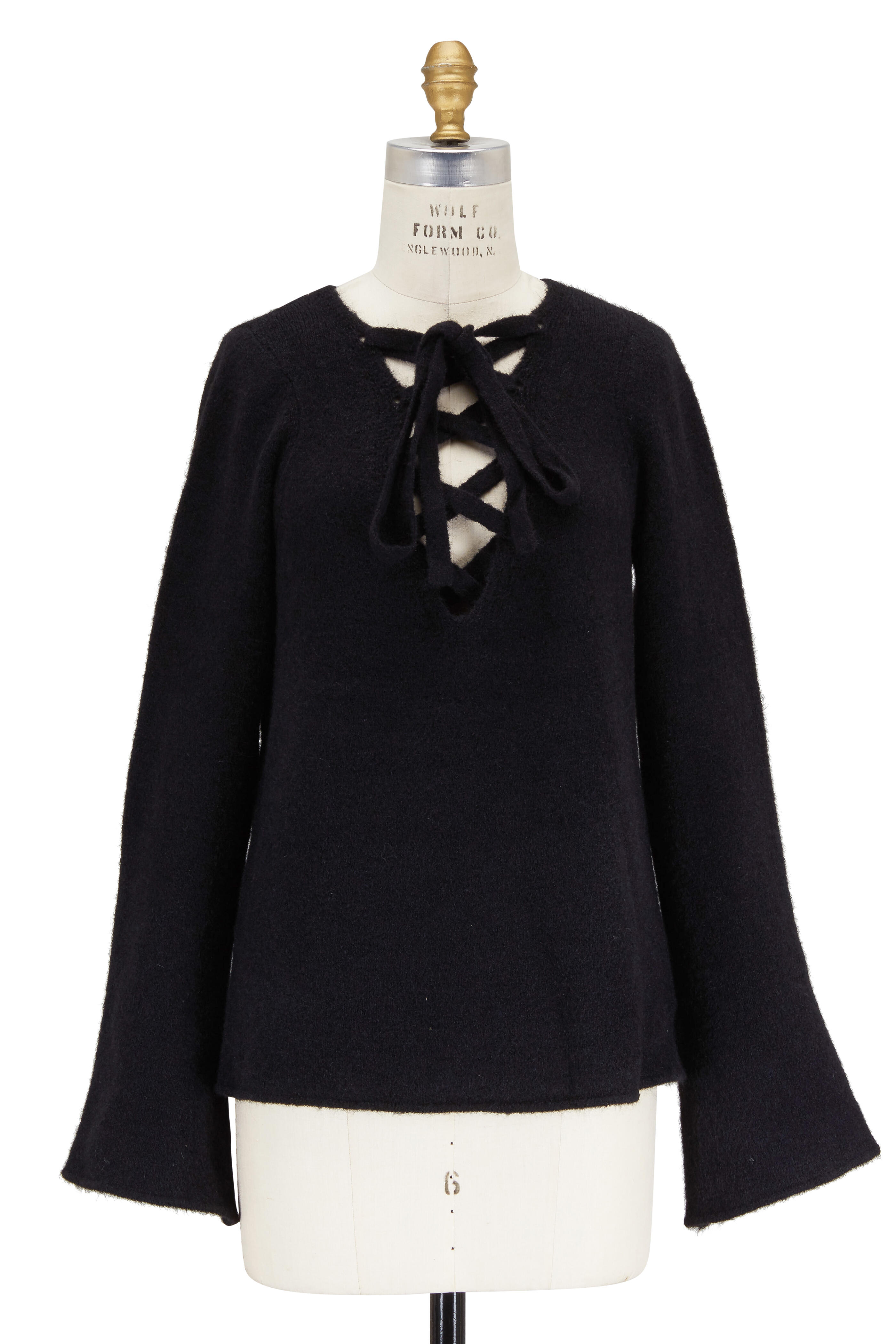 Lace-up v-neckline. Pullover style. Long bell sleeves. Imported. 38% polyamide, 26% polyacrylic, 25% alpaca, 10% wool, 1% elastane. Dry clean.