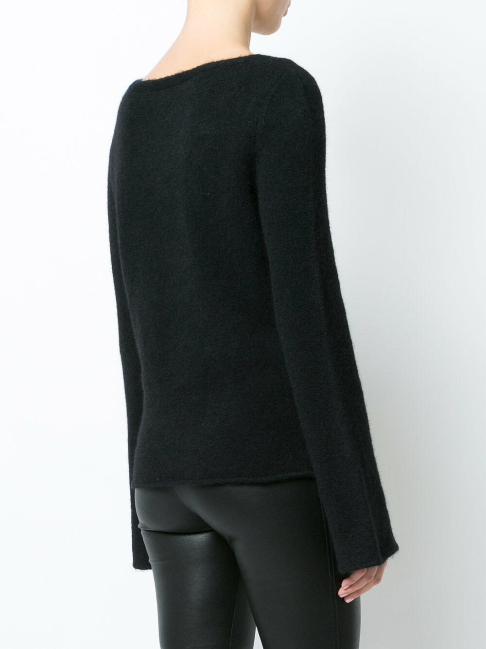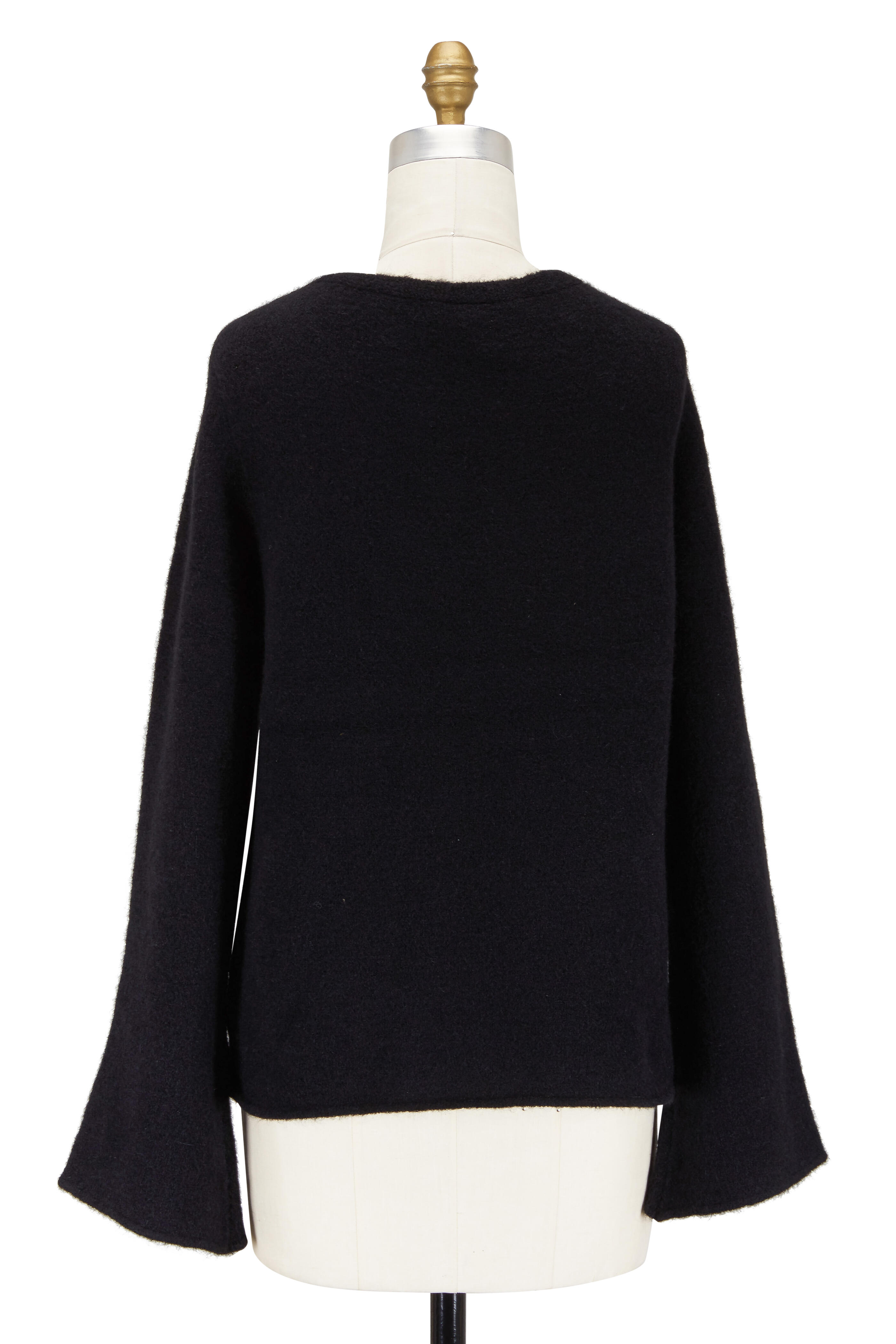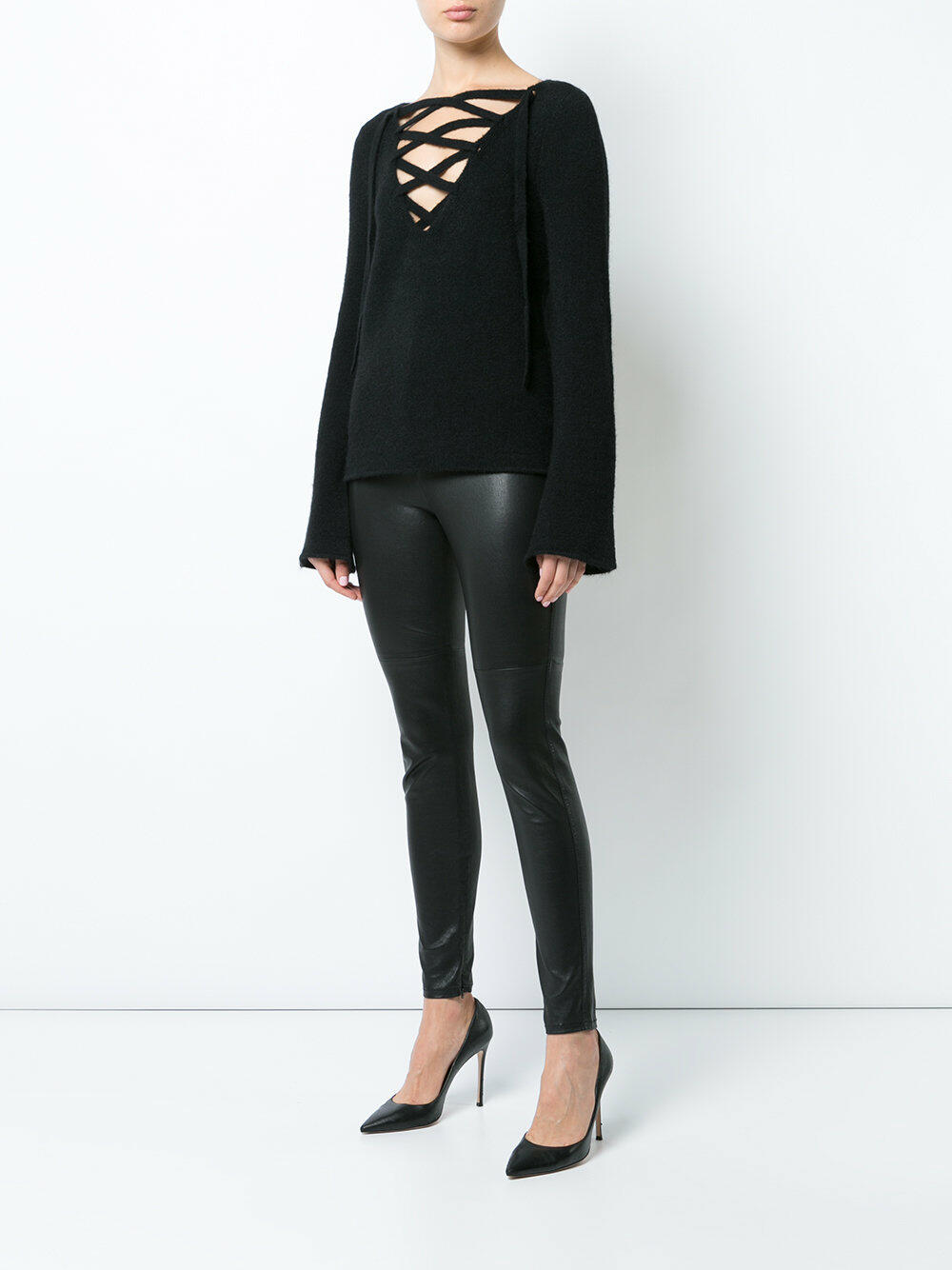 Lace-up v-neckline. Pullover style. Long bell sleeves. Imported. 38% polyamide, 26% polyacrylic, 25% alpaca, 10% wool, 1% elastane. Dry clean.