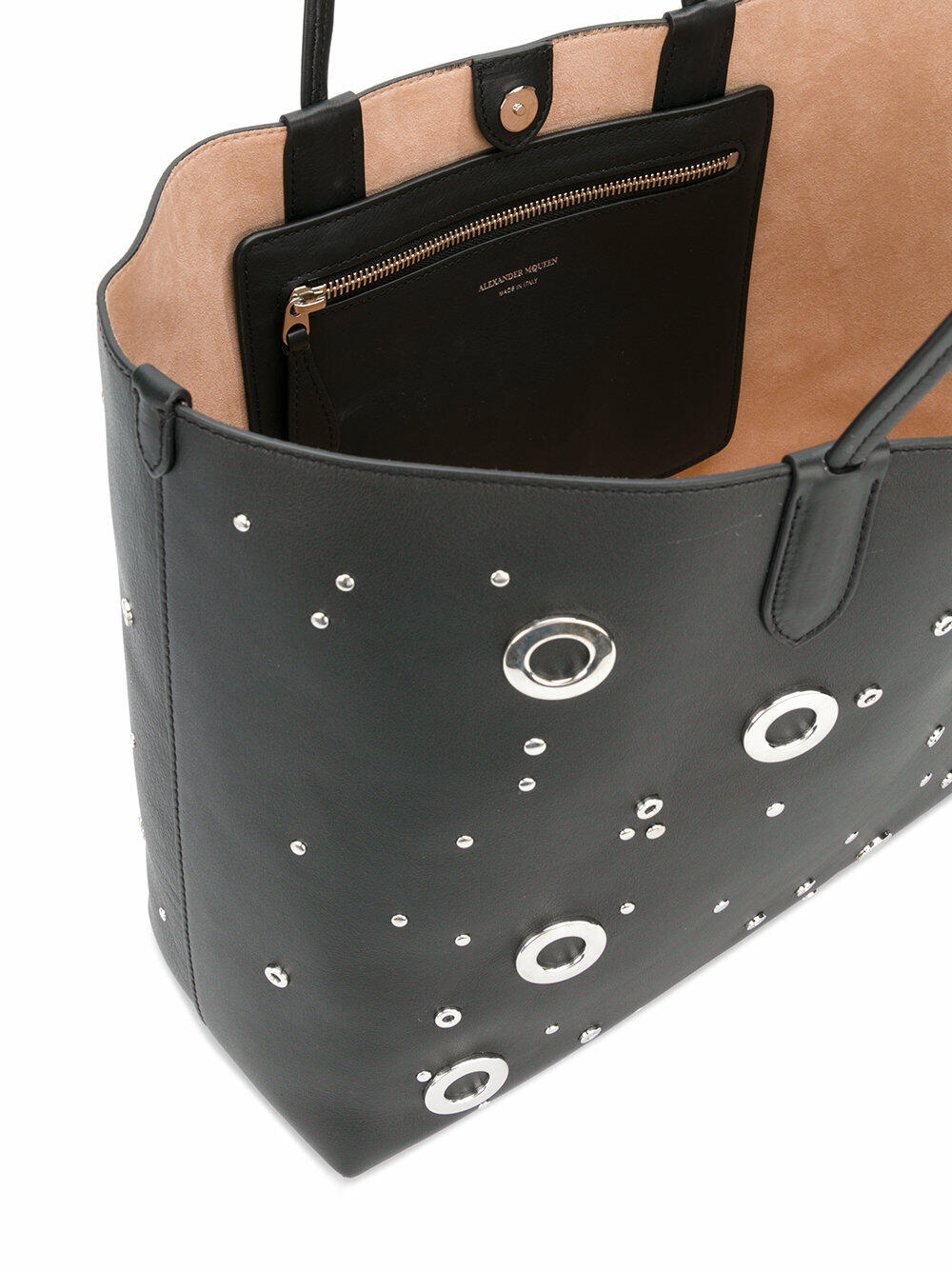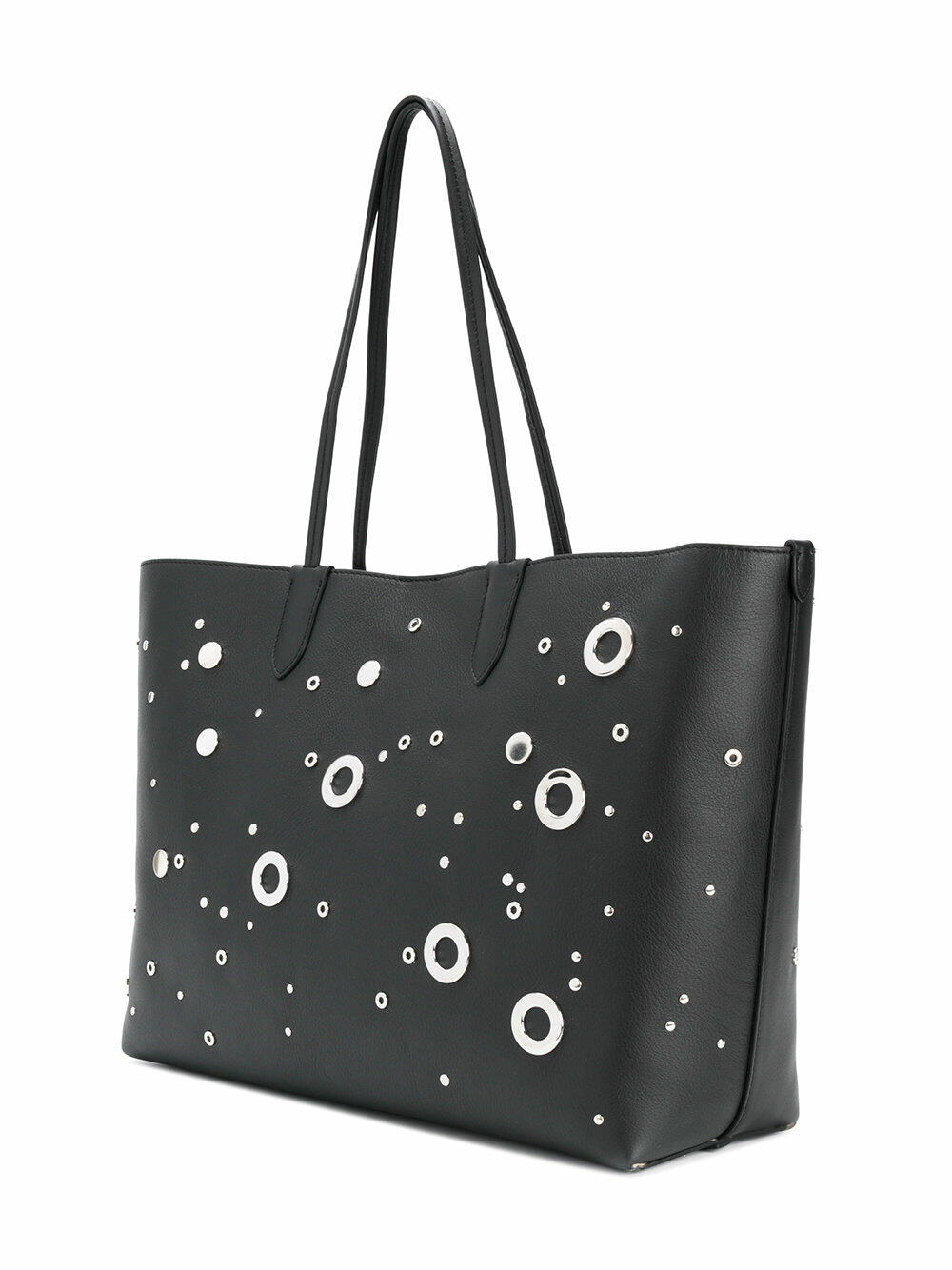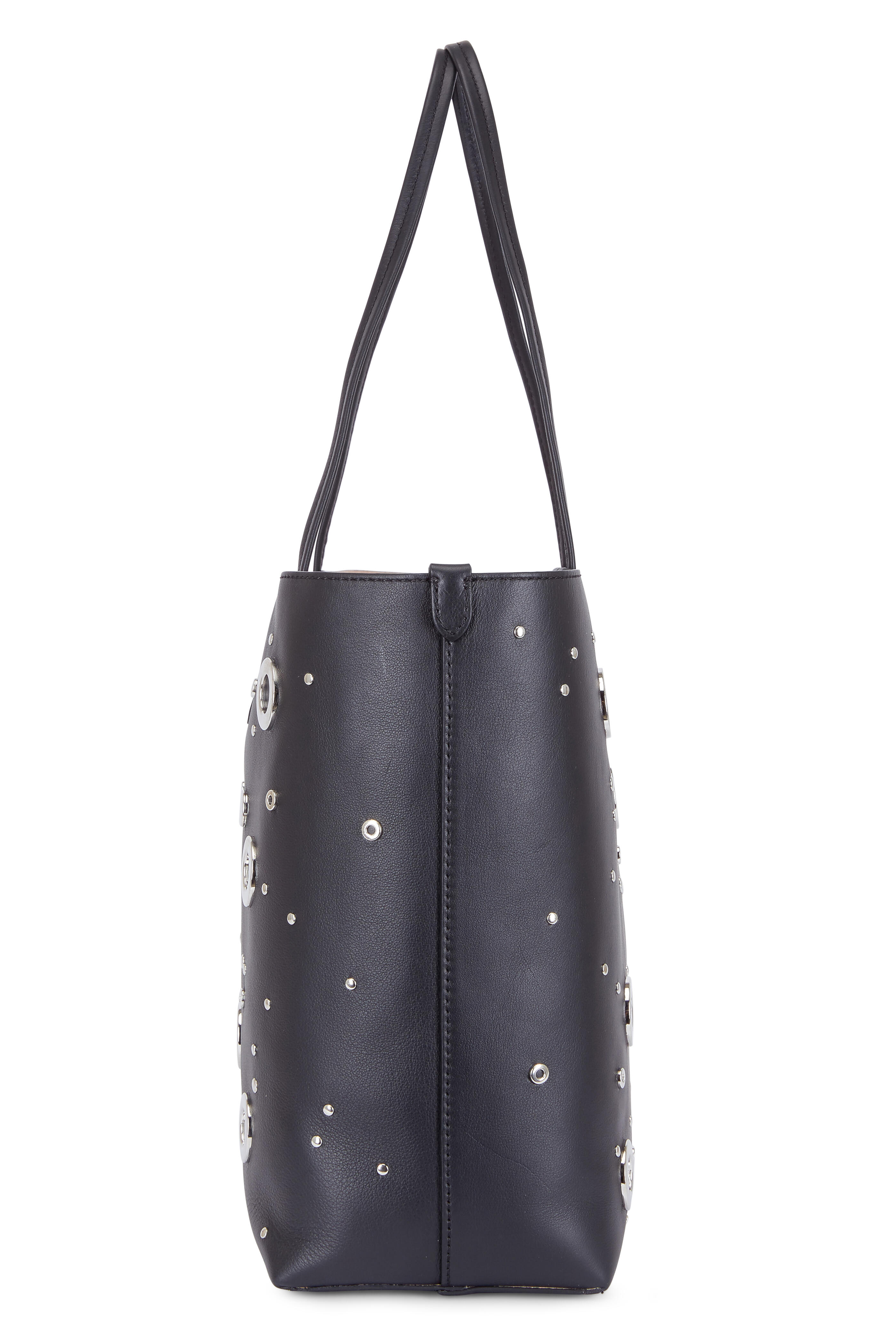 Leather. Dual straps. Snap closure at top. Front and back grommets. Interior zip pocket. Unlined. Made in Italy. Width: 19". Height: 11". Depth: 5 ½". Strap drop: 9".