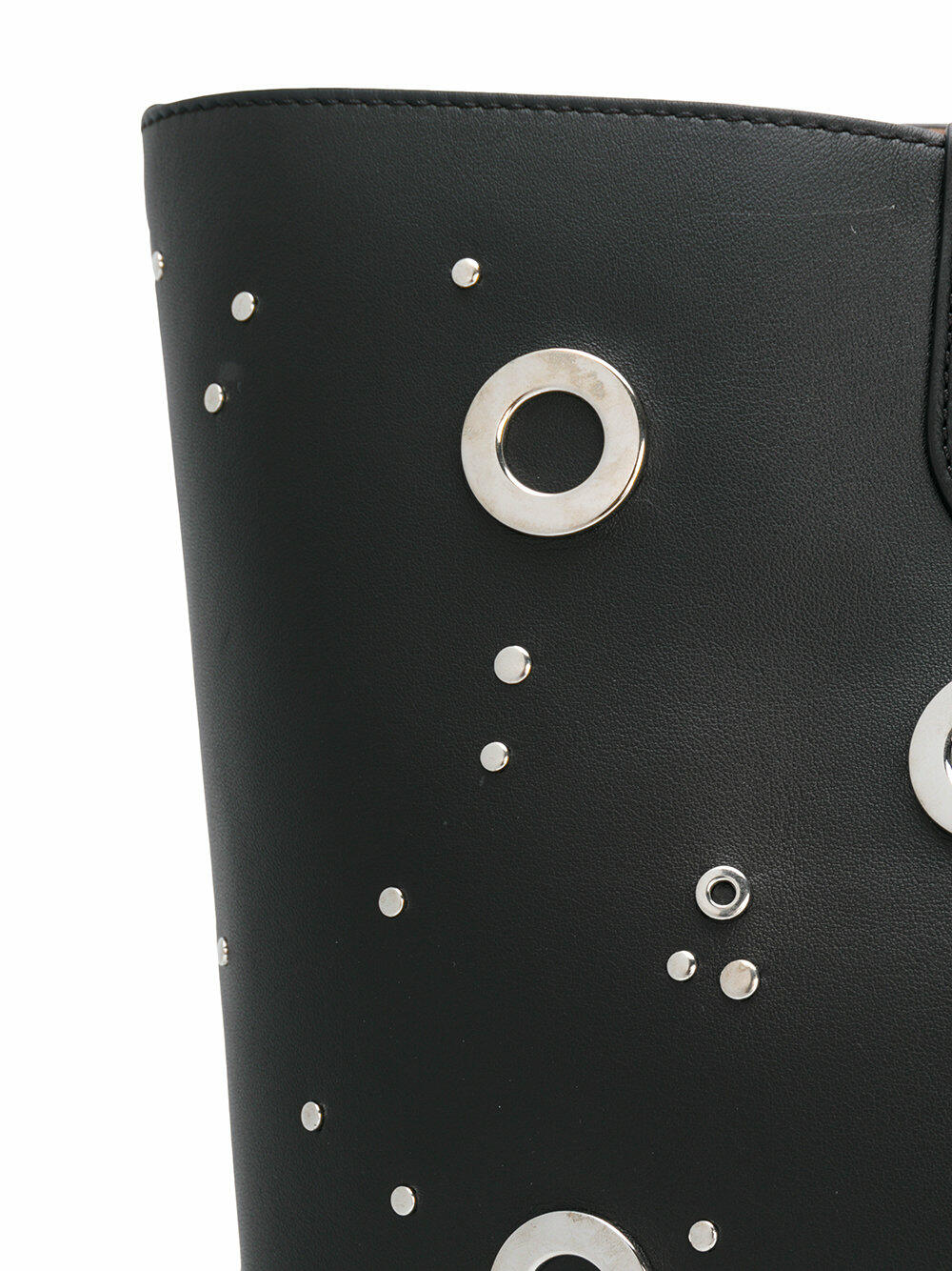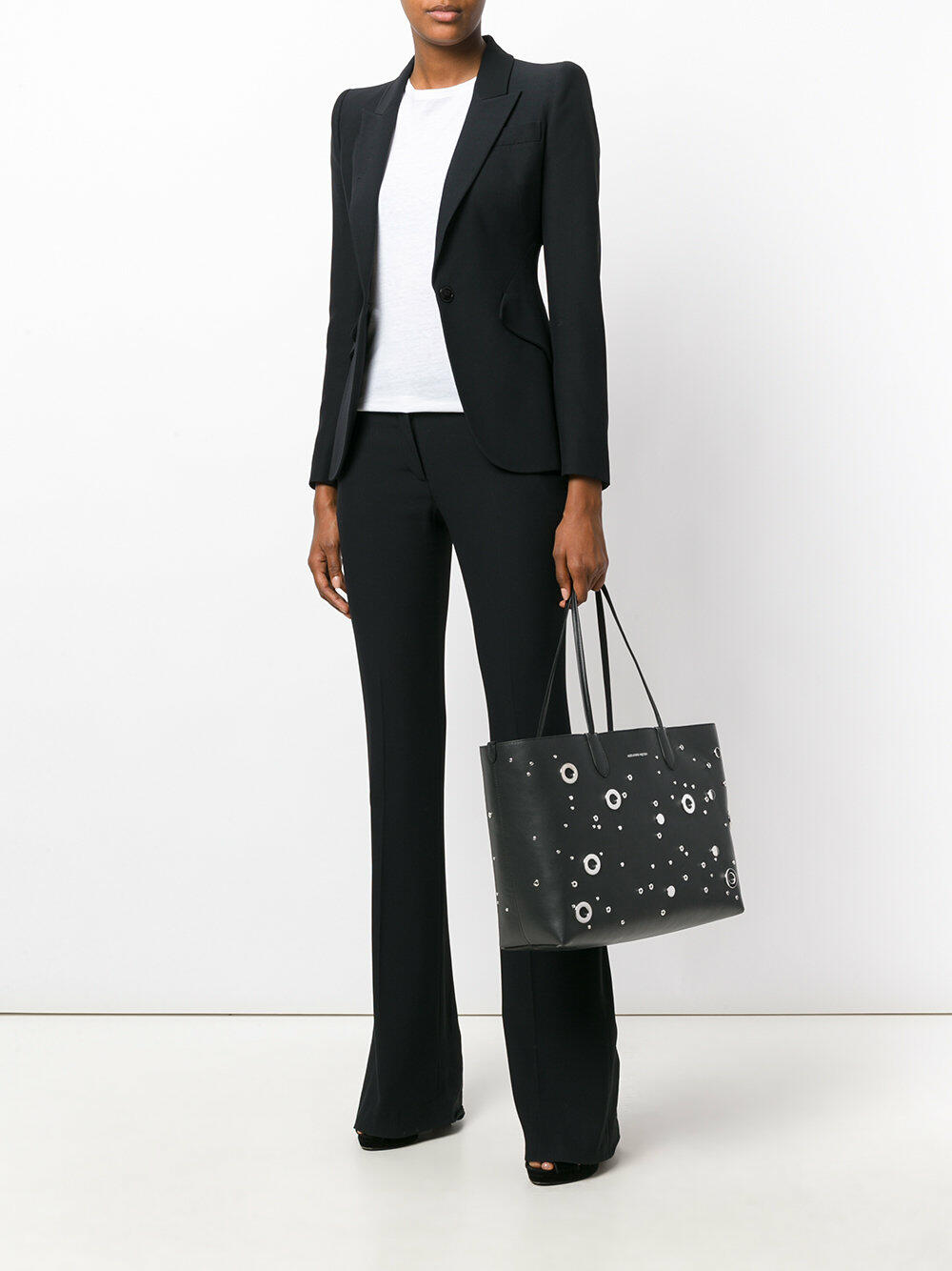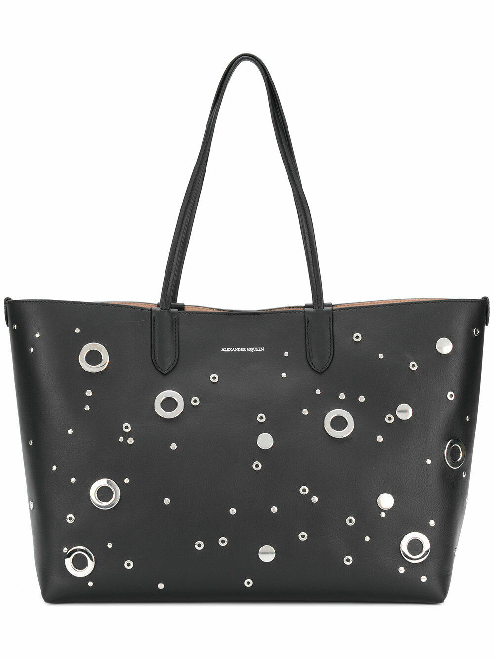 Leather. Dual straps. Snap closure at top. Front and back grommets. Interior zip pocket. Unlined. Made in Italy. Width: 19". Height: 11". Depth: 5 ½". Strap drop: 9".