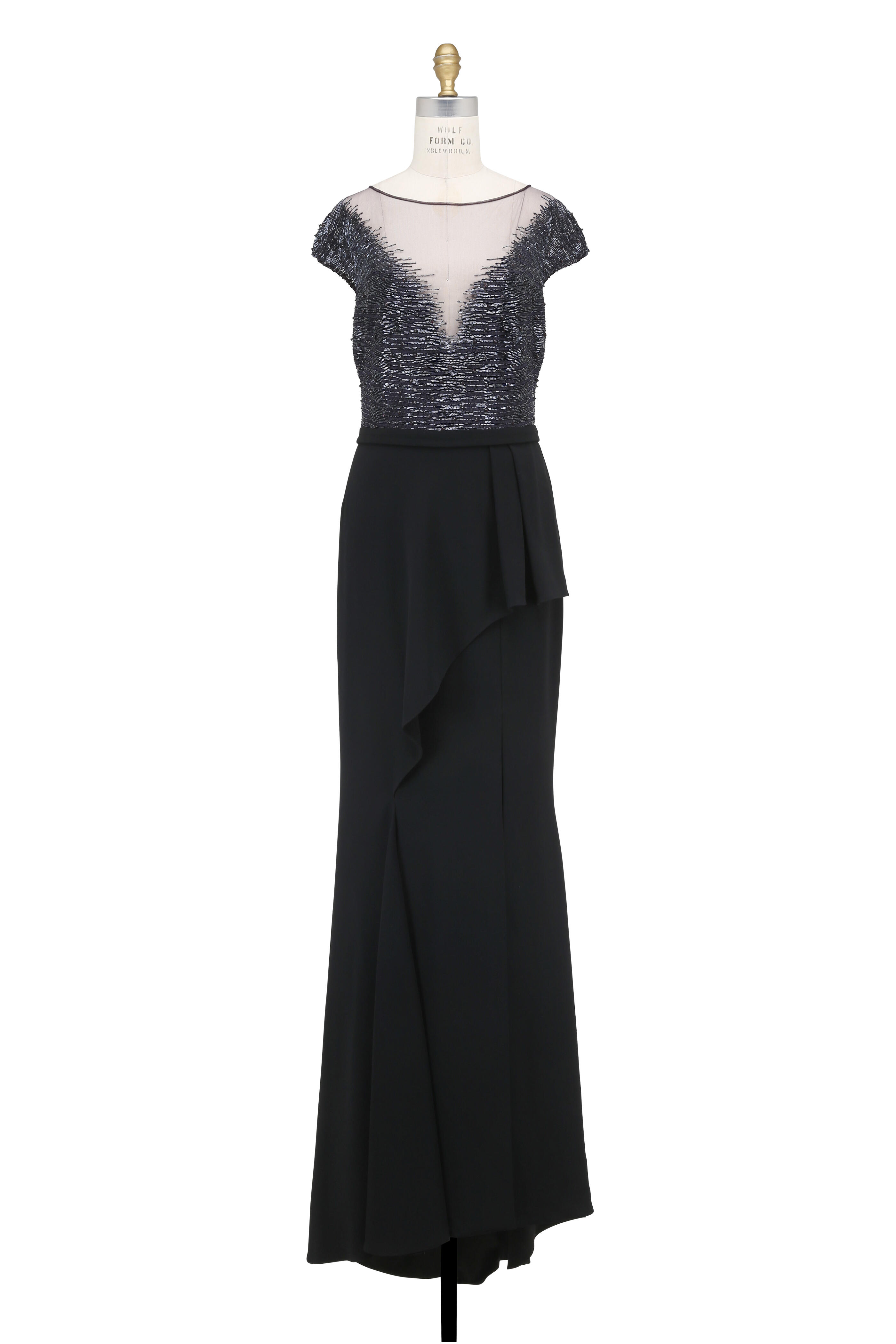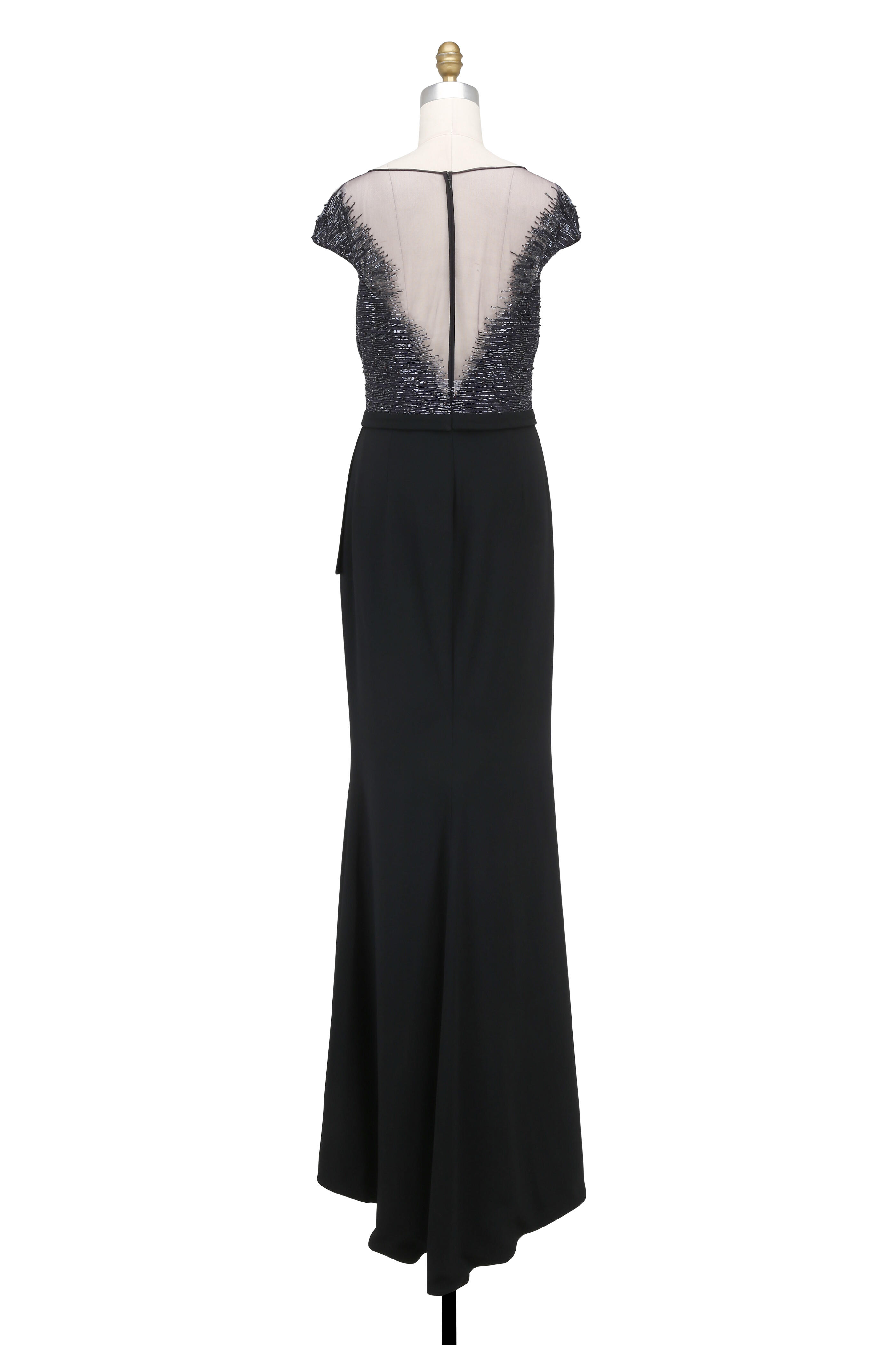 Illusion neckline. Back zip closure. Cap sleeves. High off-center front slit. Asymmetric draping. Made in the USA. 64" shoulder to hem. 52% viscose, 46% acetate, 3% elastane; fabric 2: 100% polyester; lining: 100% silk. Dry clean.