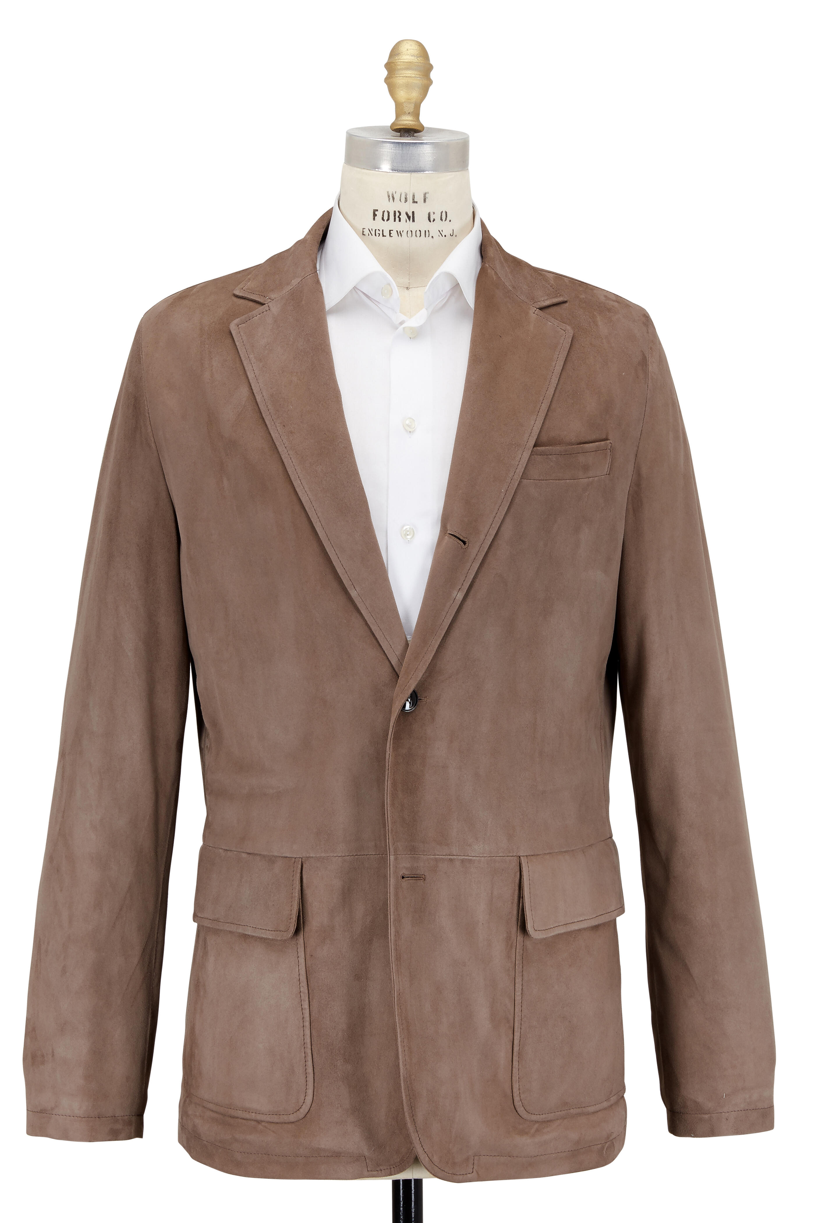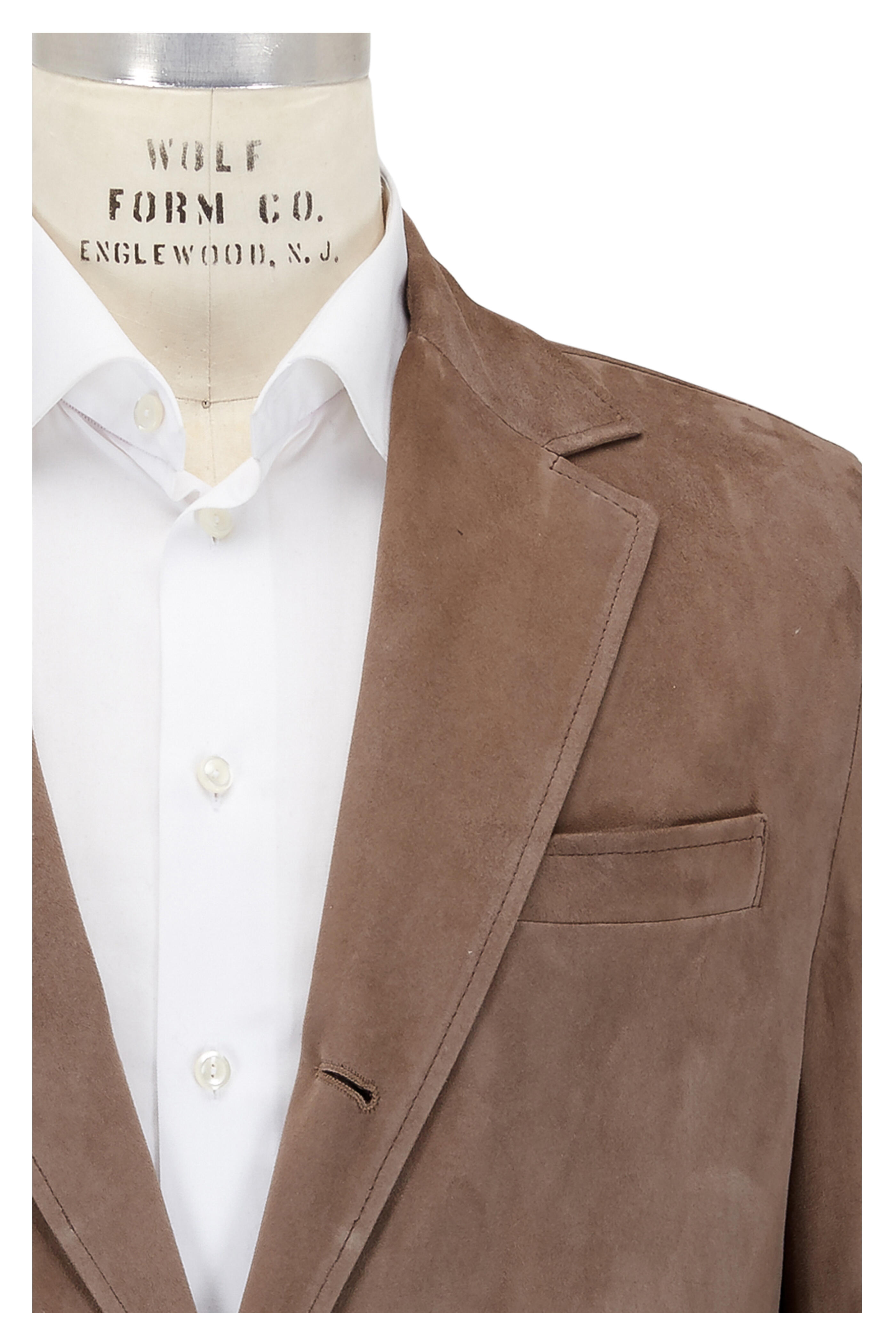 Specialist clean. Notched lapel. Three button closure. Chest welt pocket; waist flap pockets. Vented back. Made in Italy. Lambskin suede; quilted lining: 62% polyester, 38% silk.