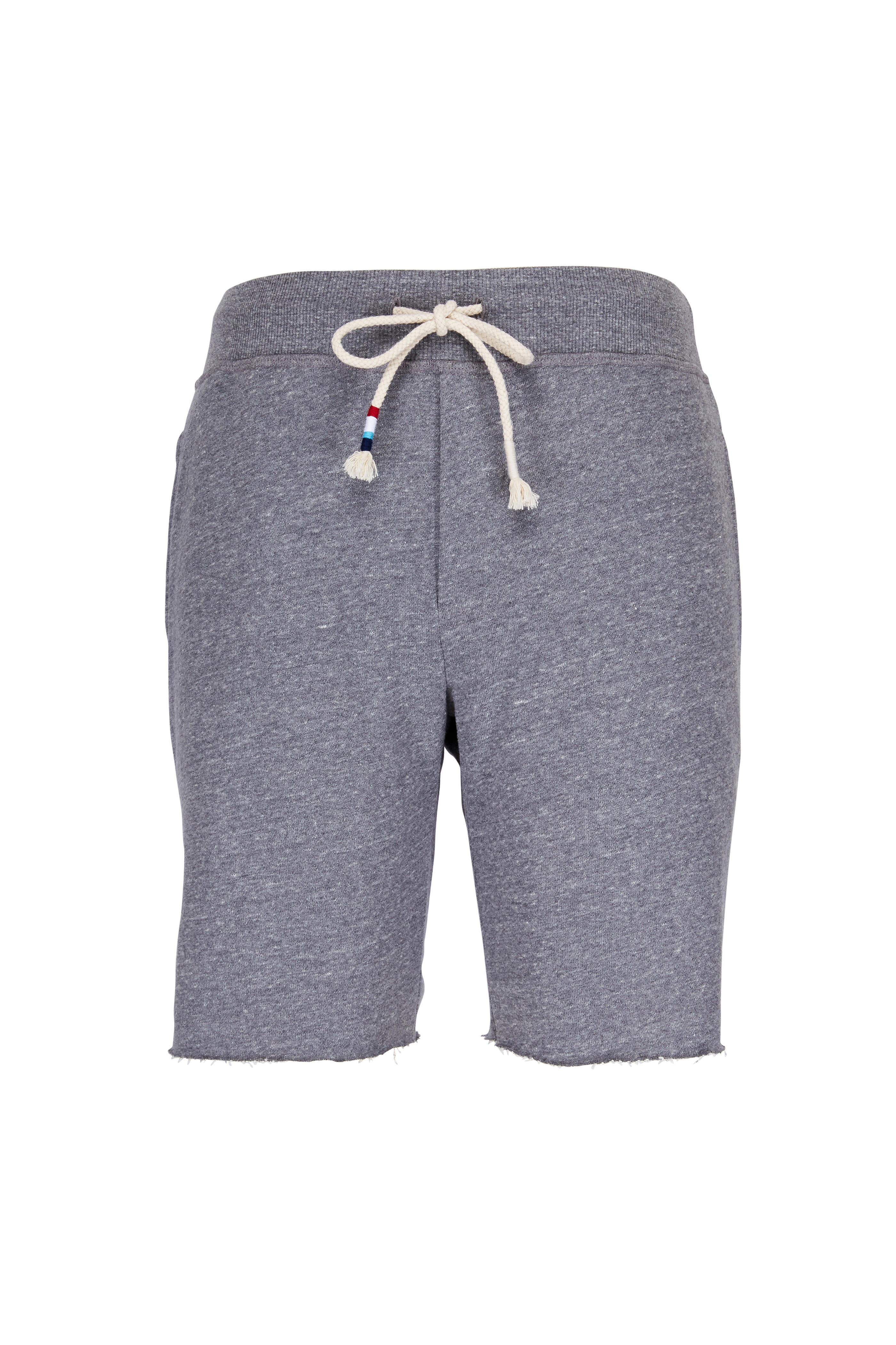 Elastic drawstring waistband. Back patch pocket. Raw edge trim. Made in the USA. Inseam: 9". Length: 20". Leg opening: 22". 58% cotton, 38% polyester, 4% viscose. Machine wash.