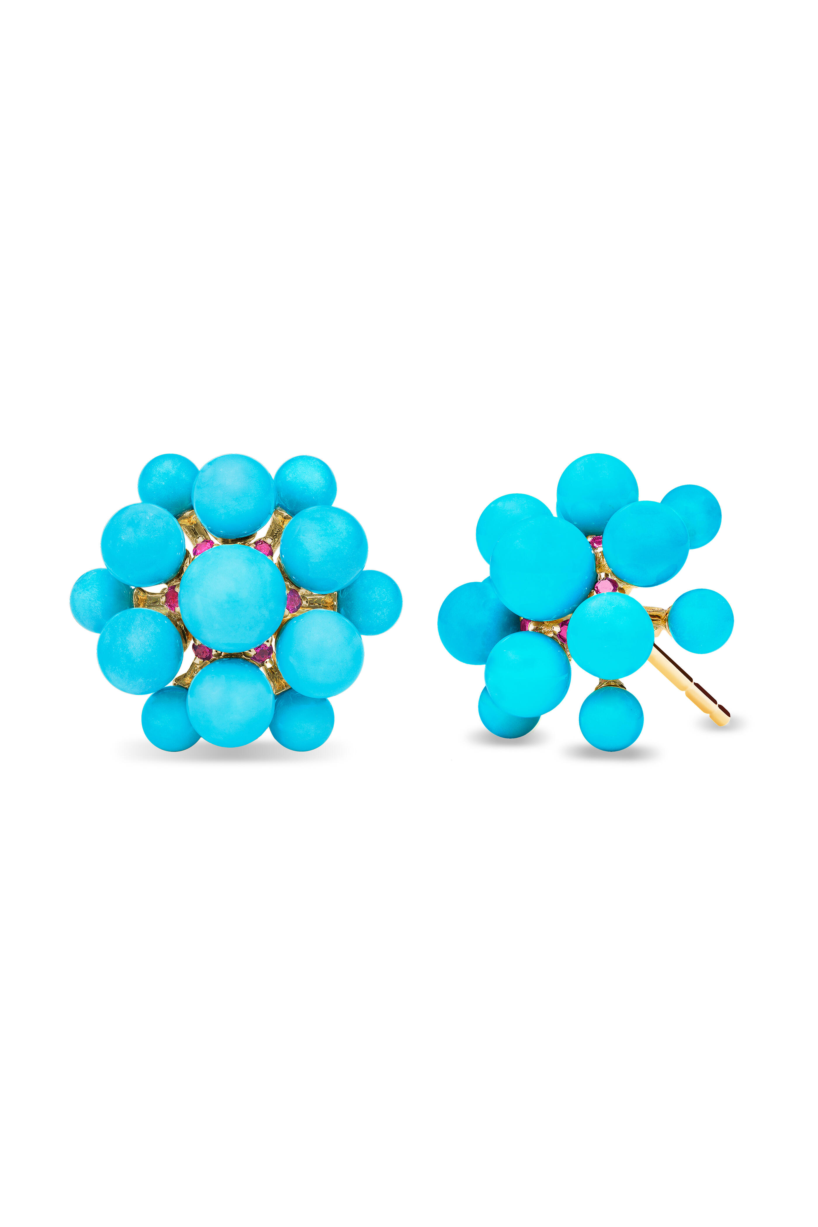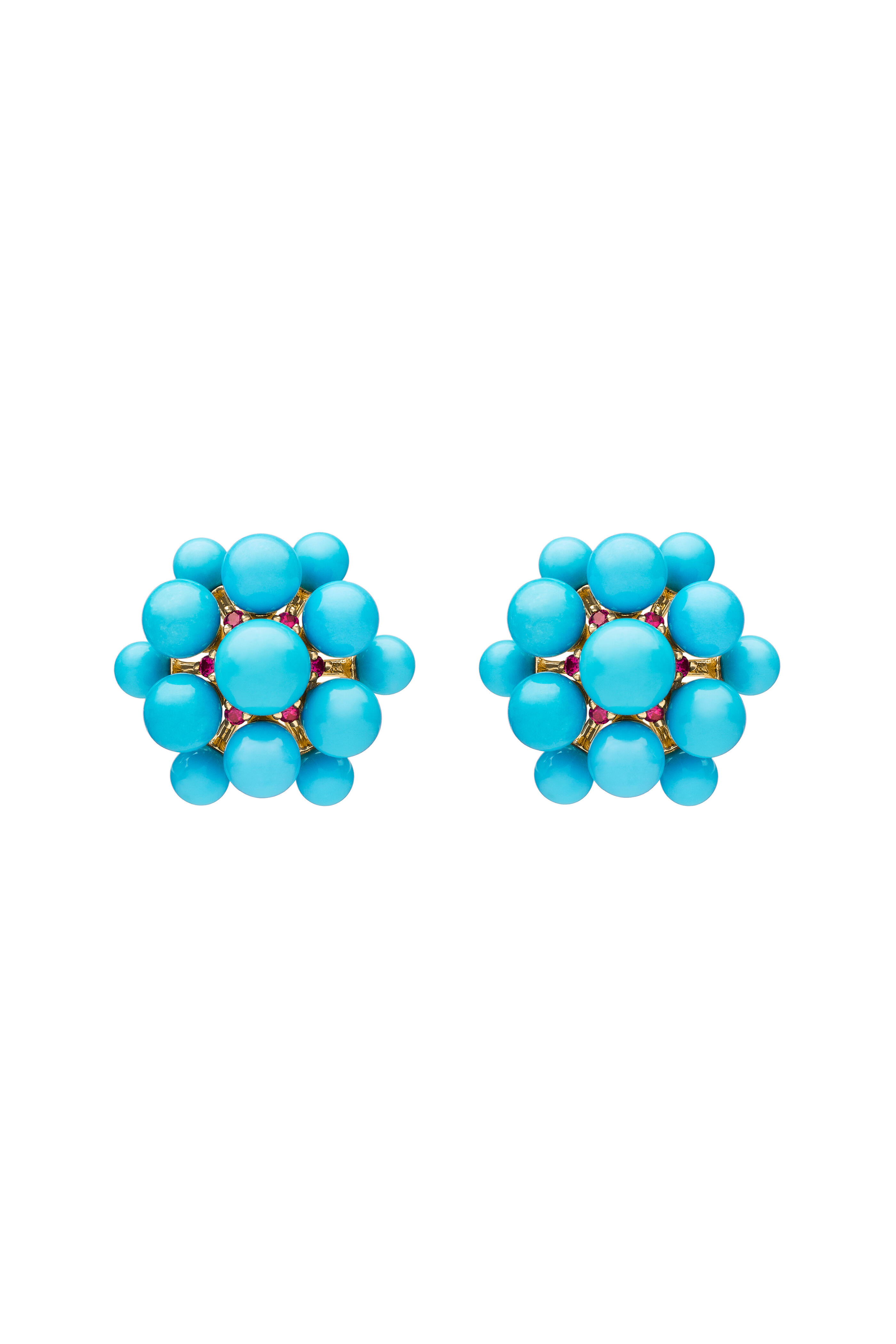 18k yellow gold. .10 carat ruby. 10.48 carat turquoise.