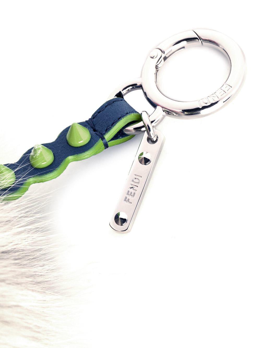 Dyed fox fur with leather trim. Logo-etched key ring. Scalloped blue leather strap with contrast lime stud detail. Heart intarsia detail. Made in Italy. Width: 5". Length: 5".