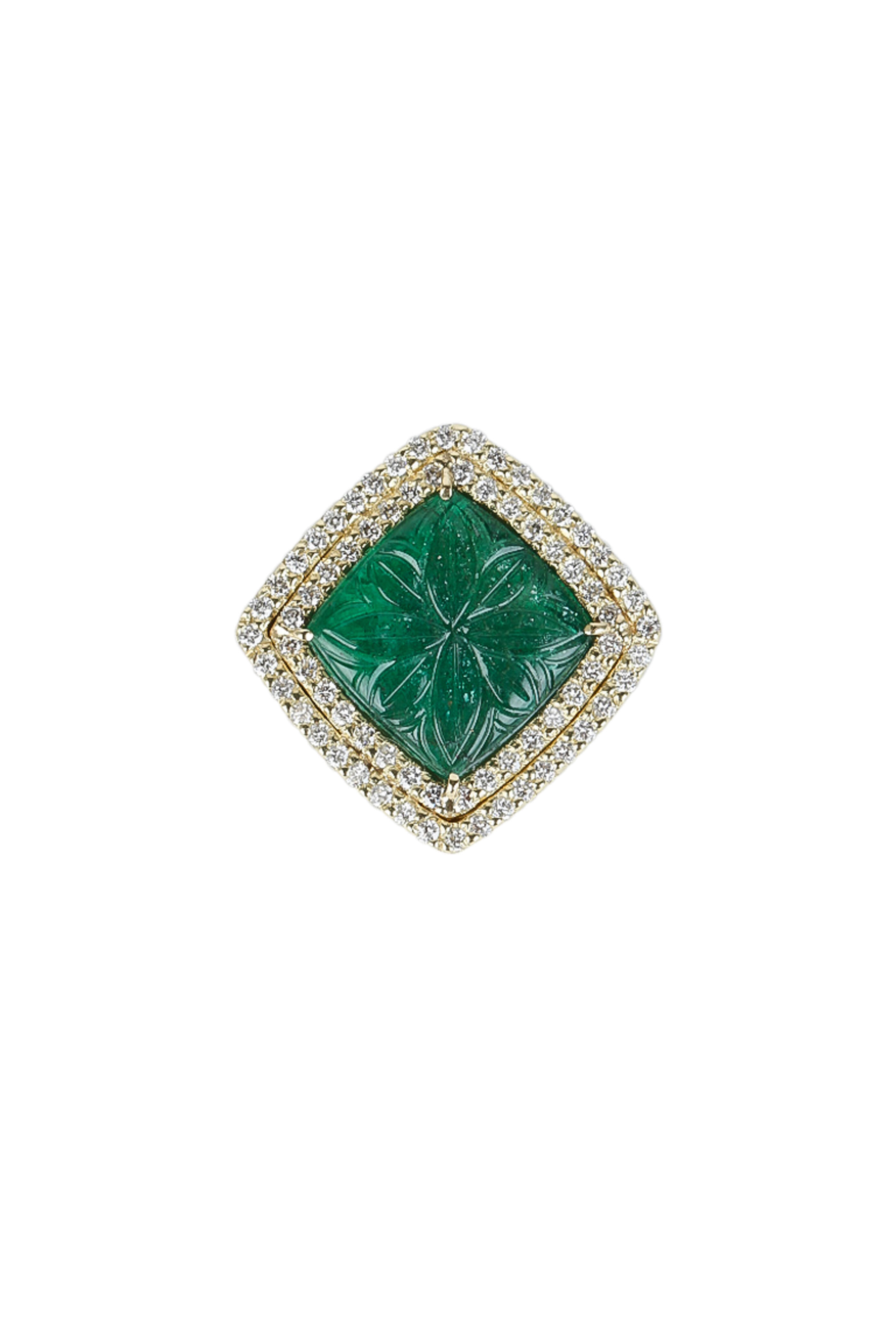 18K yellow gold. Carved emerald, 5.90 total carat weight. Diamonds, 1.08 total carat weight.