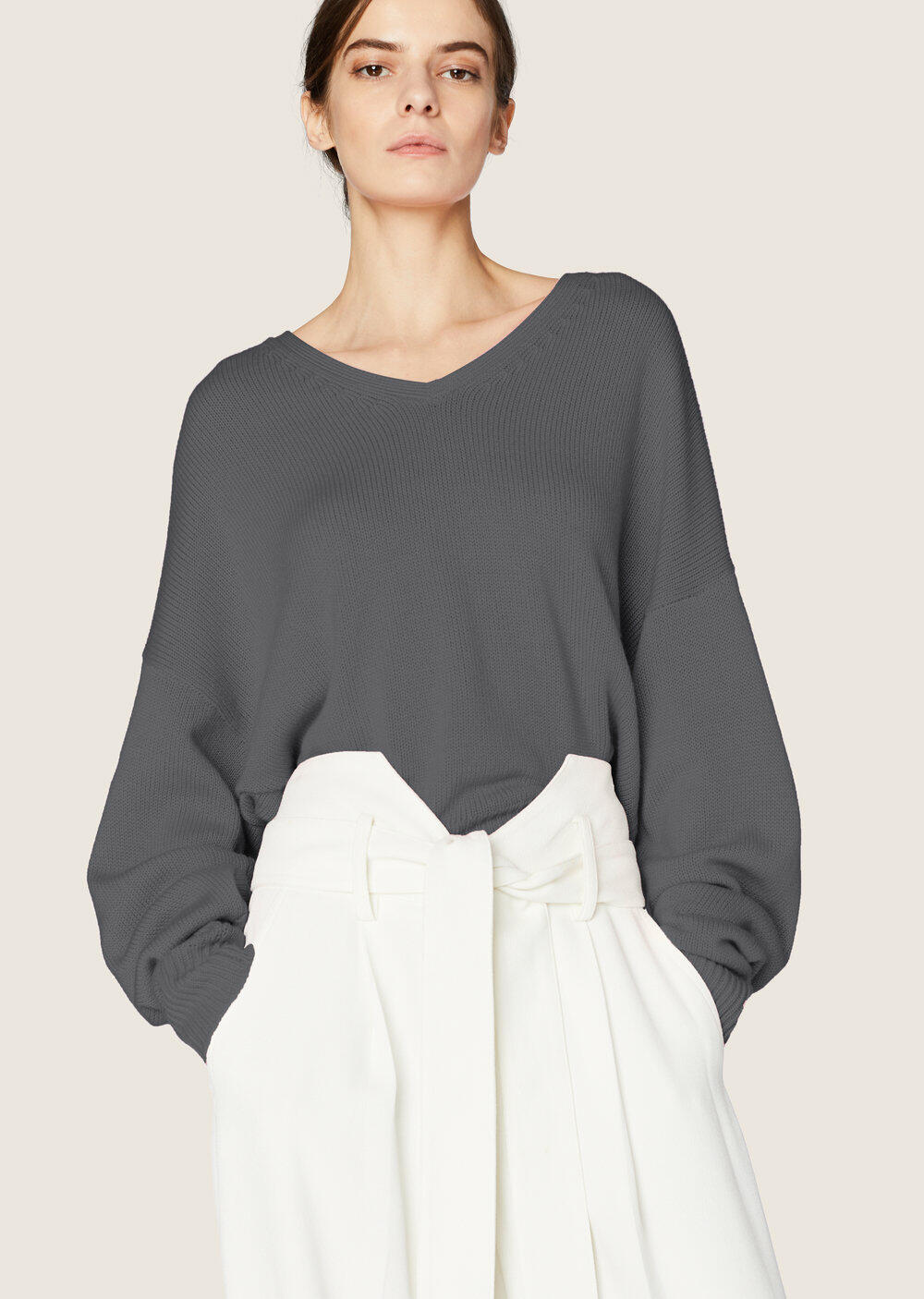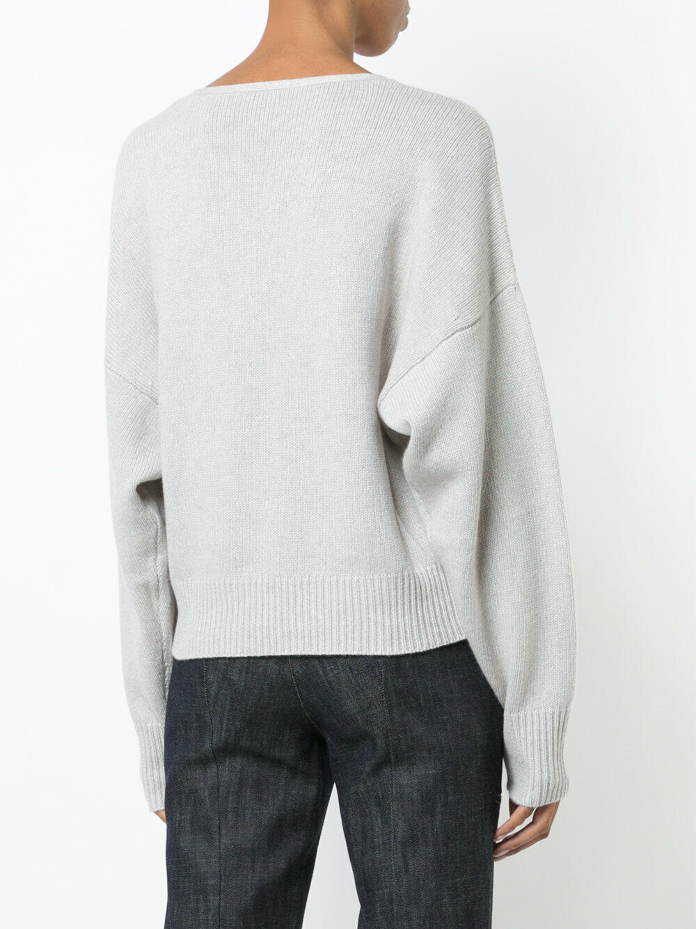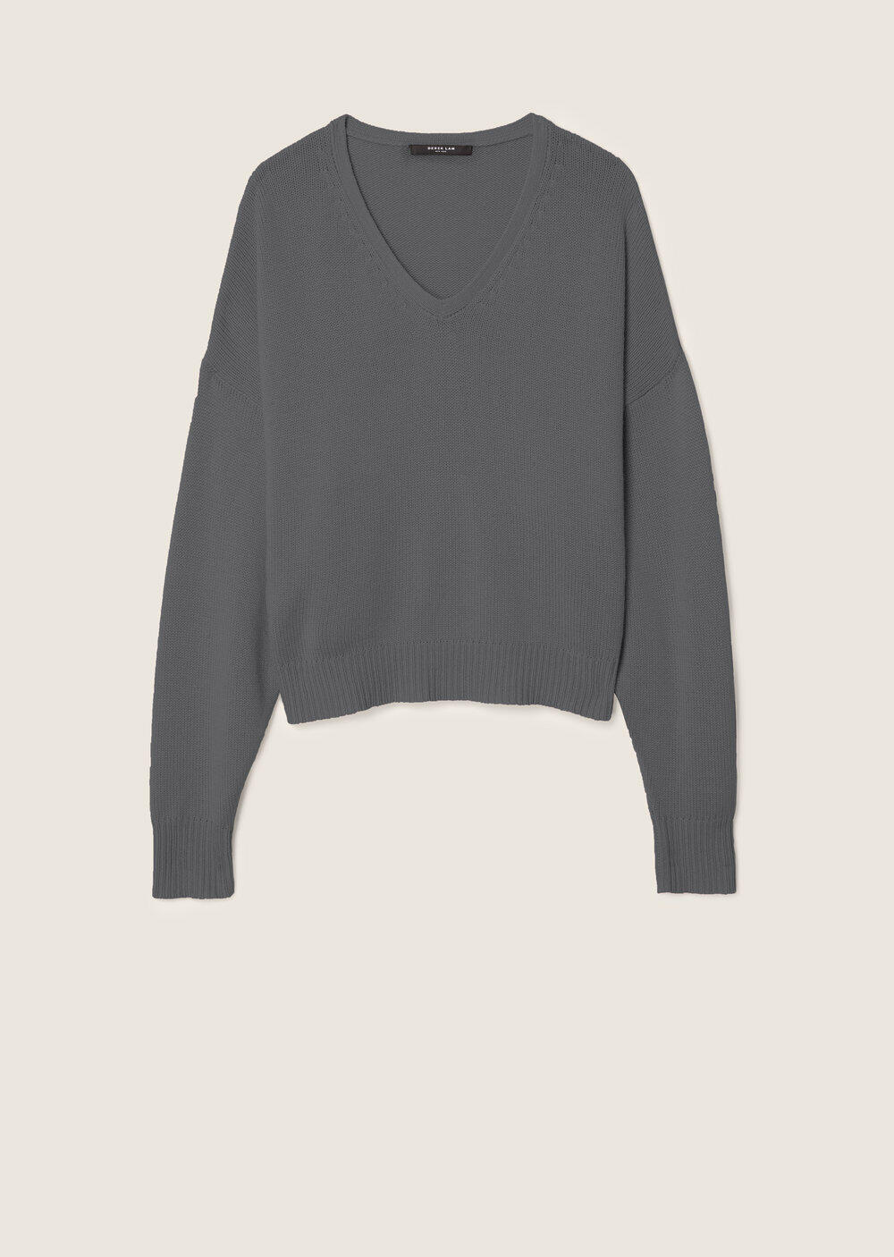 V-neckline. Drop shoulders. Ribbed hem and cuffs. Imported with Italian yarn. 64% cashmere, 36% cotton. Dry clean.