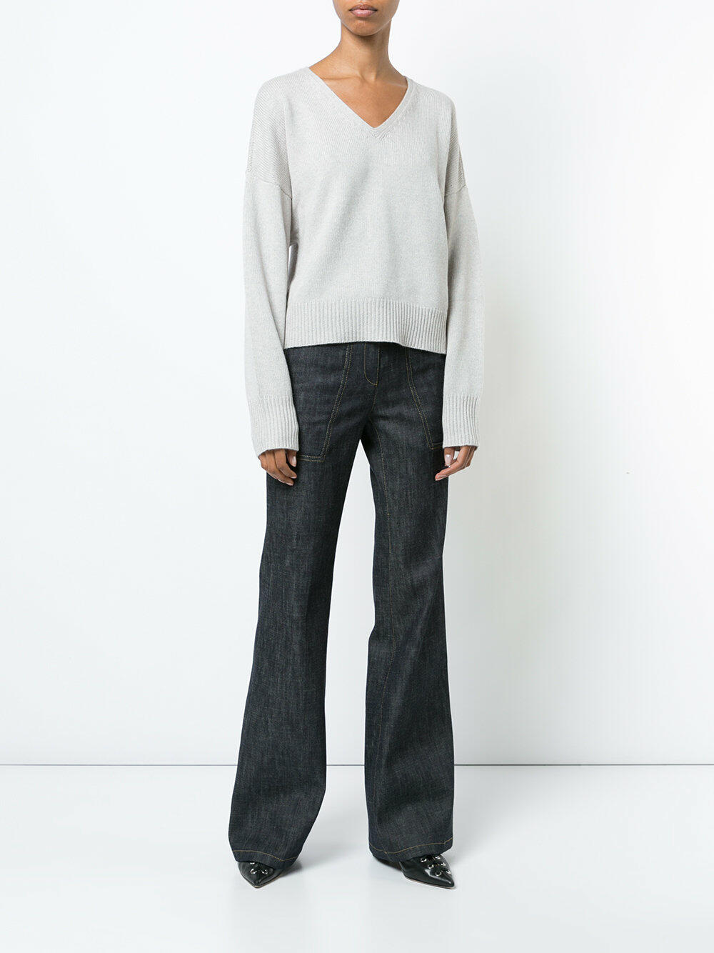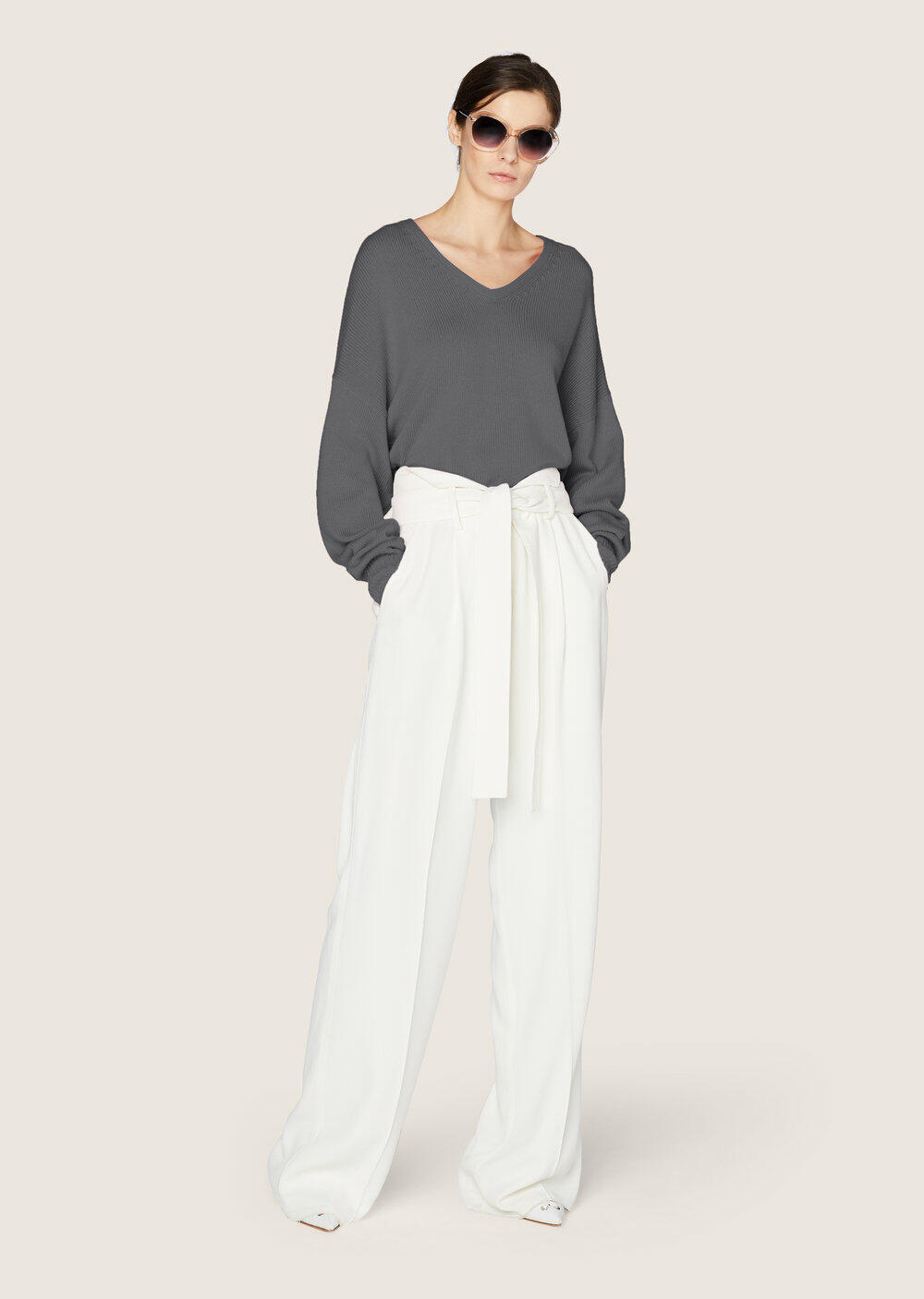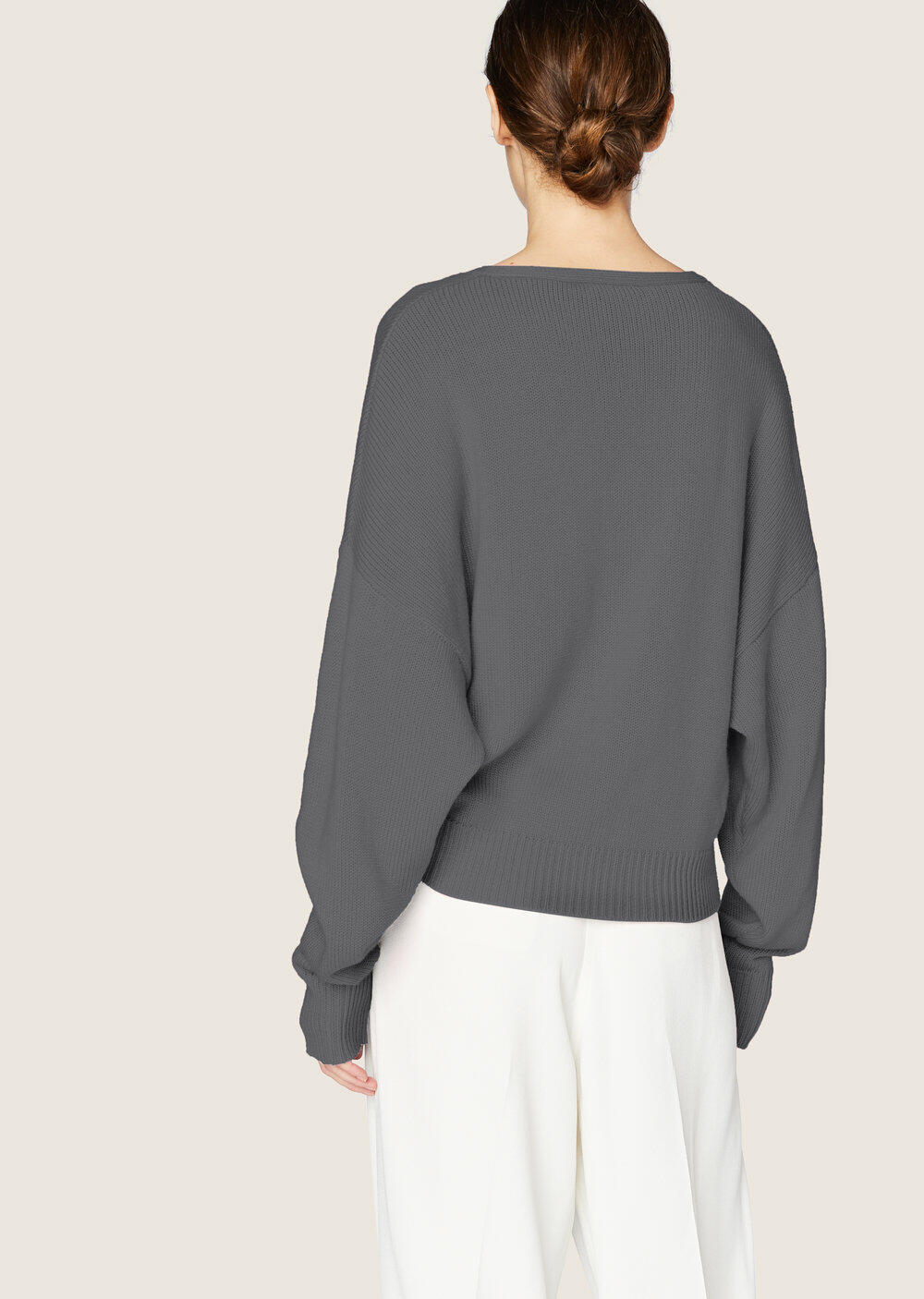 V-neckline. Drop shoulders. Ribbed hem and cuffs. Imported with Italian yarn. 64% cashmere, 36% cotton. Dry clean.