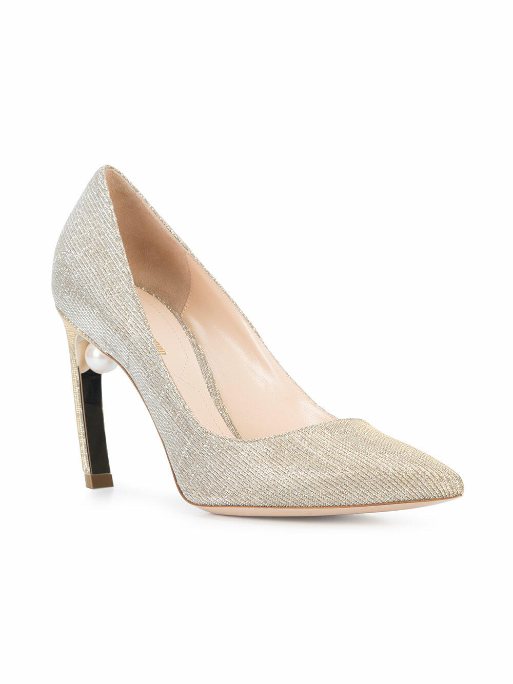 Lurex fabric upper. Pointed toe. Leather lining and insole. Curved heel with gold metal and pearl inset. Leather sole. Made in Italy. Heel measurement: 90mm (3 ½").