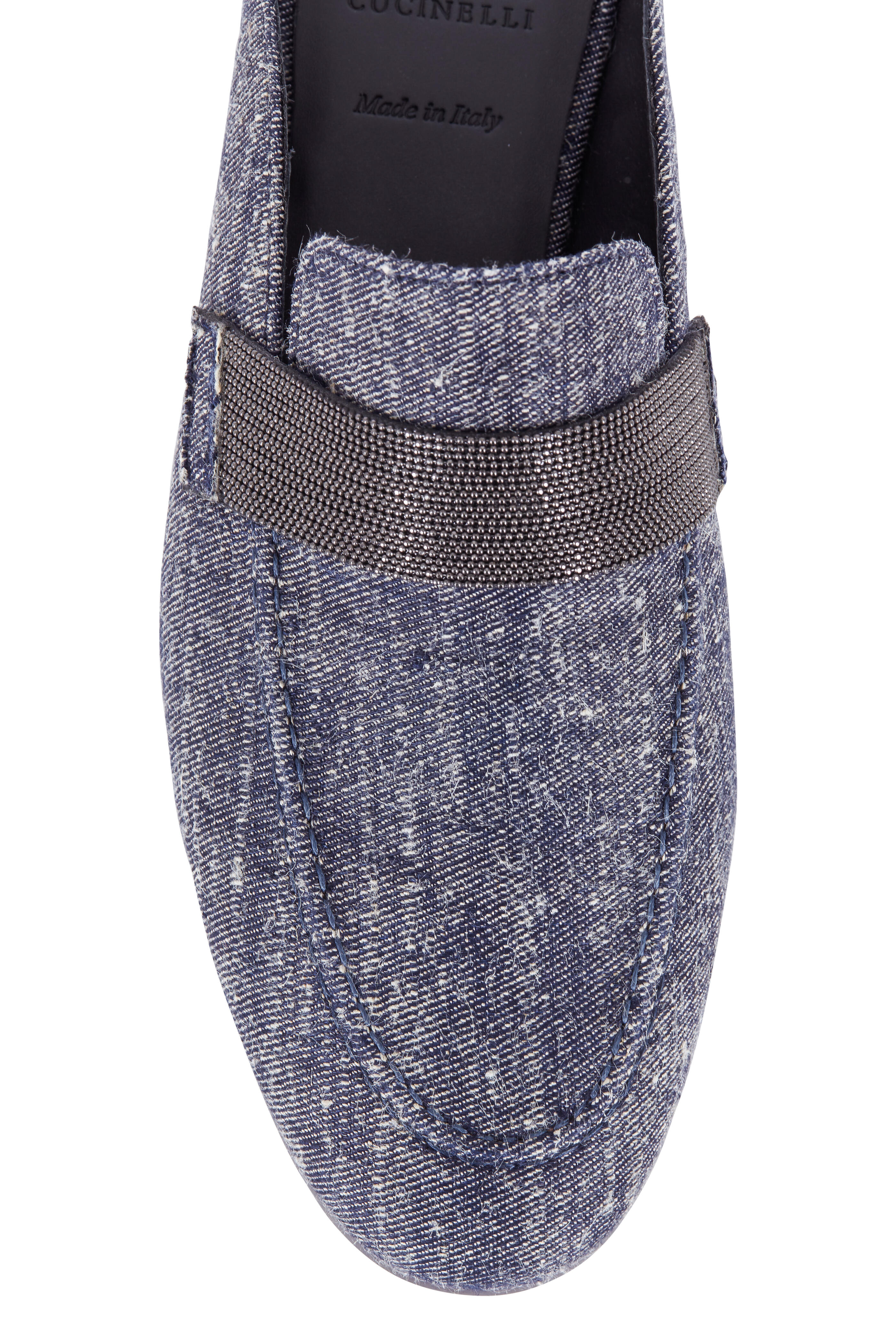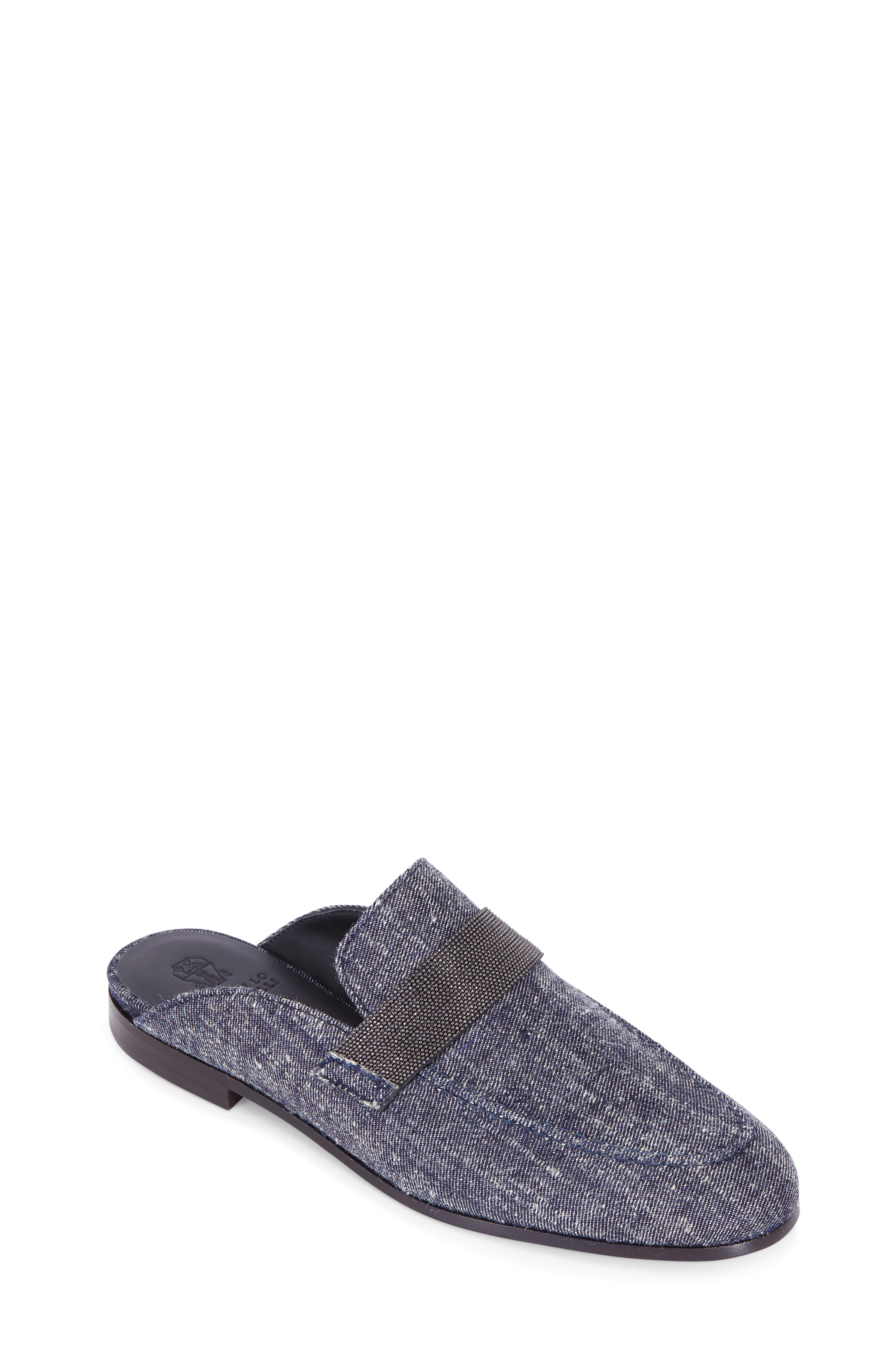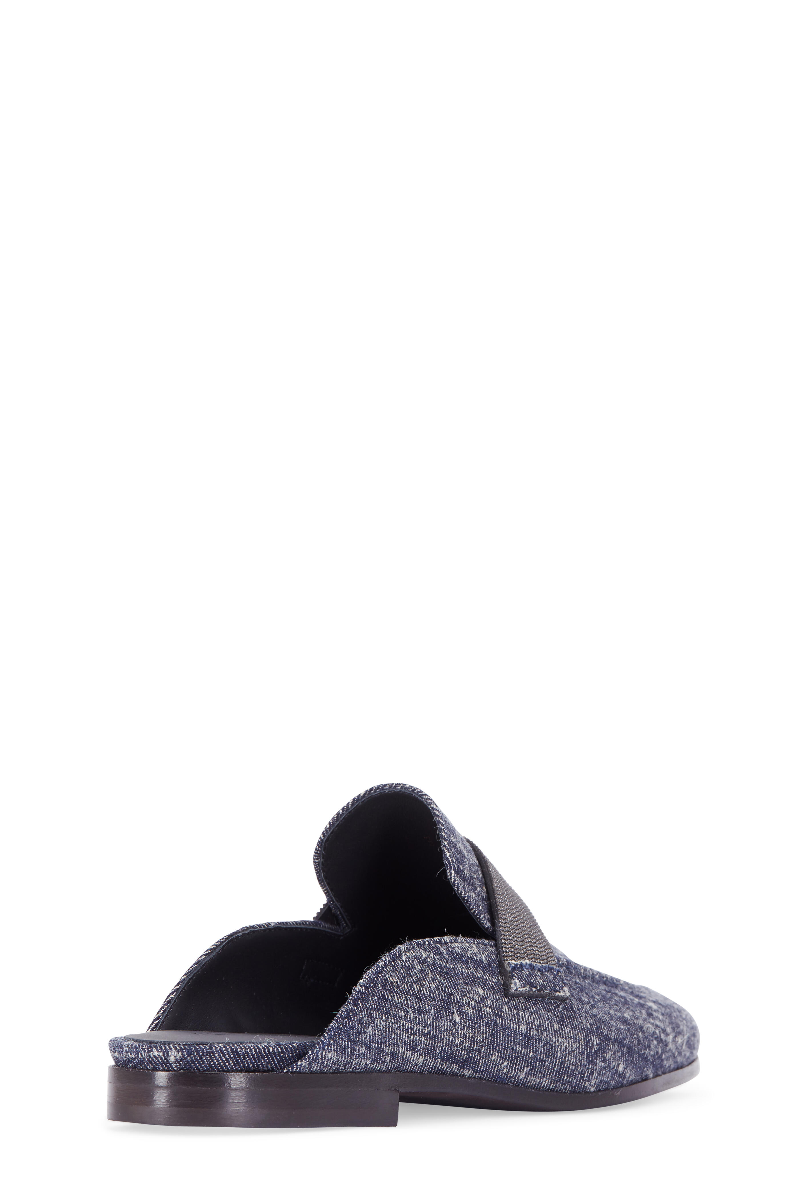 Denim fabric upper. Apron toe. Monili beading across vamp. Leather lining and insole. Leather sole. Made in Italy.