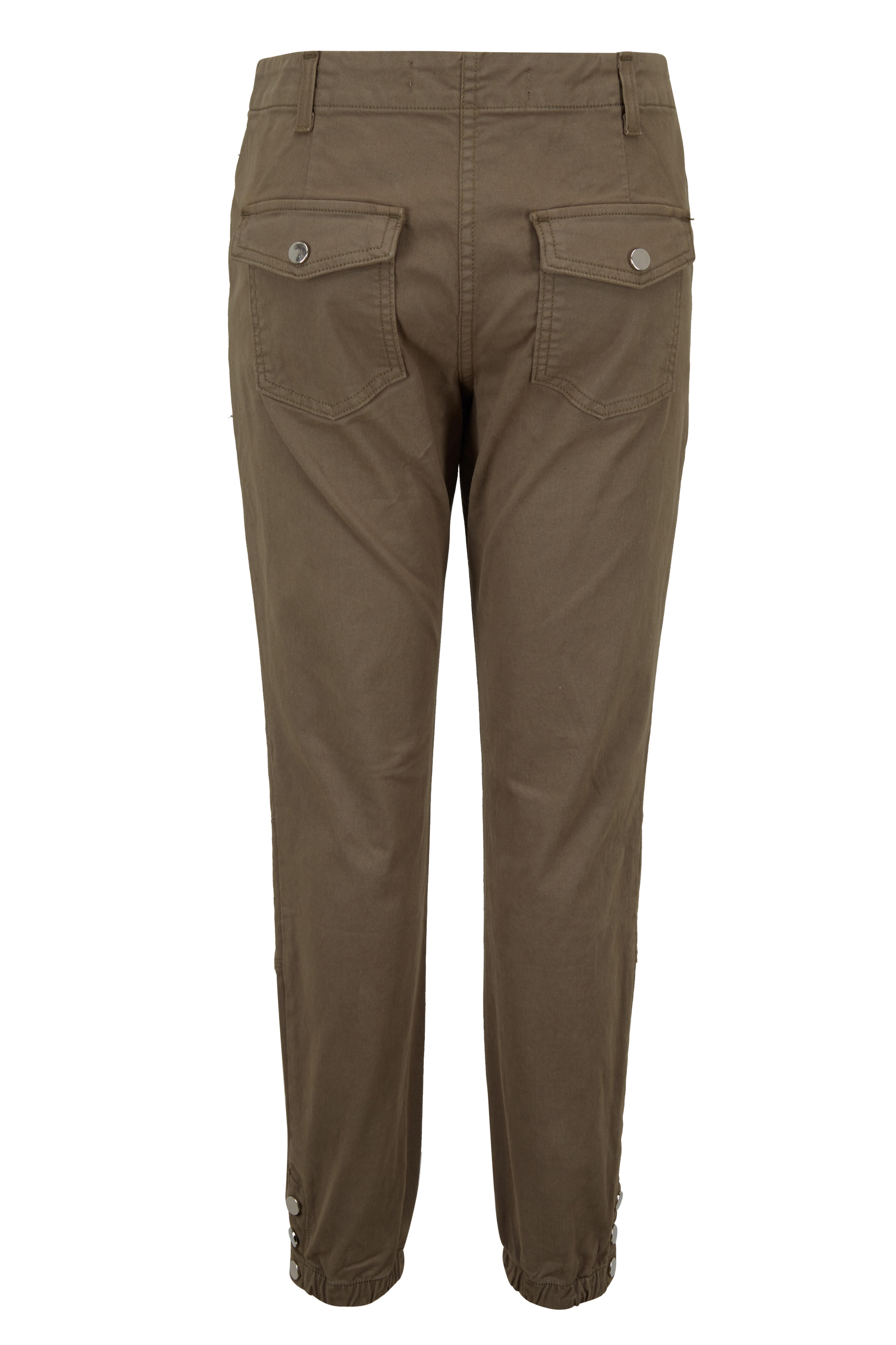 Banded waist; belt loops. Side slip pockets, back snap flap pockets. Elasticized cuffs. Made in the USA. 9½" rise. 26" inseam. 98% cotton, 2% elastane. Machine wash.