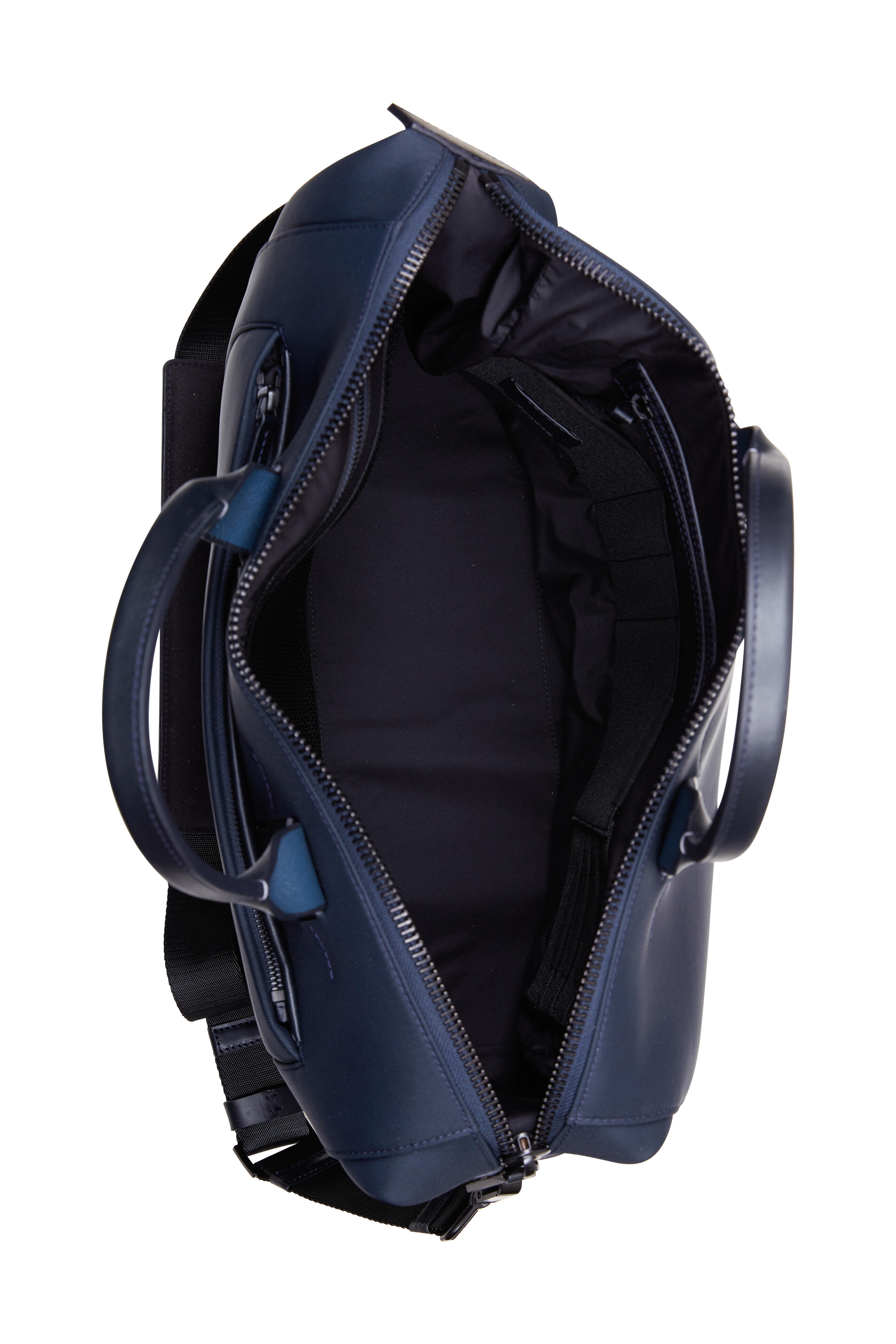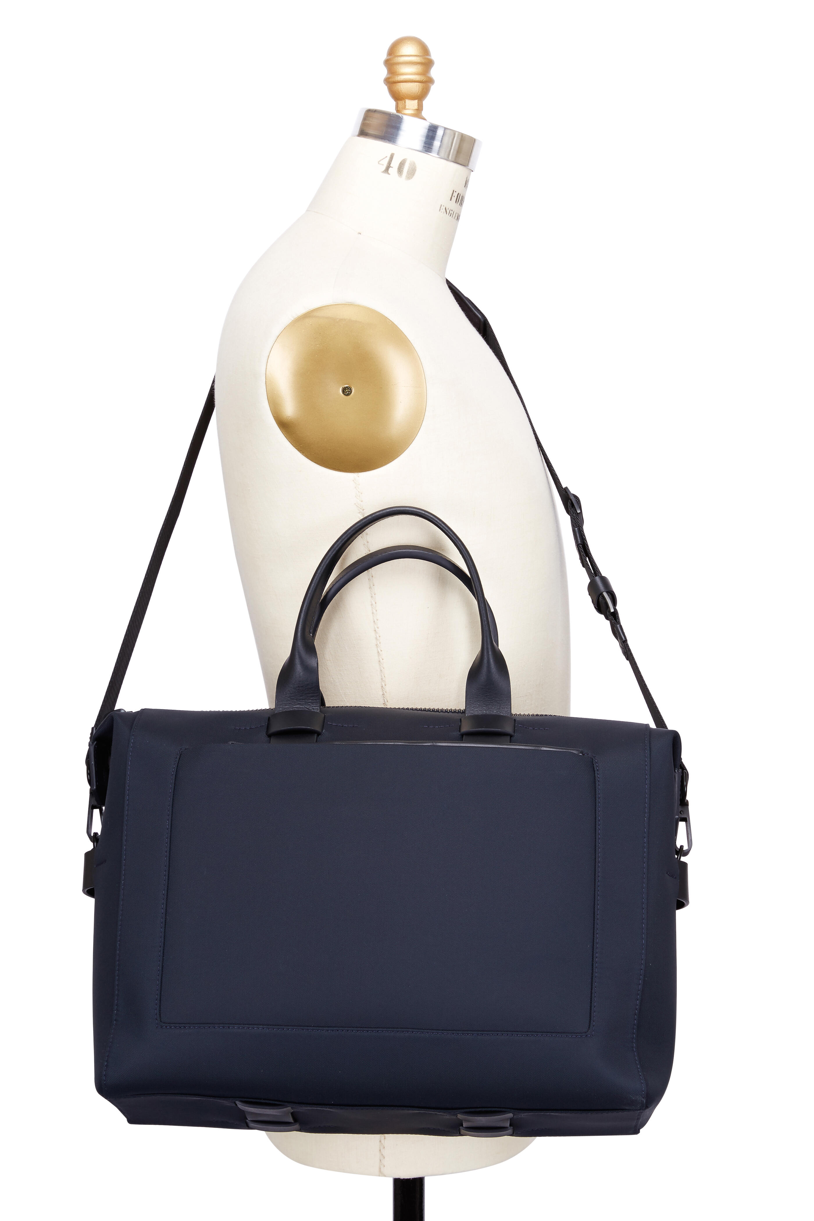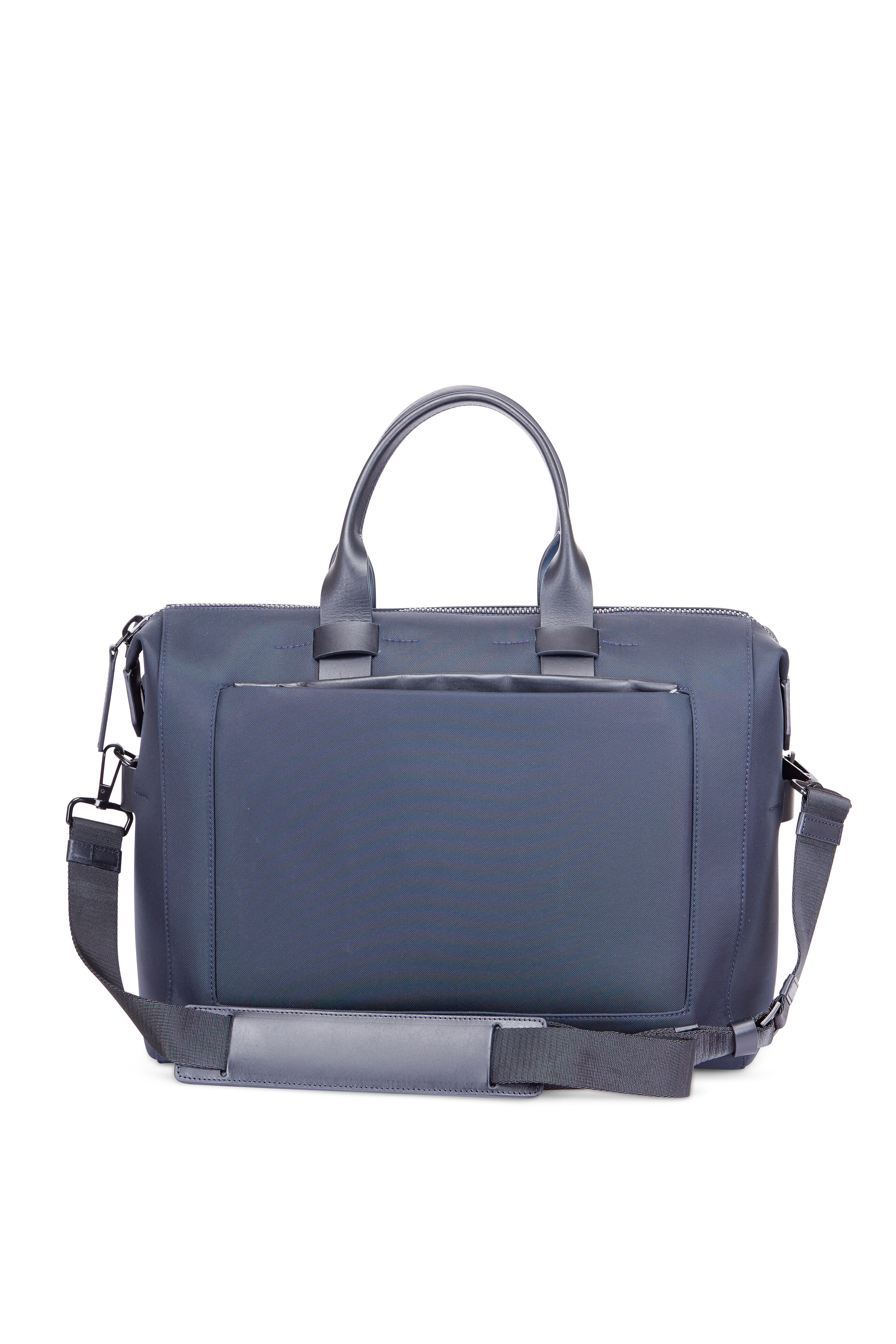 Coated canvas and leather. Rolled top handles. Detachable and adjustable strap. Top zip closure. Two exterior zip pockets. One interior large mesh and one zip pocket. Interior organizational pocket. Fully lined. Imported. Width: 16". Height: 12". Depth: 7".