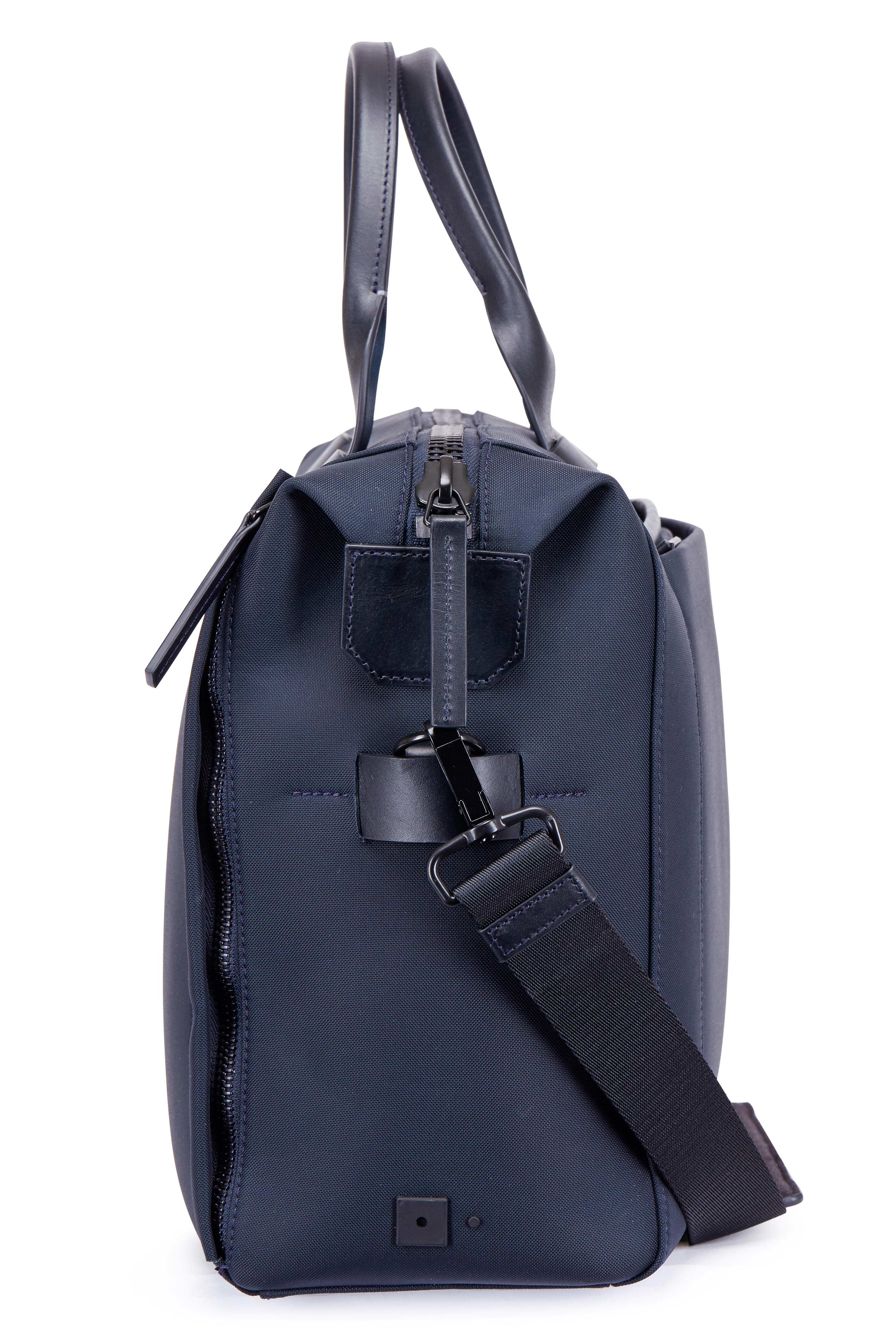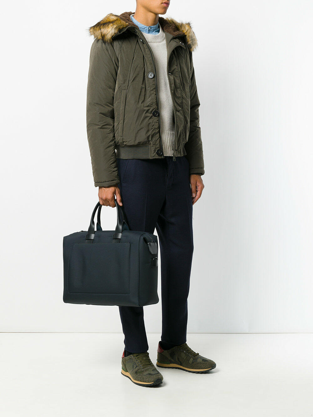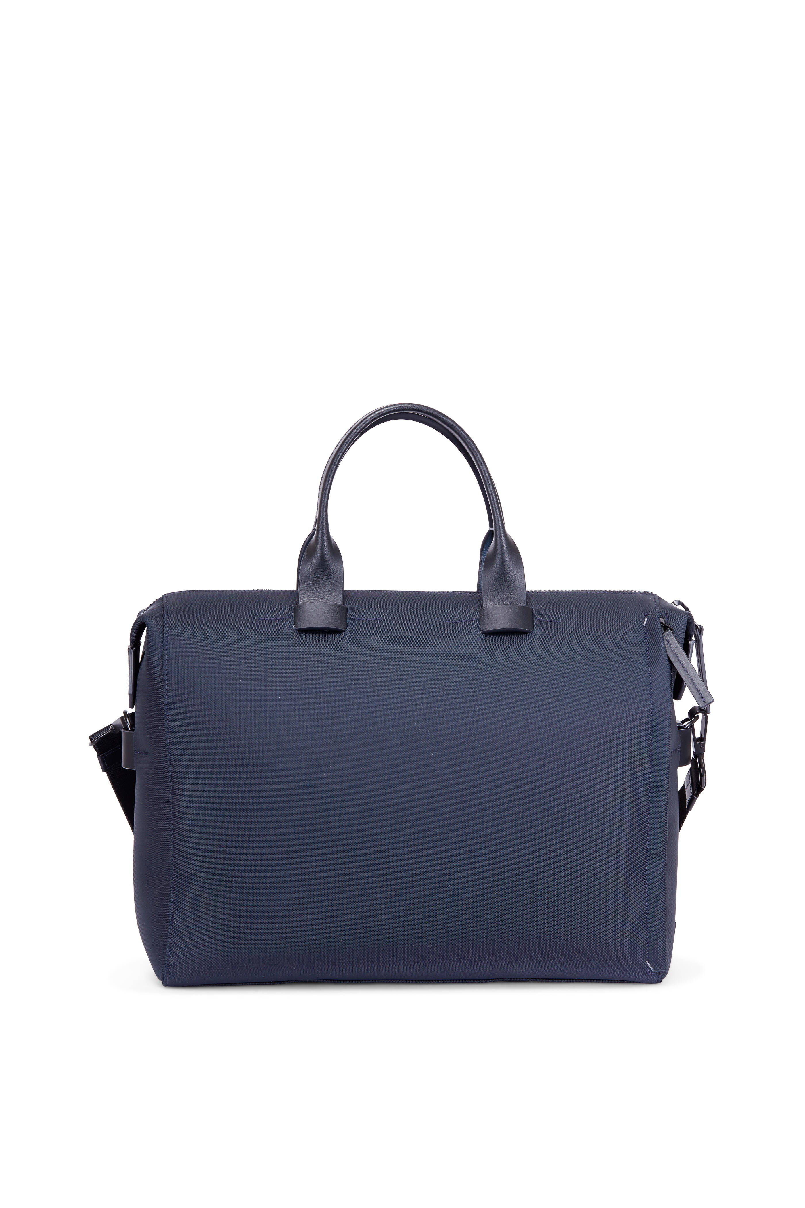 Coated canvas and leather. Rolled top handles. Detachable and adjustable strap. Top zip closure. Two exterior zip pockets. One interior large mesh and one zip pocket. Interior organizational pocket. Fully lined. Imported. Width: 16". Height: 12". Depth: 7".