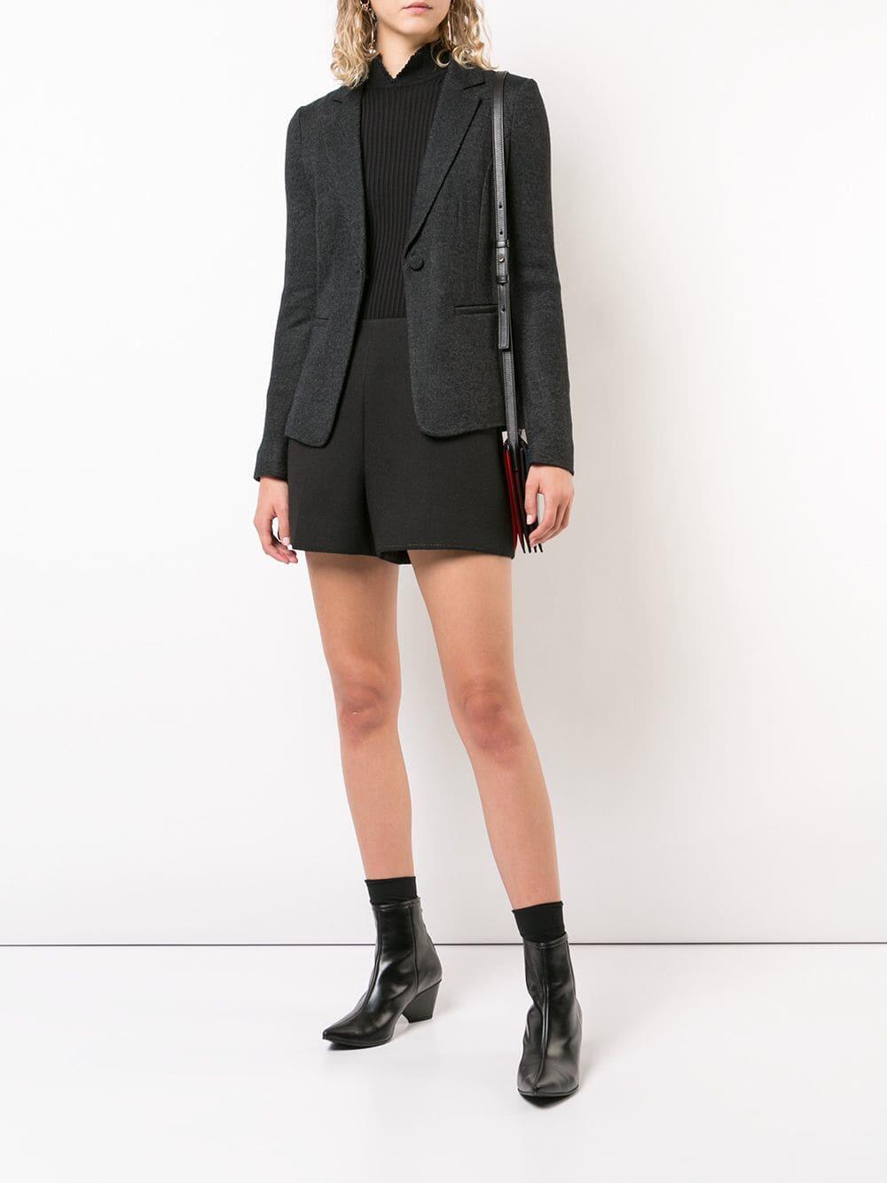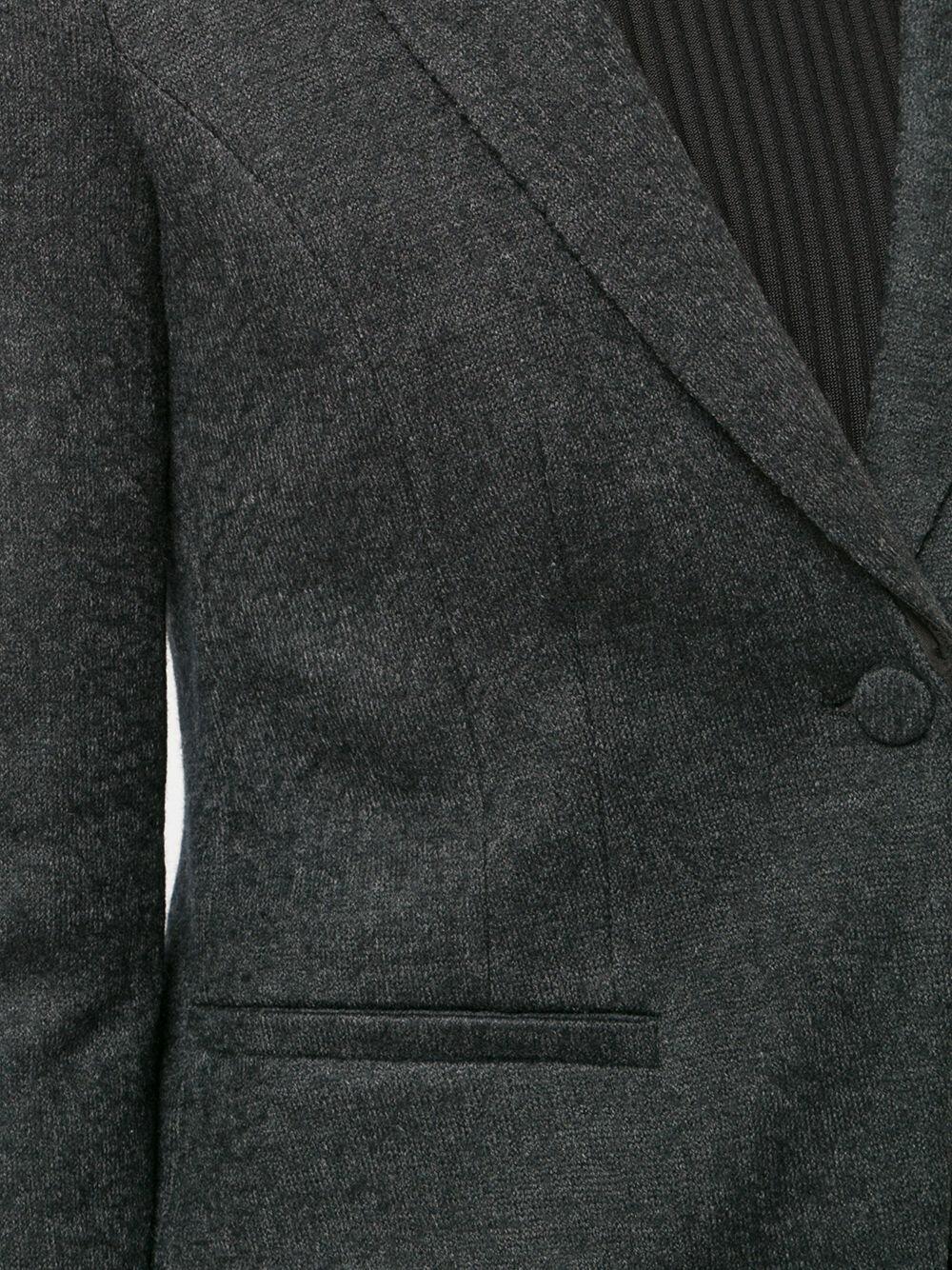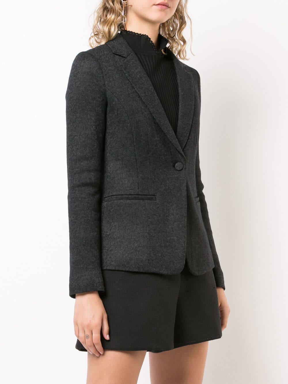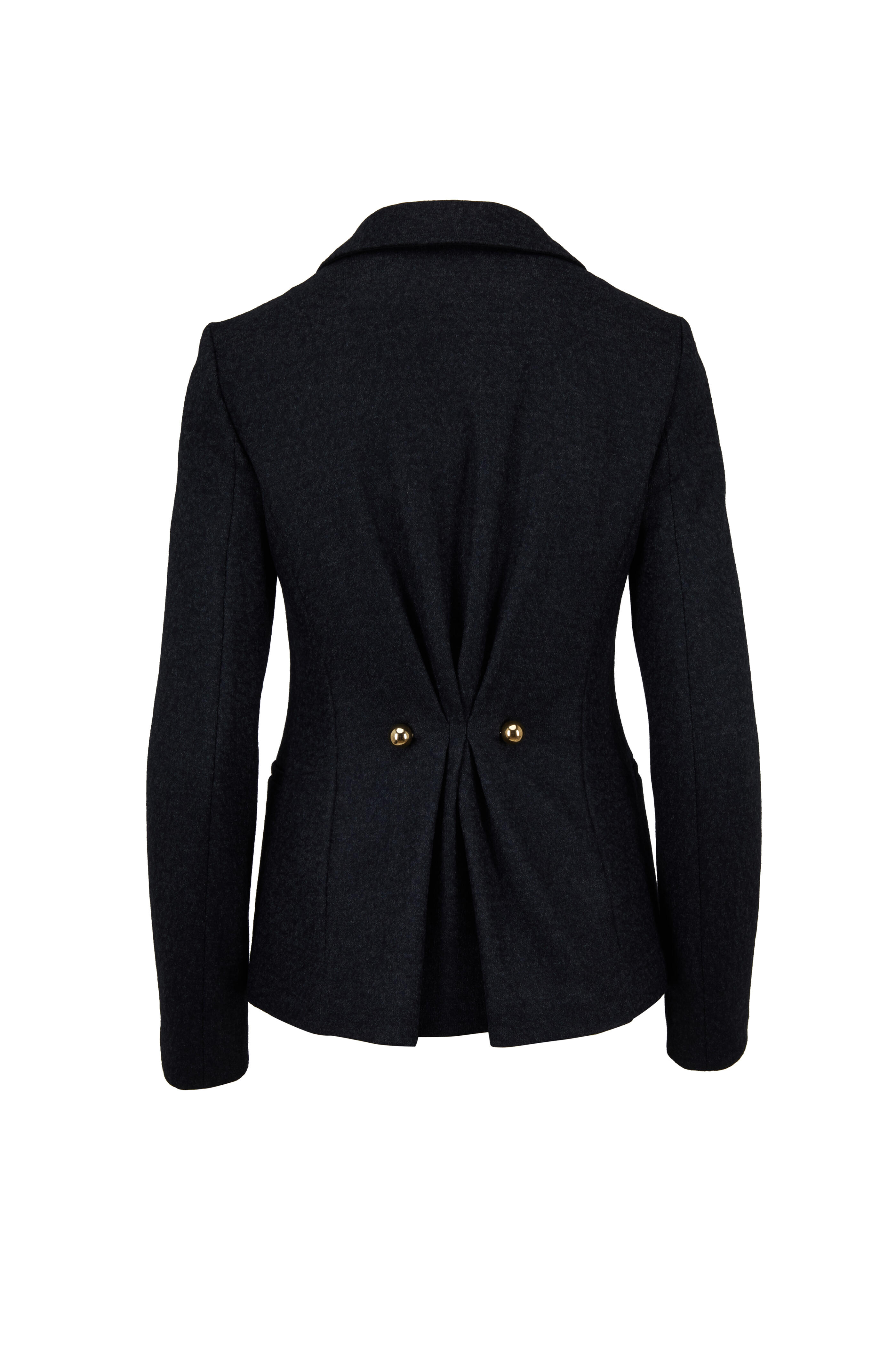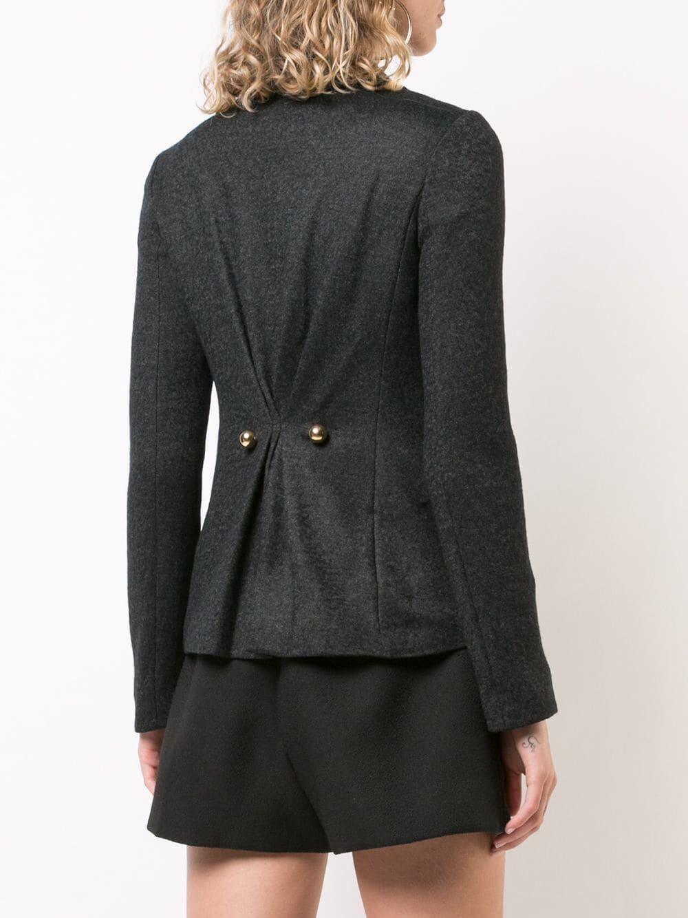 Notched lapels. Front single button closure. Lower welt pockets. Ruched back with gold-toned hardware detail. Imported. 50% acrylic, 50% wool. Dry clean.