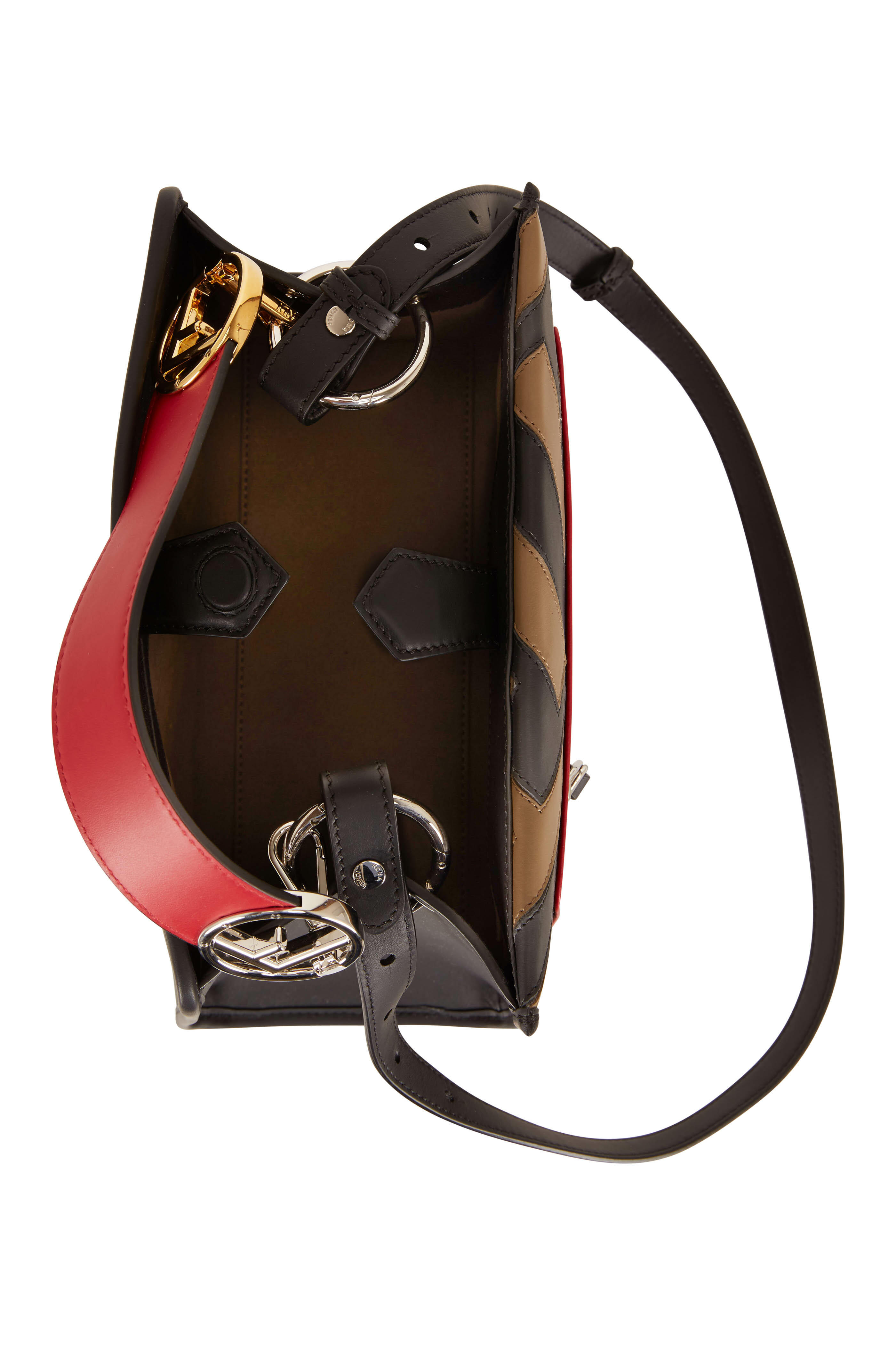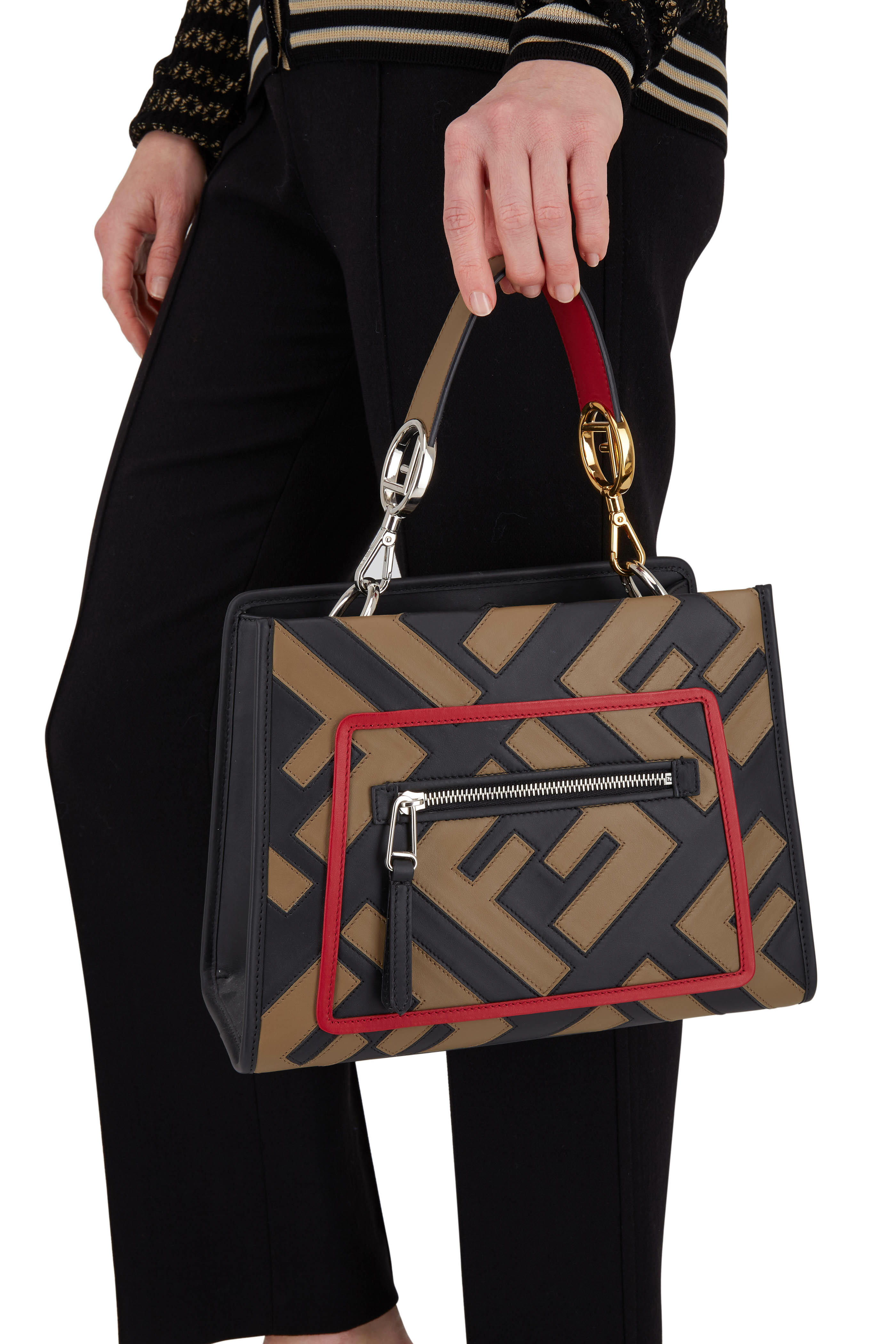 Calfskin leather. Detachable top handle; silver and gold tone metal logo. Detachable and adjustable shoulder strap. Center snap tab closure. Exterior front zip pocket. Macro FF design in shades of brown at front. One interior zip and two open pockets. Lined in suede. Protective metal feet. Made in Italy. Width: 11 ½". Height: 9". Depth: 5". Detachable handle drop: 7". Detachable and adjustable strap drop: 18".