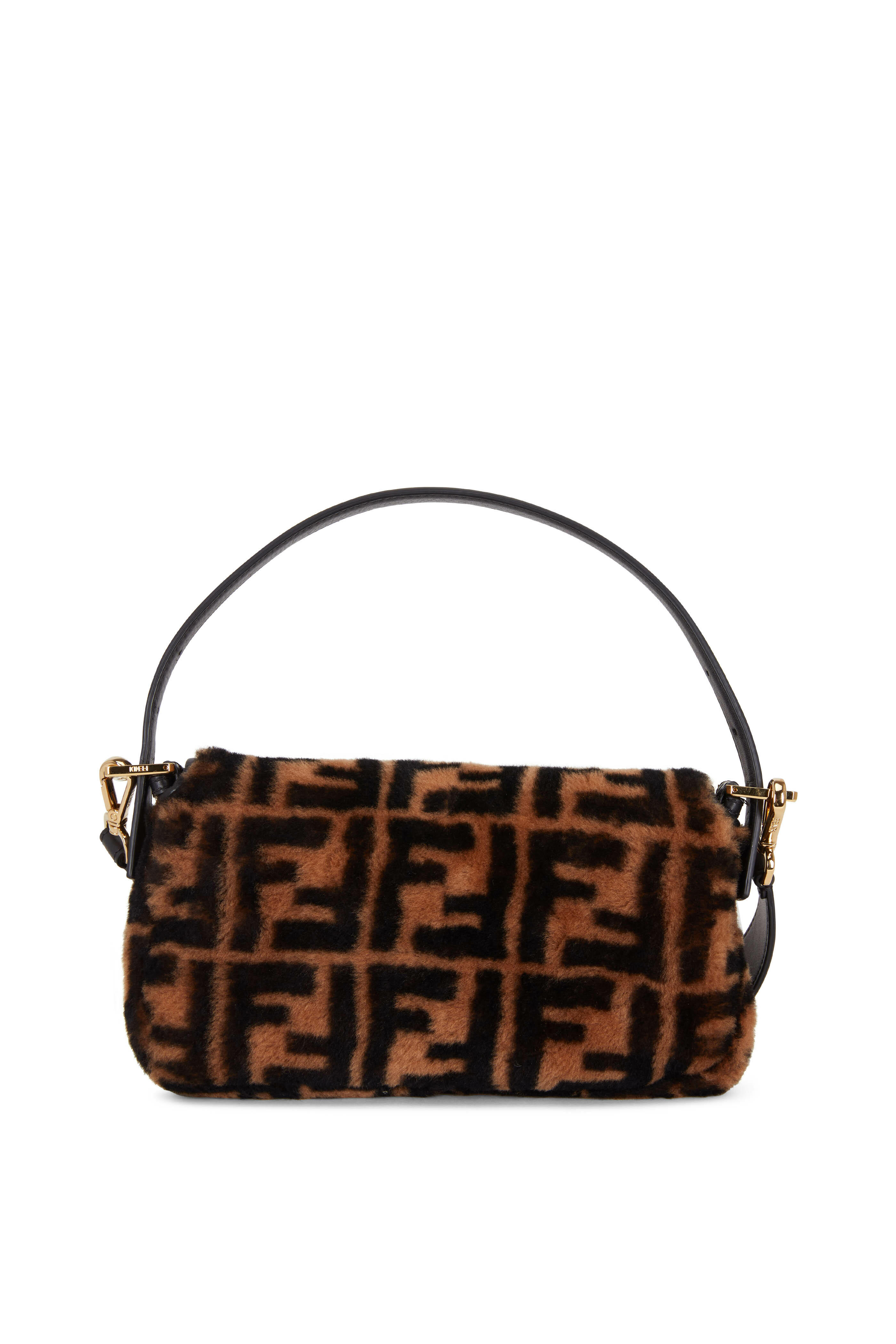 Sheepskin with leather trim. Detachable top handle. Detachable shoulder strap. Flap front; concealed magnetic snap closure. Gold-tone logo buckle. One interior zip pocket. Lined in leather. Made in Italy. Width: 11". Height: 7". Depth: 3". Detachable top handle: 5". Detachable shoulder strap: 18".