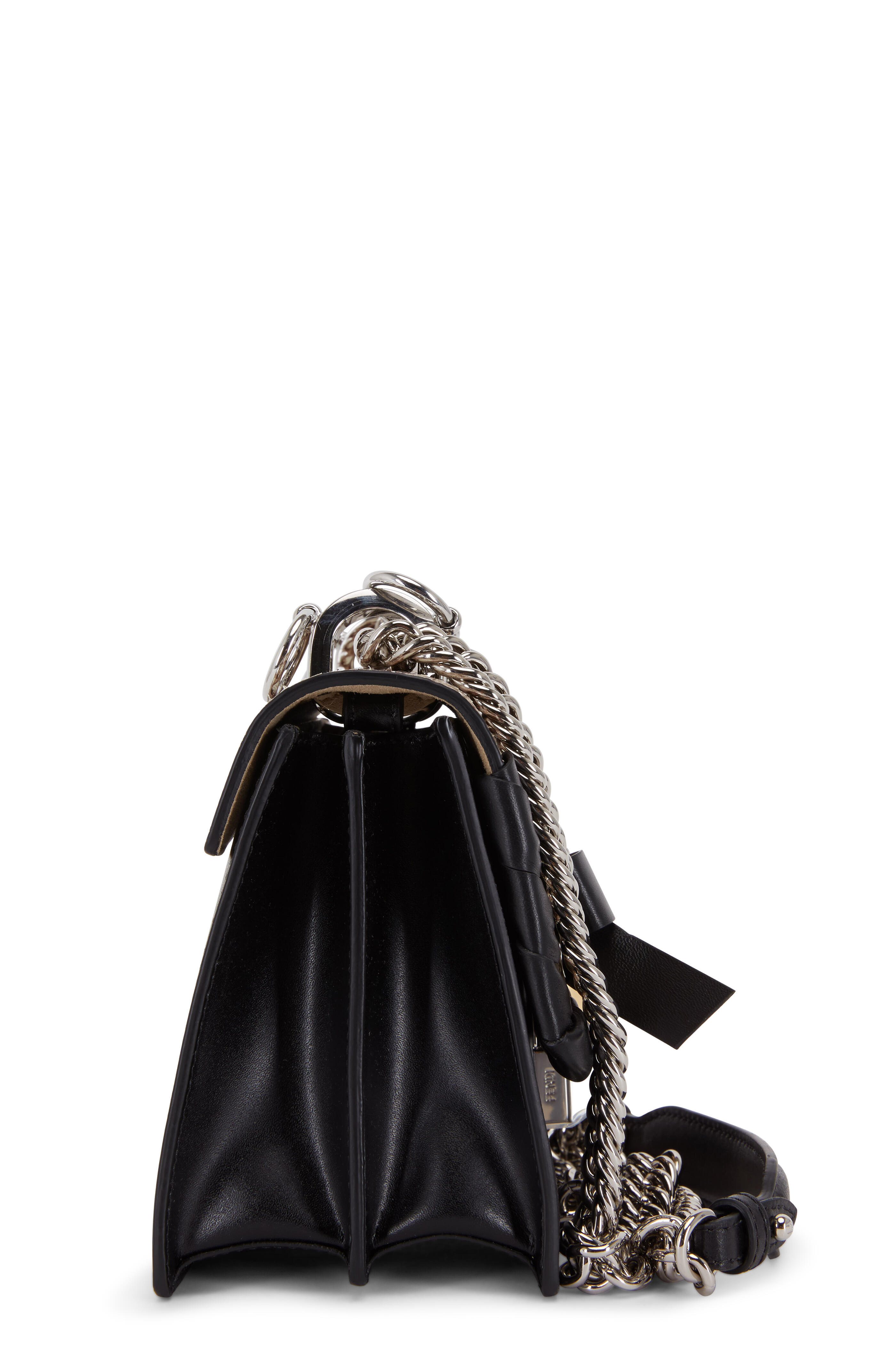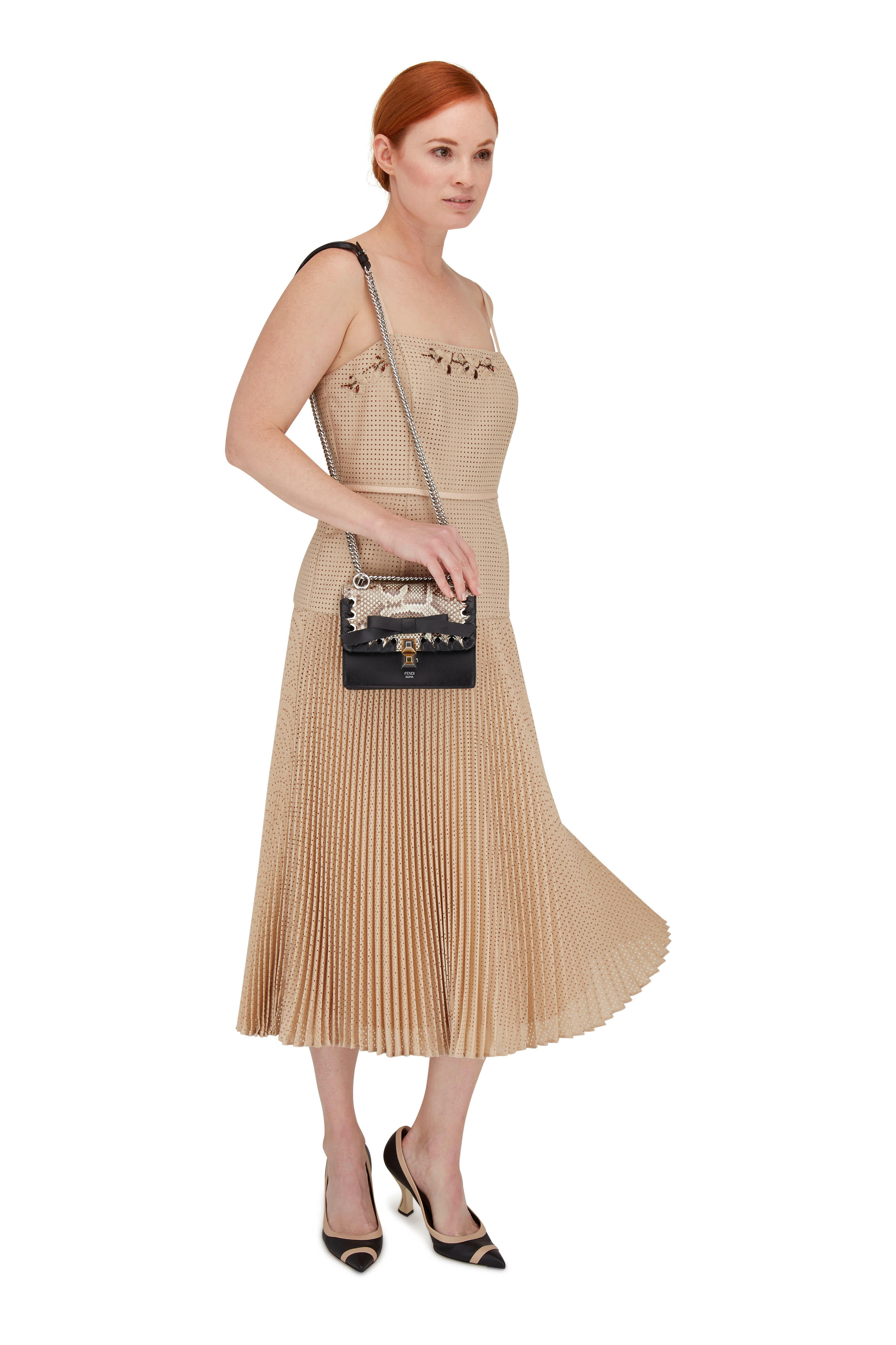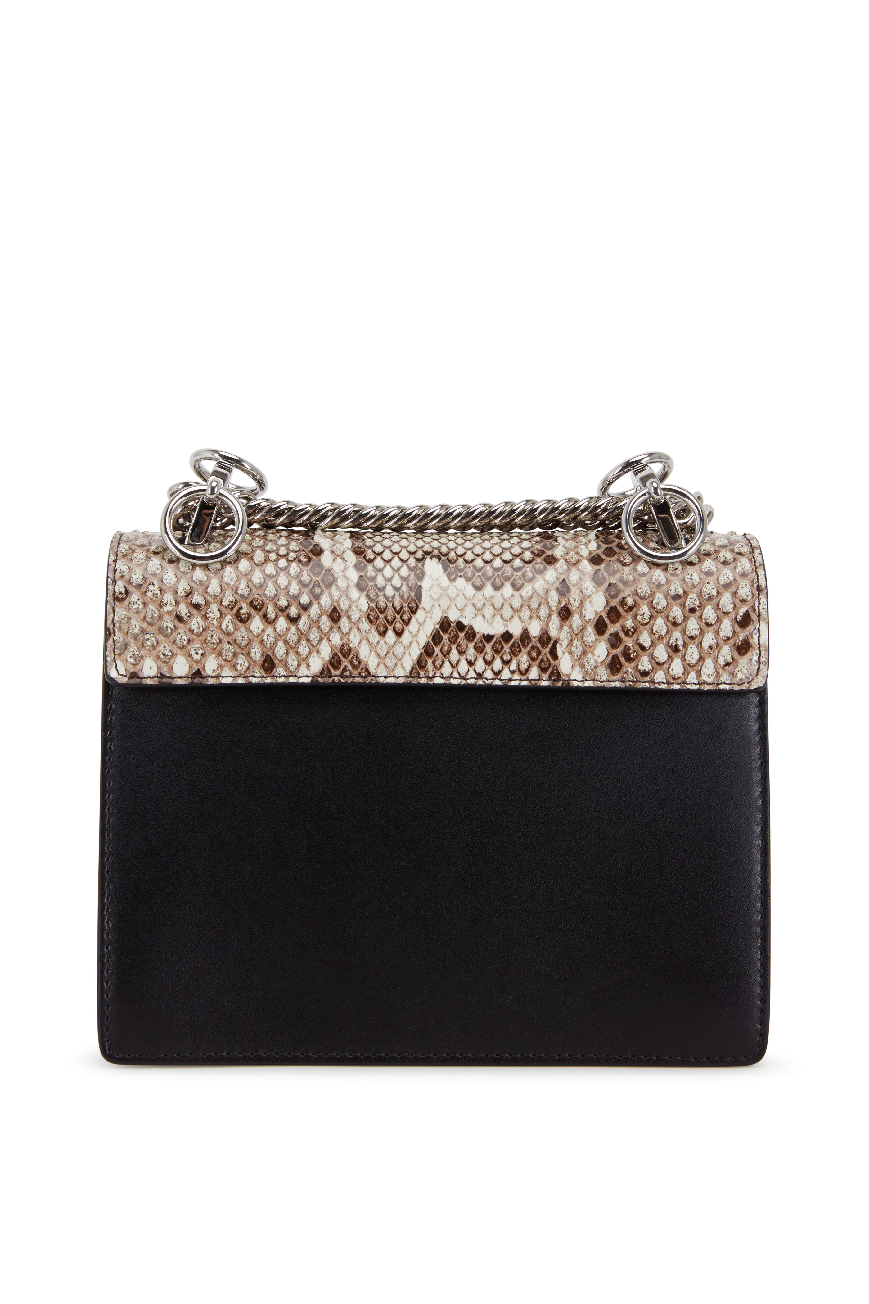 Python and calfskin leather. Sliding chain with leather inset shoulder strap. Flap front with studded push-lock closure. Grommet with leather lace through detail. Bow detail at front. Gusseted sides. Two compartmentalized interior. Interior slip pocket. Lined in suede. Made in Italy. Width: 7 ½'. Height: 6". Depth: 4". Strap drop: 11".