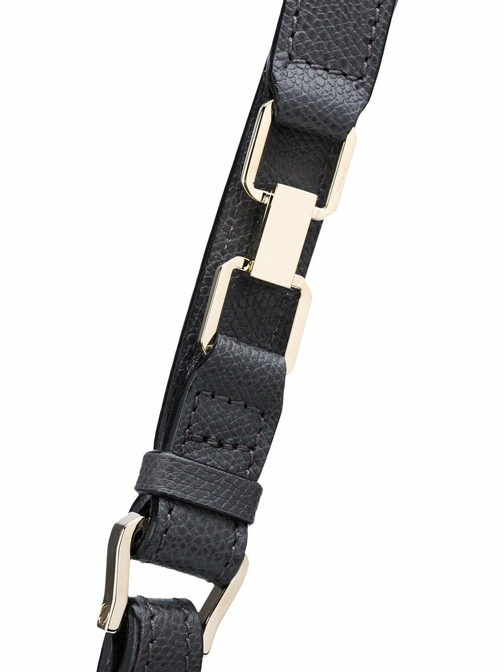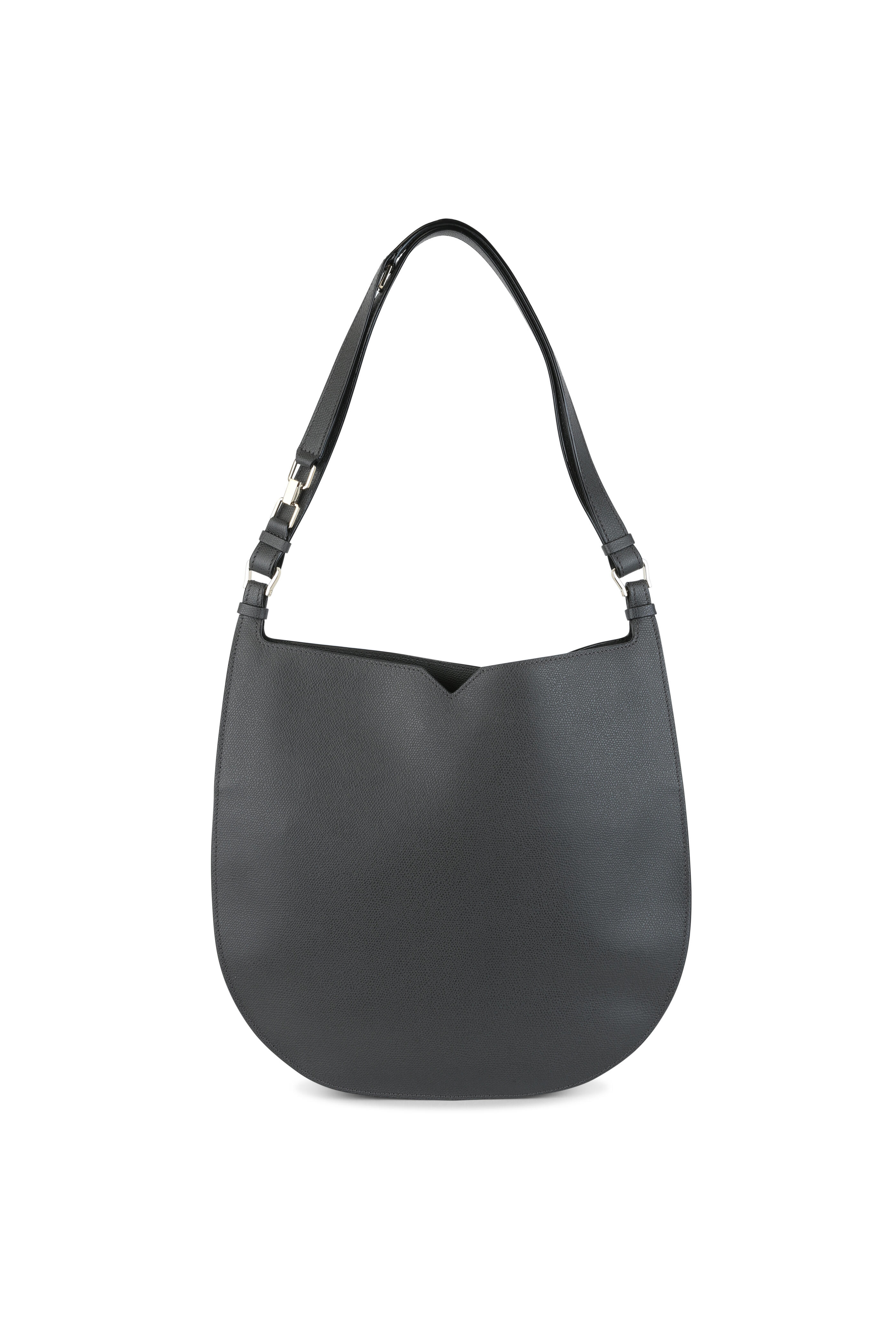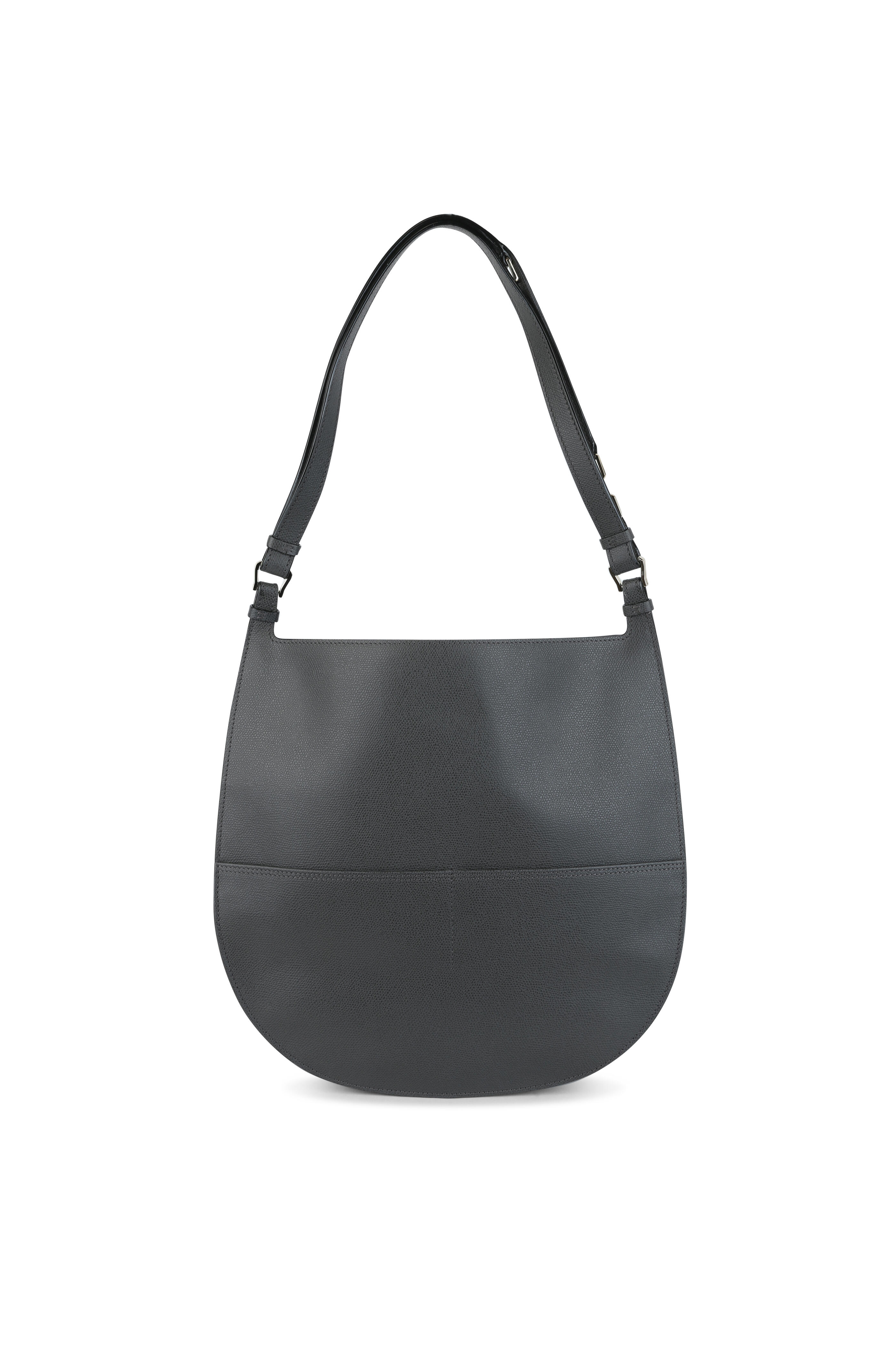 Saffiano leather. Adjustable flat shoulder strap. Magnetic center tab-snap closure. Two exterior back slip pockets. One interior open pocket. Lined in leather. Made in Italy. Height: 13". Width: 13 ½". Depth: 3 ½". Strap drop: 11 ½".