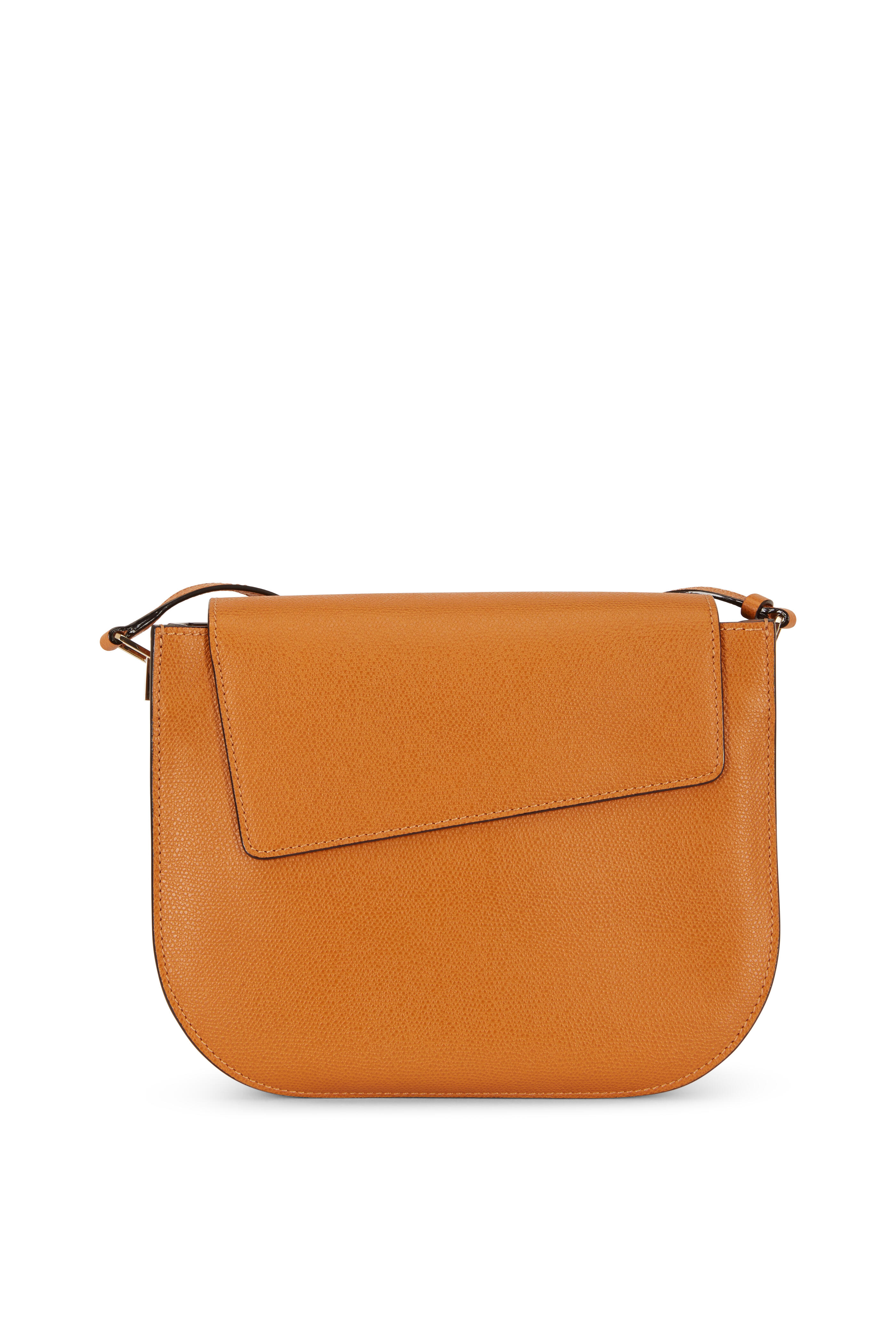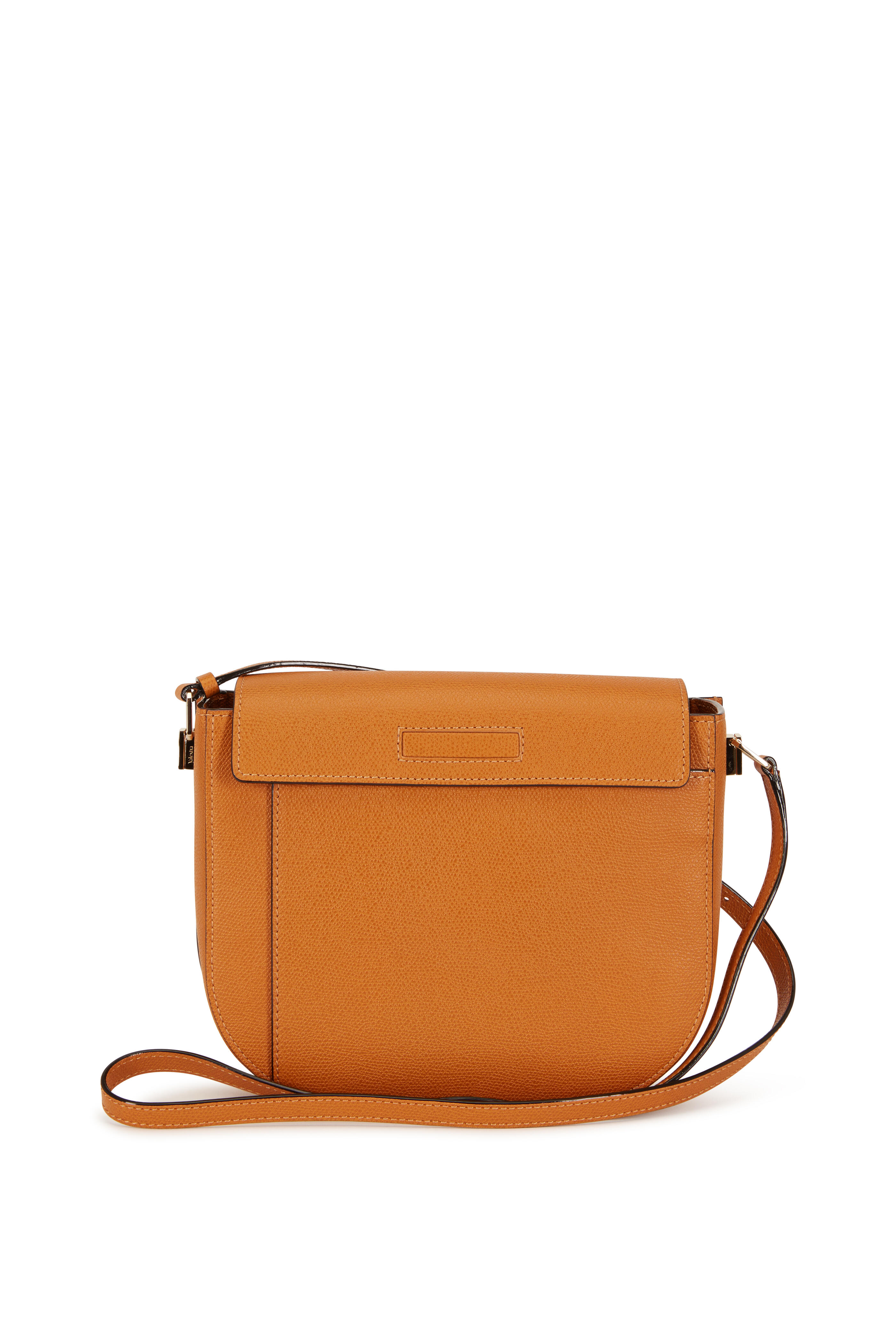 Saffiano leather. Adjustable flat leather strap. Flap front with magnetic snap closure. Asymmetric exterior front slip pocket. One interior zip and one slip pocket. Hand painted black edges. Lined in leather. Made in Italy. Width: 9". Height: 8". Depth: 3". Strap drop: 22".