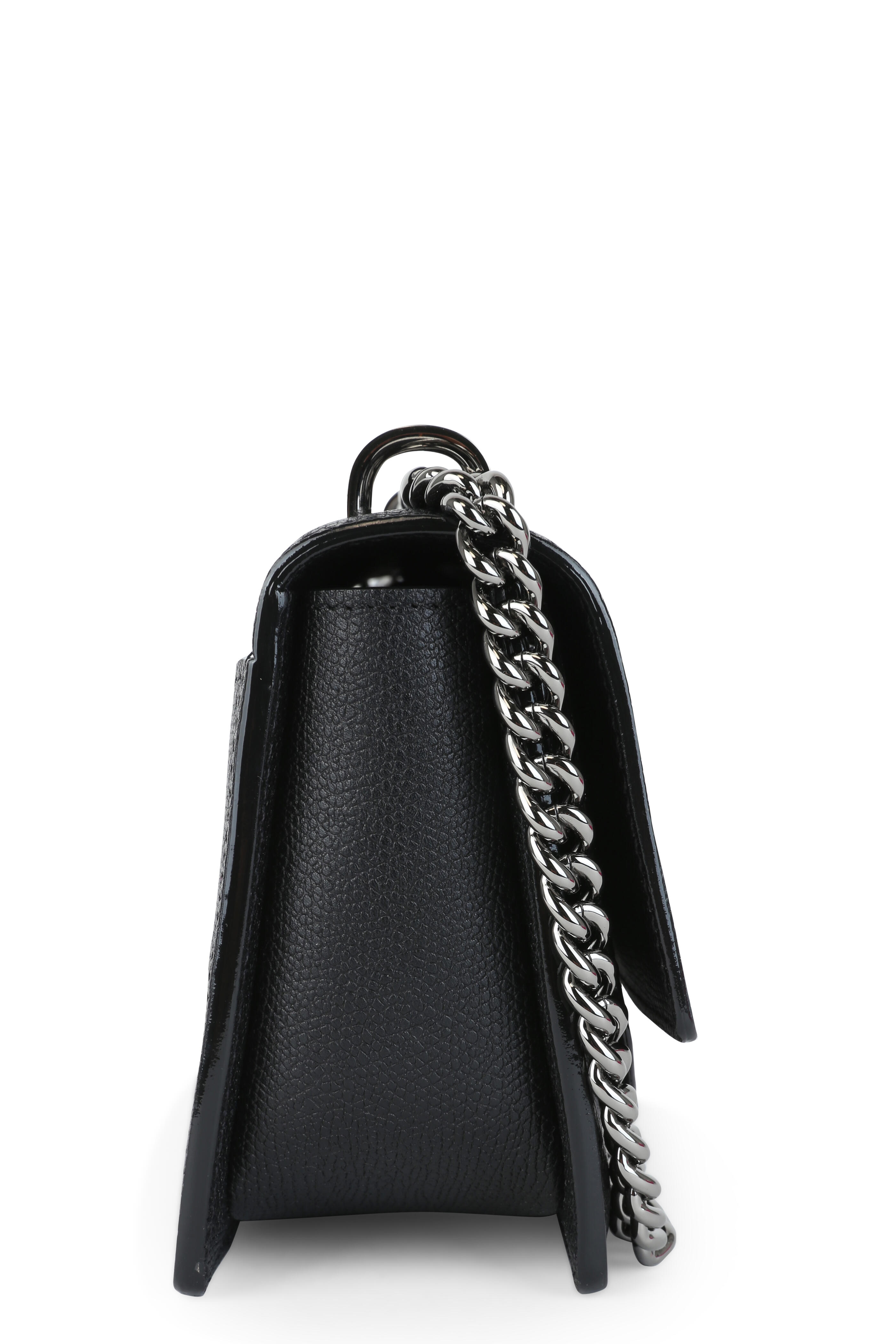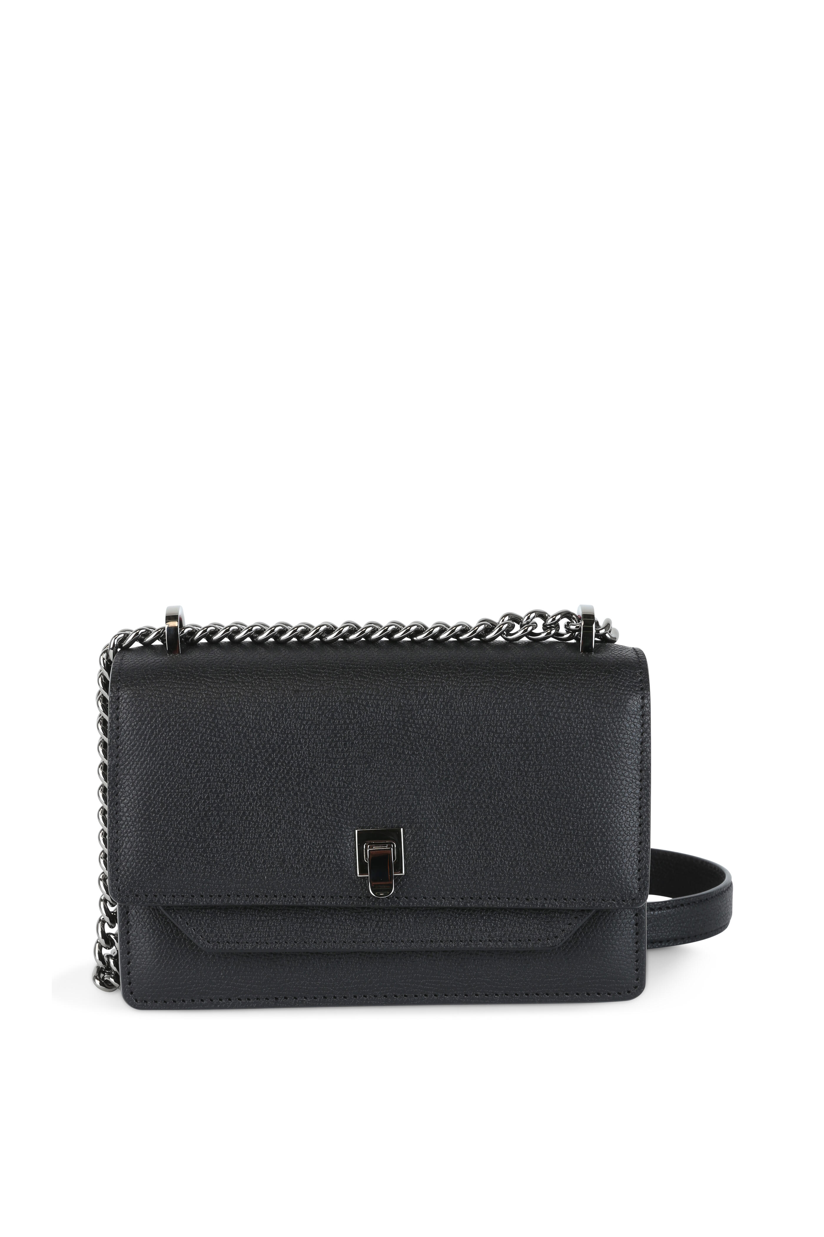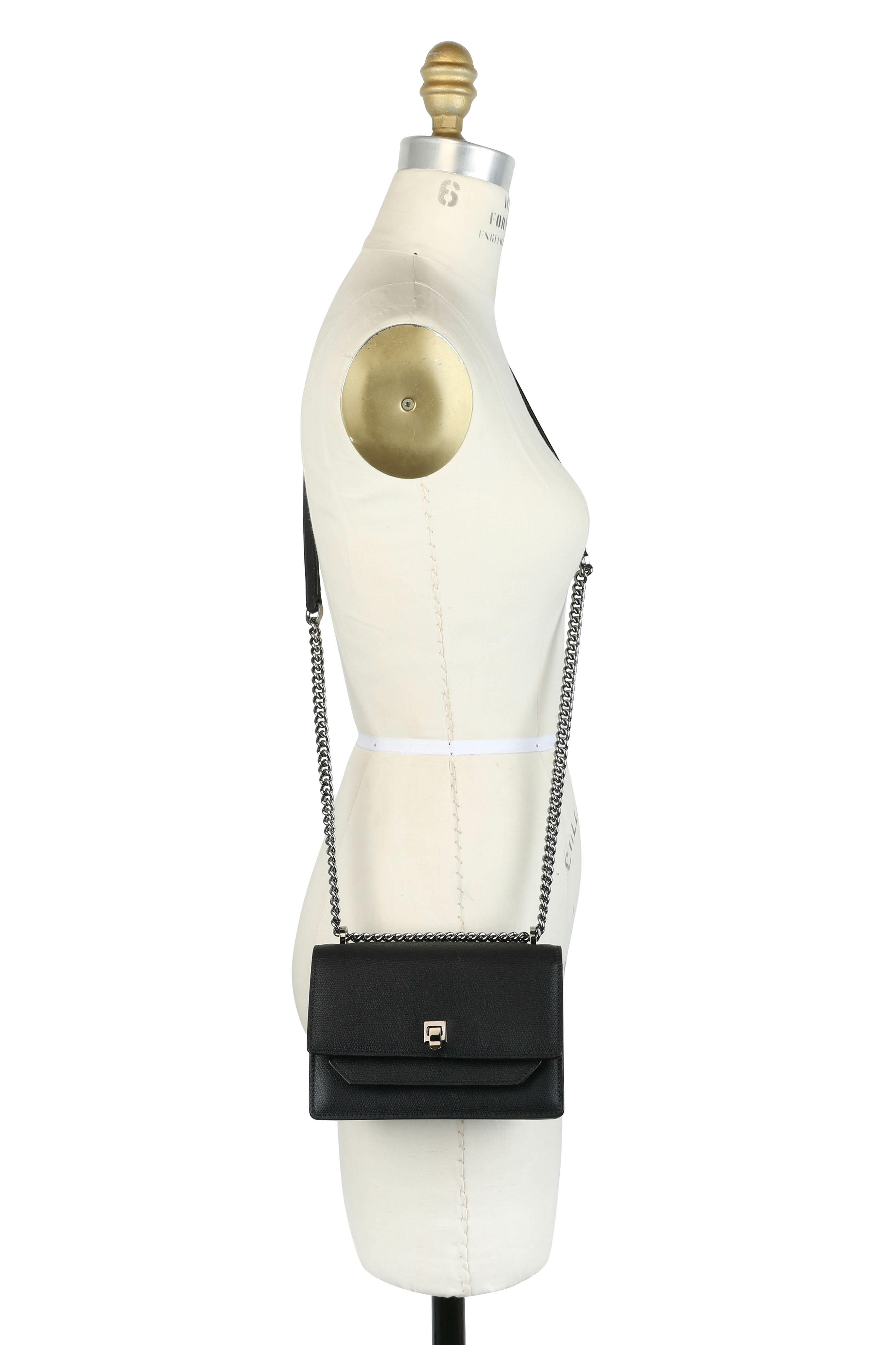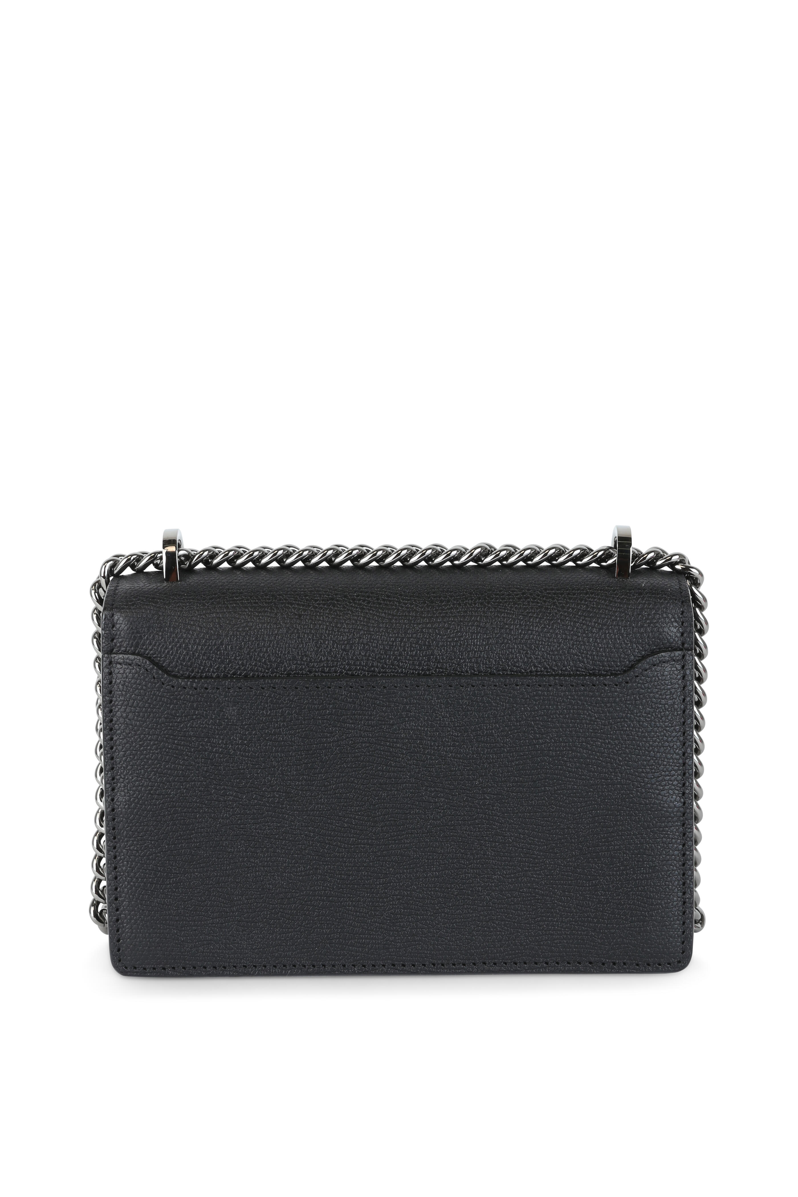 Calfskin leather. Chain and leather strap. Gunmetal hardware. Front flap with flip-lock closure. Exterior slip pocket at rear. Interior flap with slip pocket; one interior card slot. Lined in leather. Made in Italy. Height: 5". Width: 7". Depth: 2 ½". Strap drop: 22".