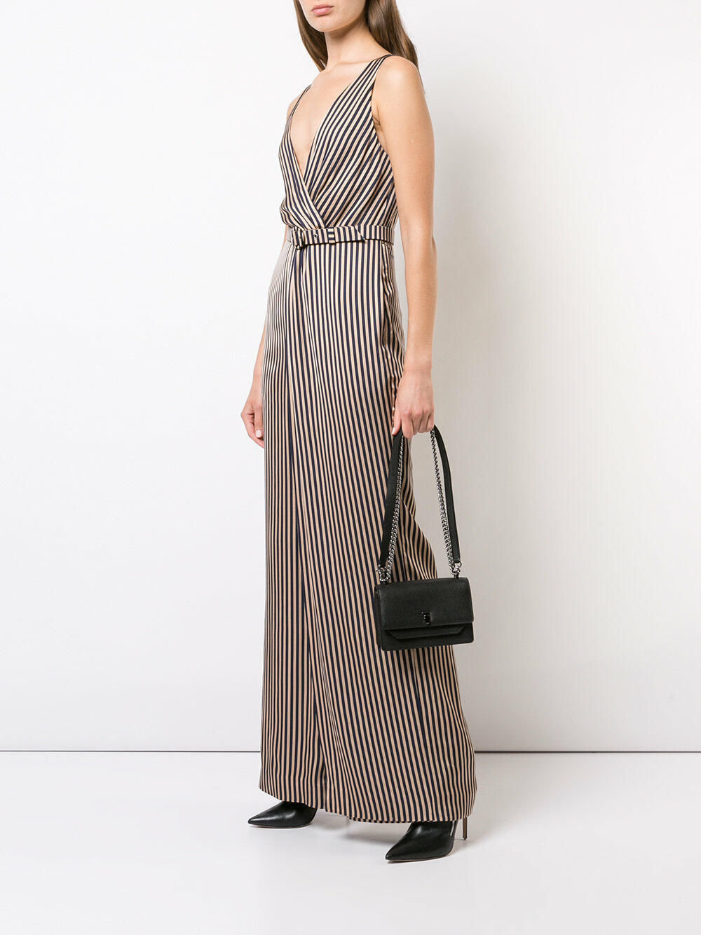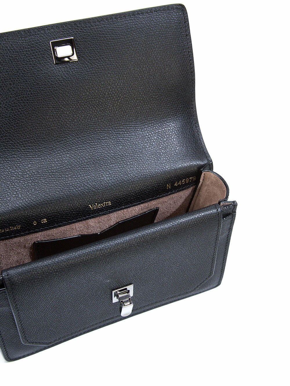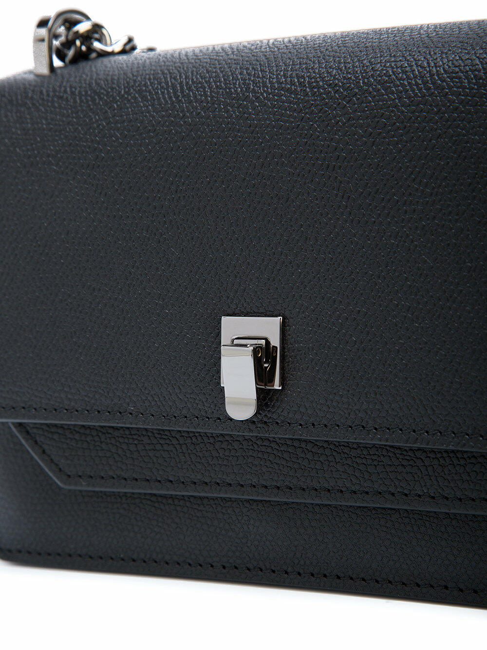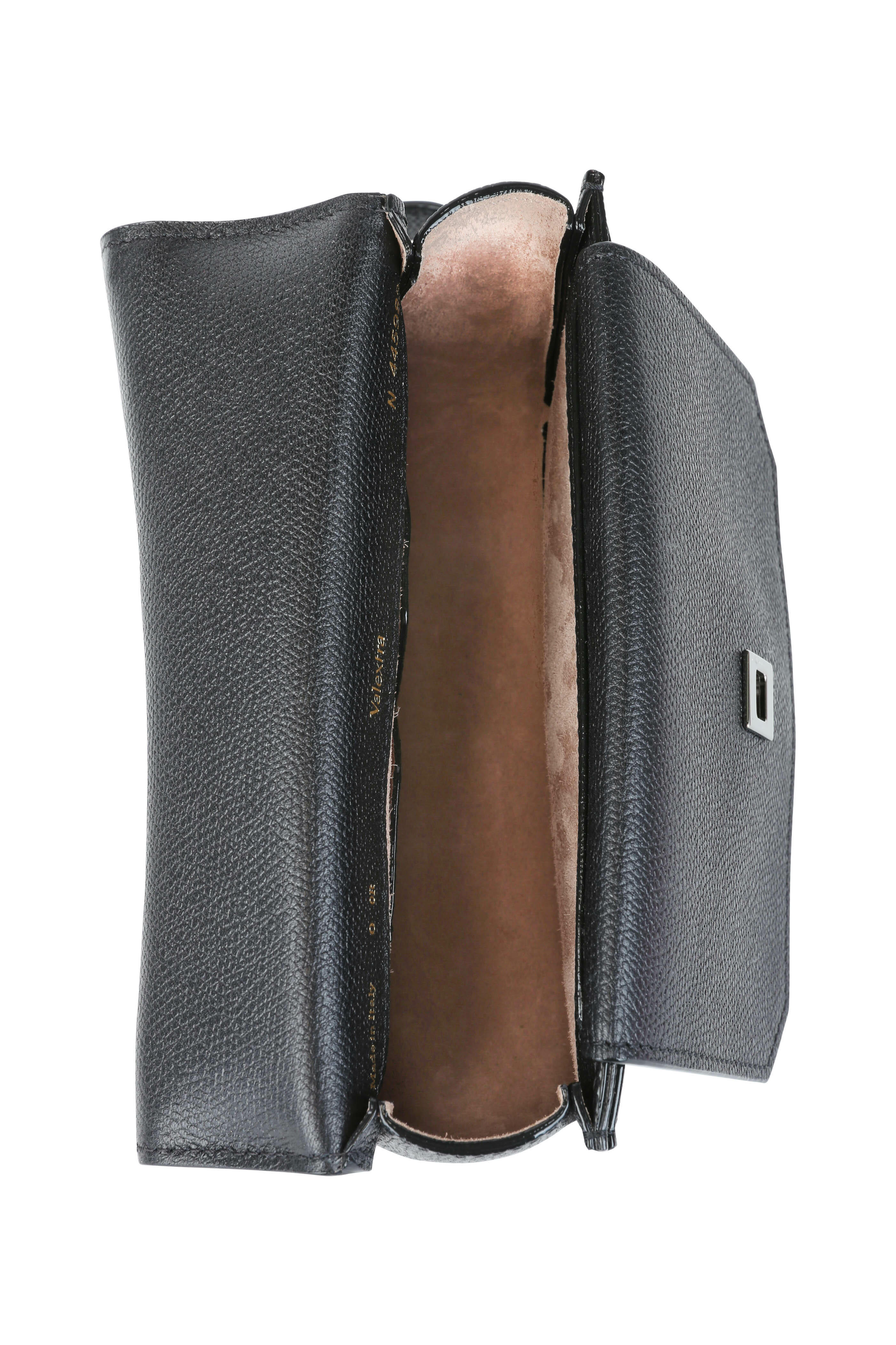 Calfskin leather. Chain and leather strap. Gunmetal hardware. Front flap with flip-lock closure. Exterior slip pocket at rear. Interior flap with slip pocket; one interior card slot. Lined in leather. Made in Italy. Height: 5". Width: 7". Depth: 2 ½". Strap drop: 22".