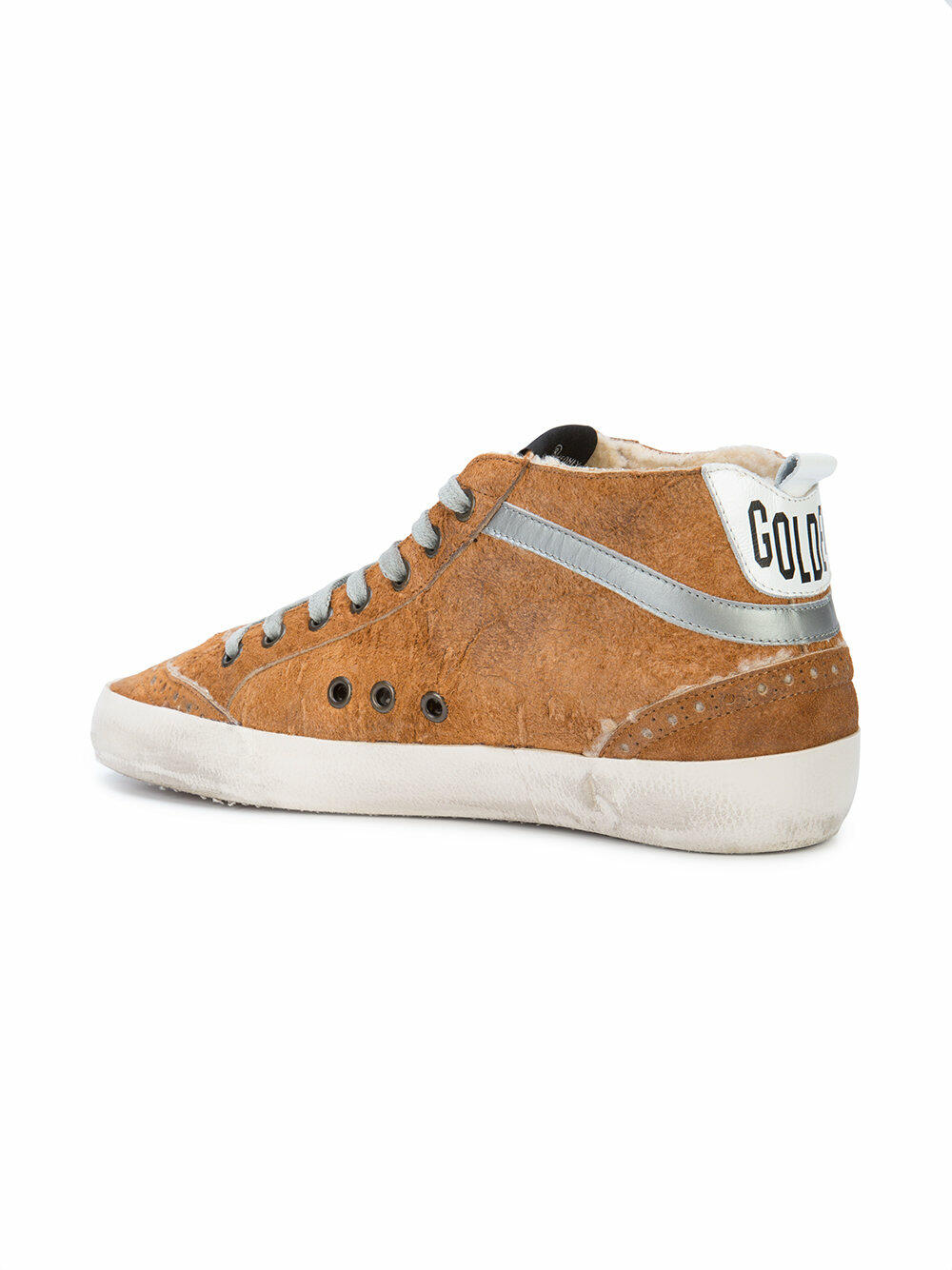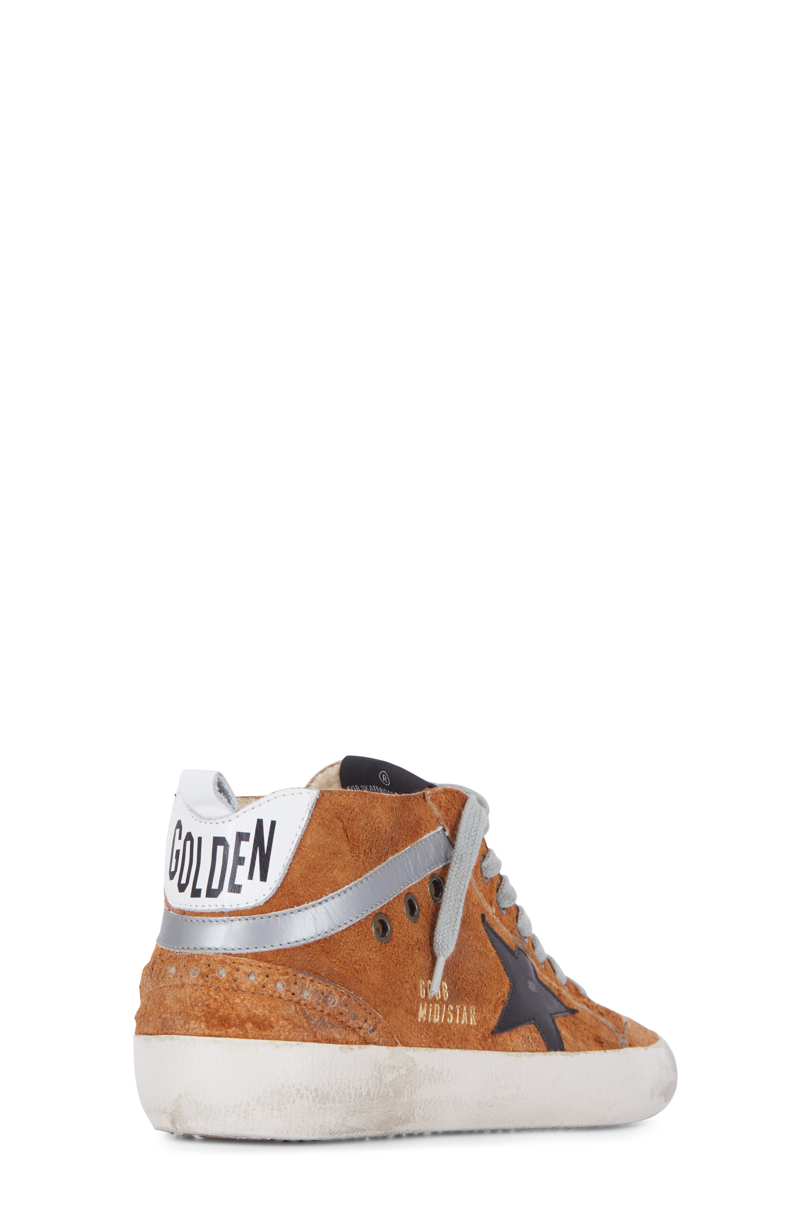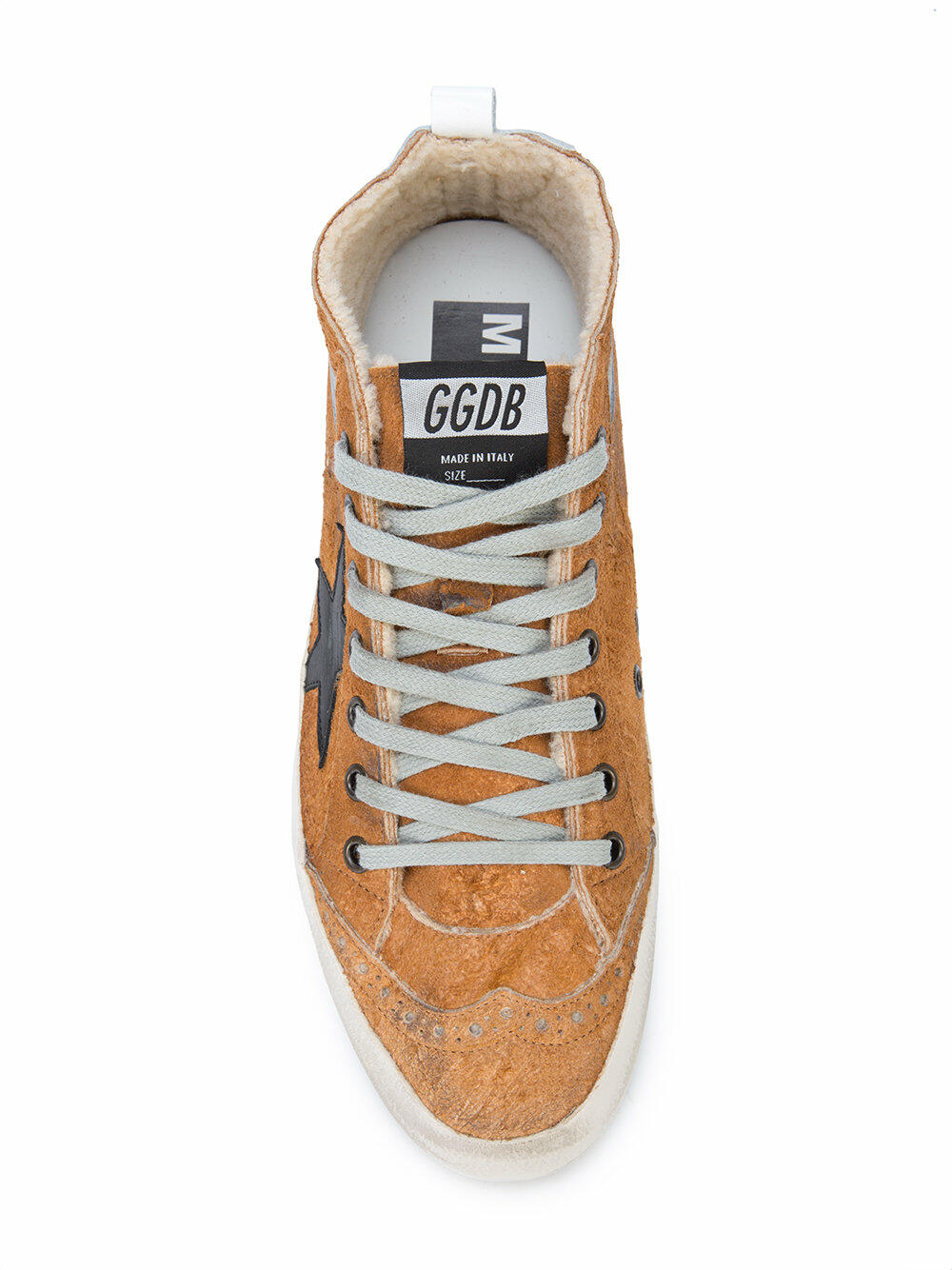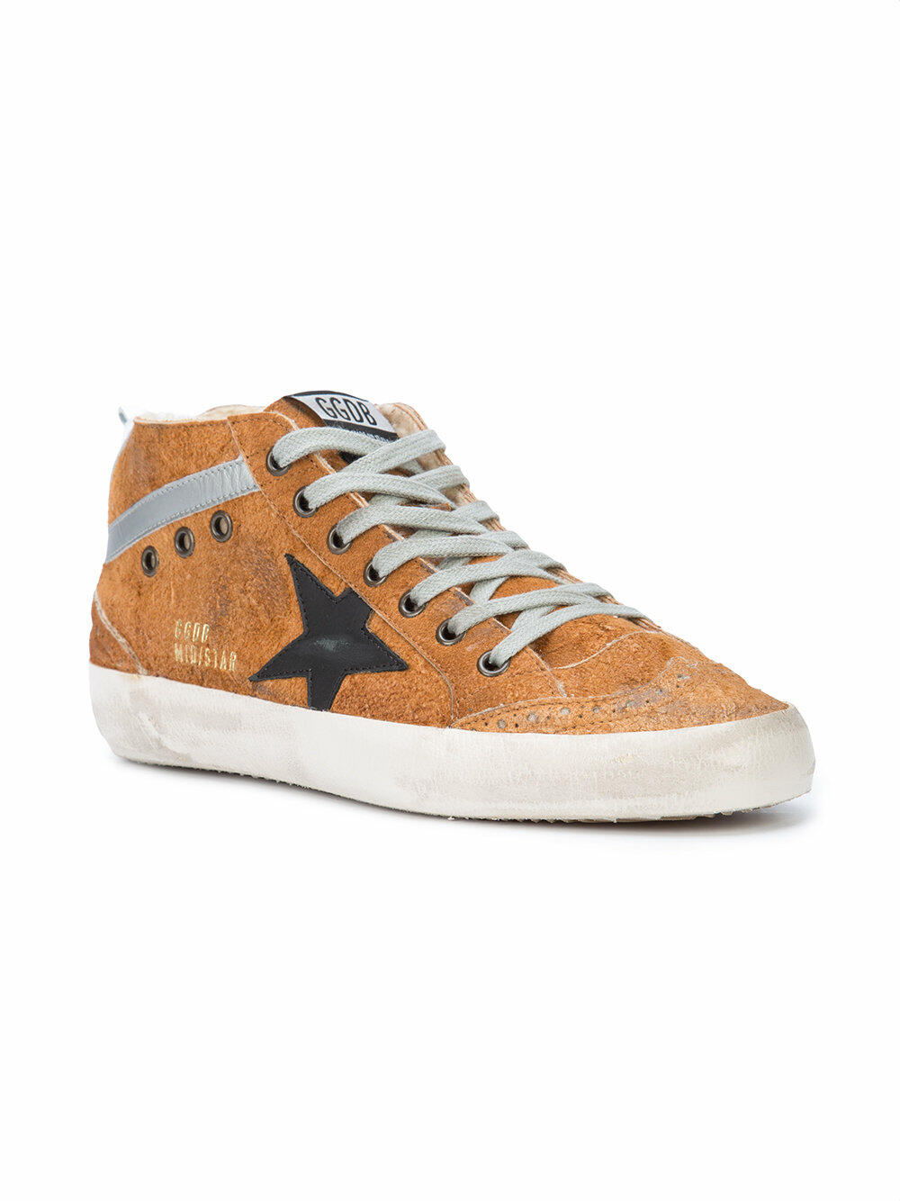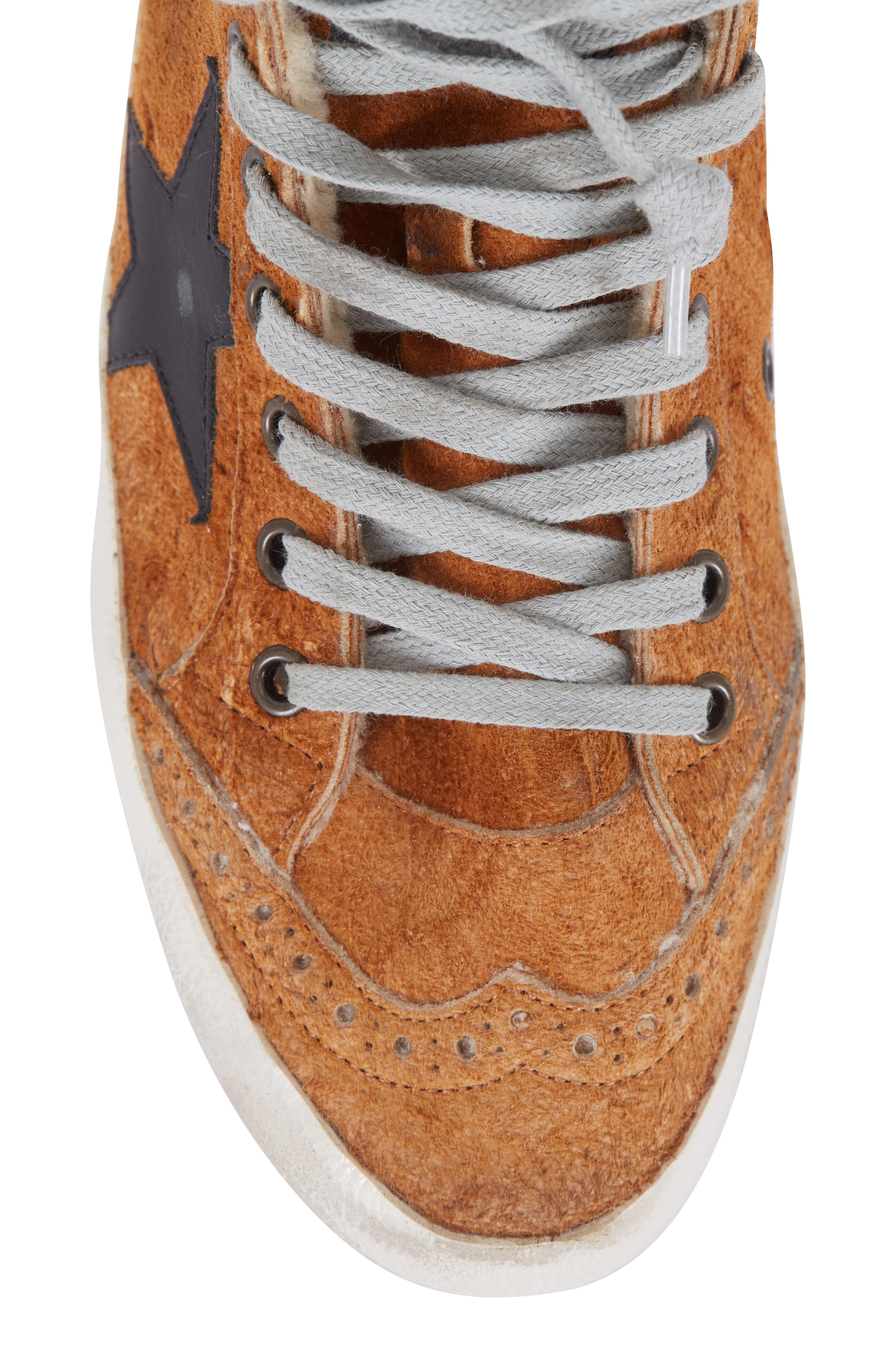 Suede upper with leather trim. Cap-toe with brogue detailing. Lace-up closure. Black leather embossed star detail. Brogue detail at back heel. Genuine shearling lining; cushioned insole. Rubber sole. Made in Italy.