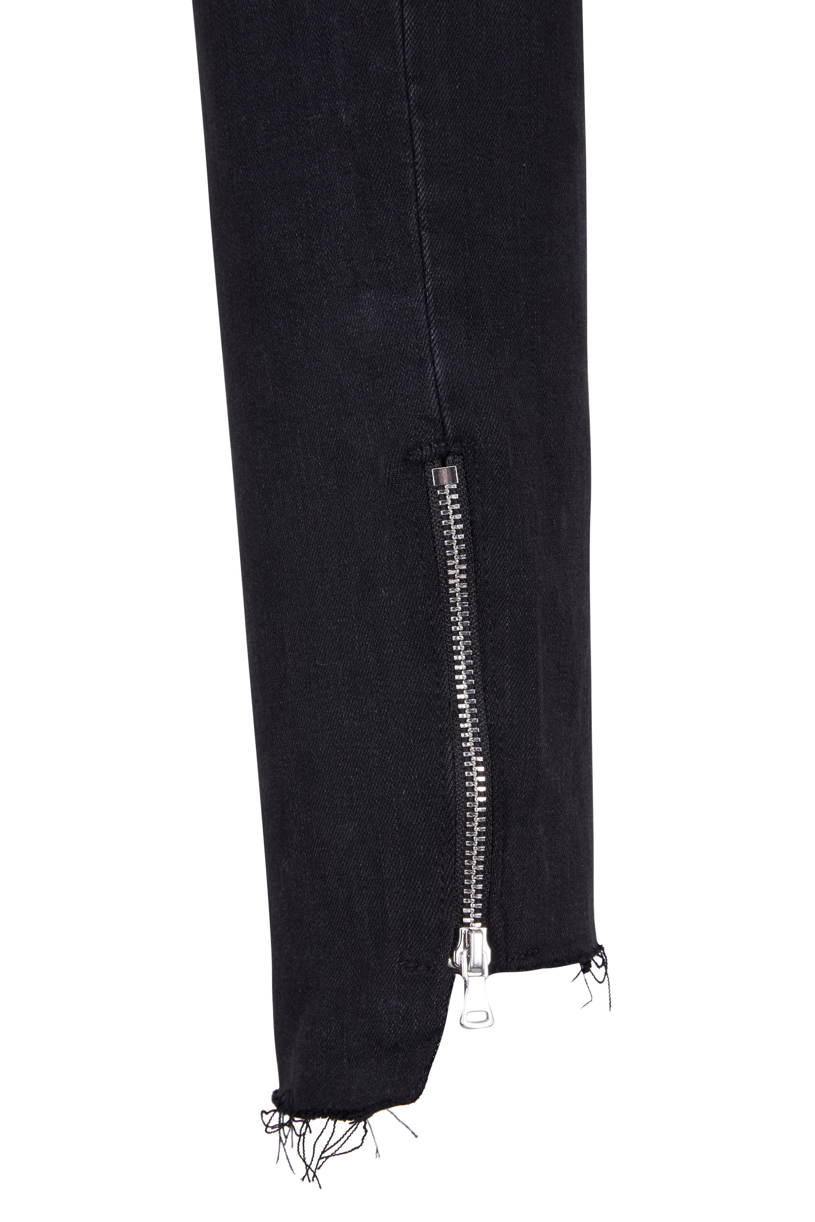 Five pocket styling. Raw step hem. Silver toned ankle zip details. Made in the USA. Skinny fit. Inseam: 30". Leg opening: 10". Rise: 11". 54% rayon, 23% cotton, 22% polyester, 1% spandex. Machine wash.