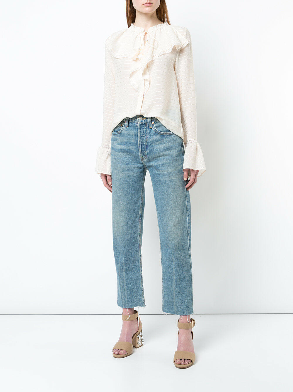Ruffled v-neckline. Button front placket. Bell sleeves. Imported. 100% silk. Dry clean.