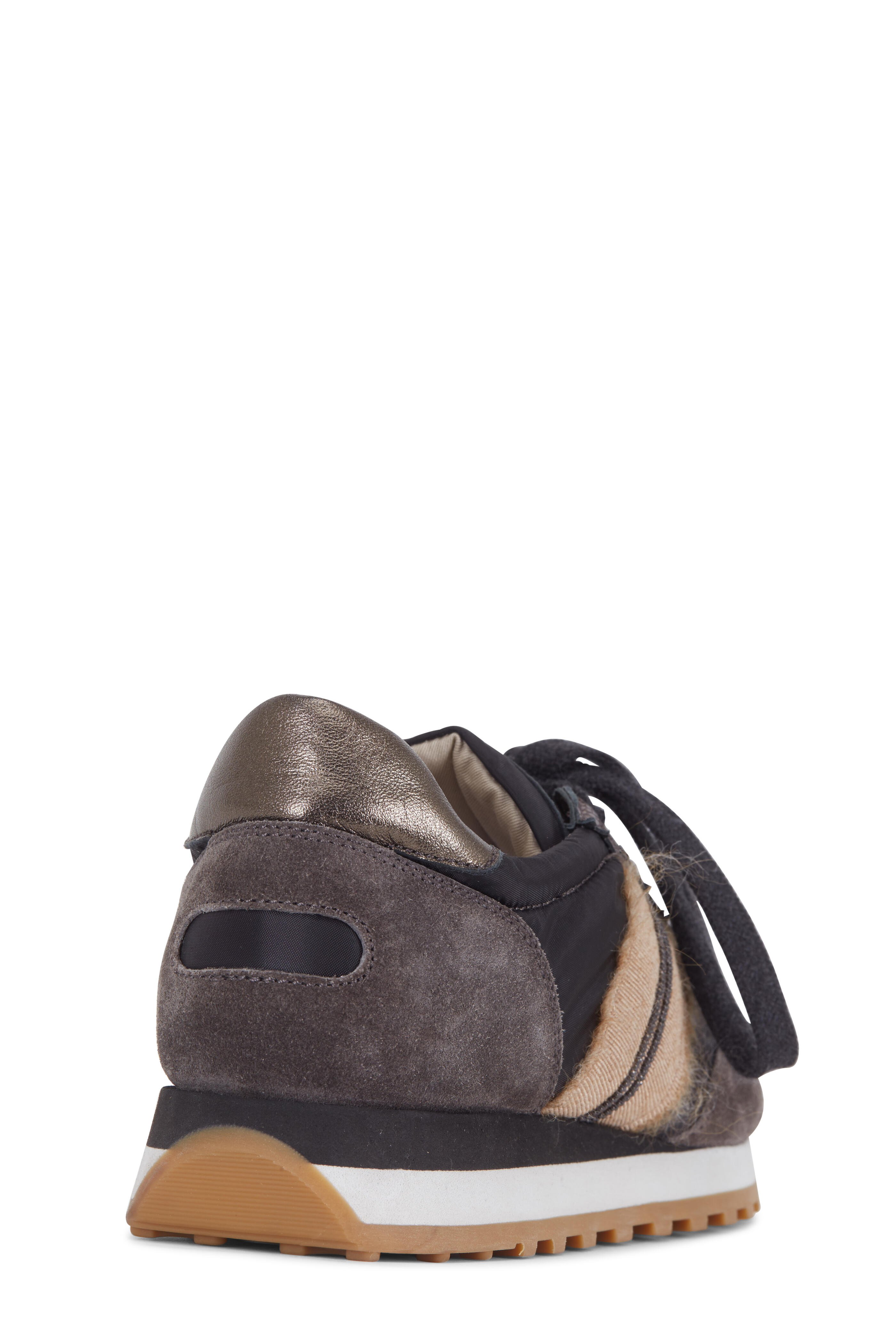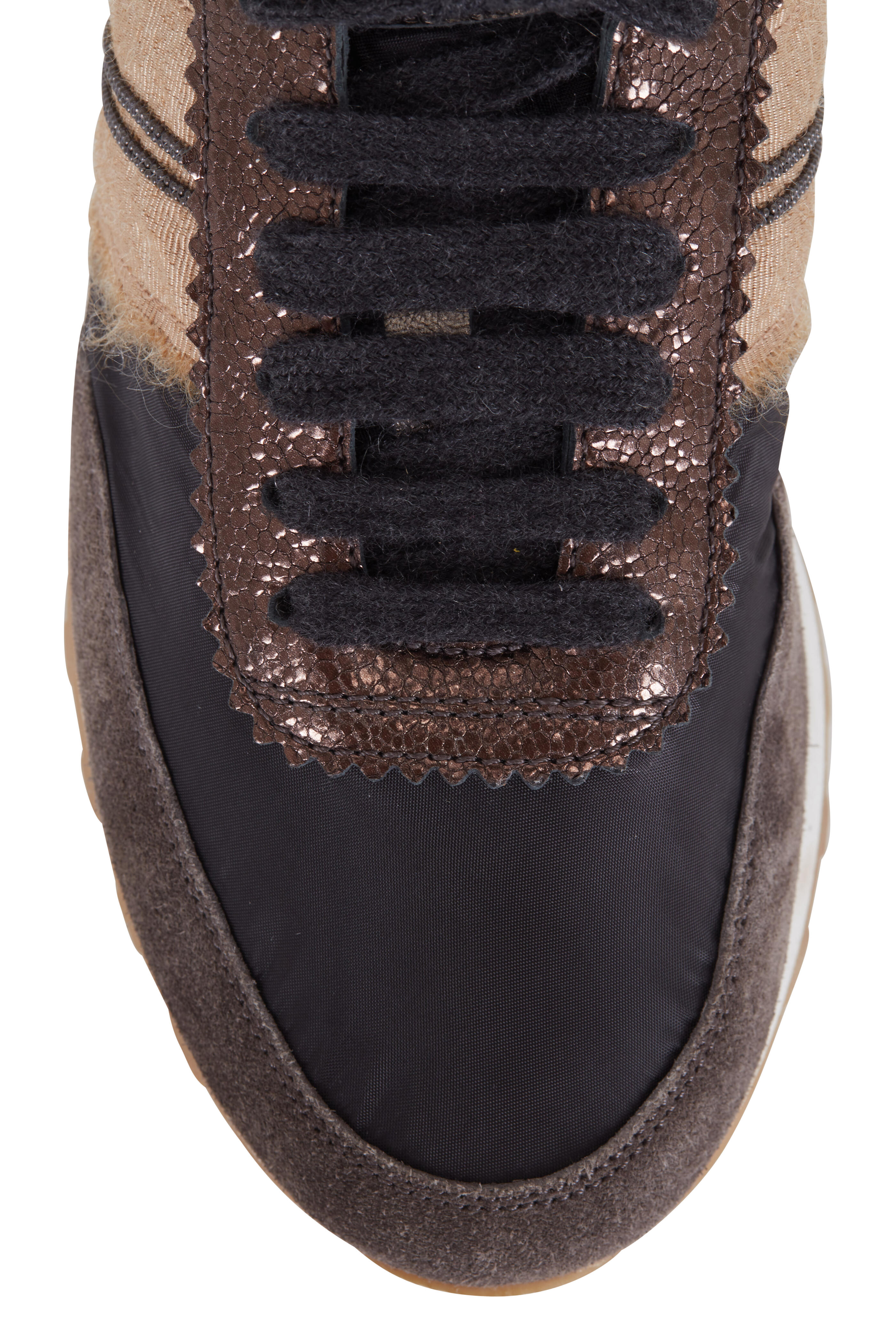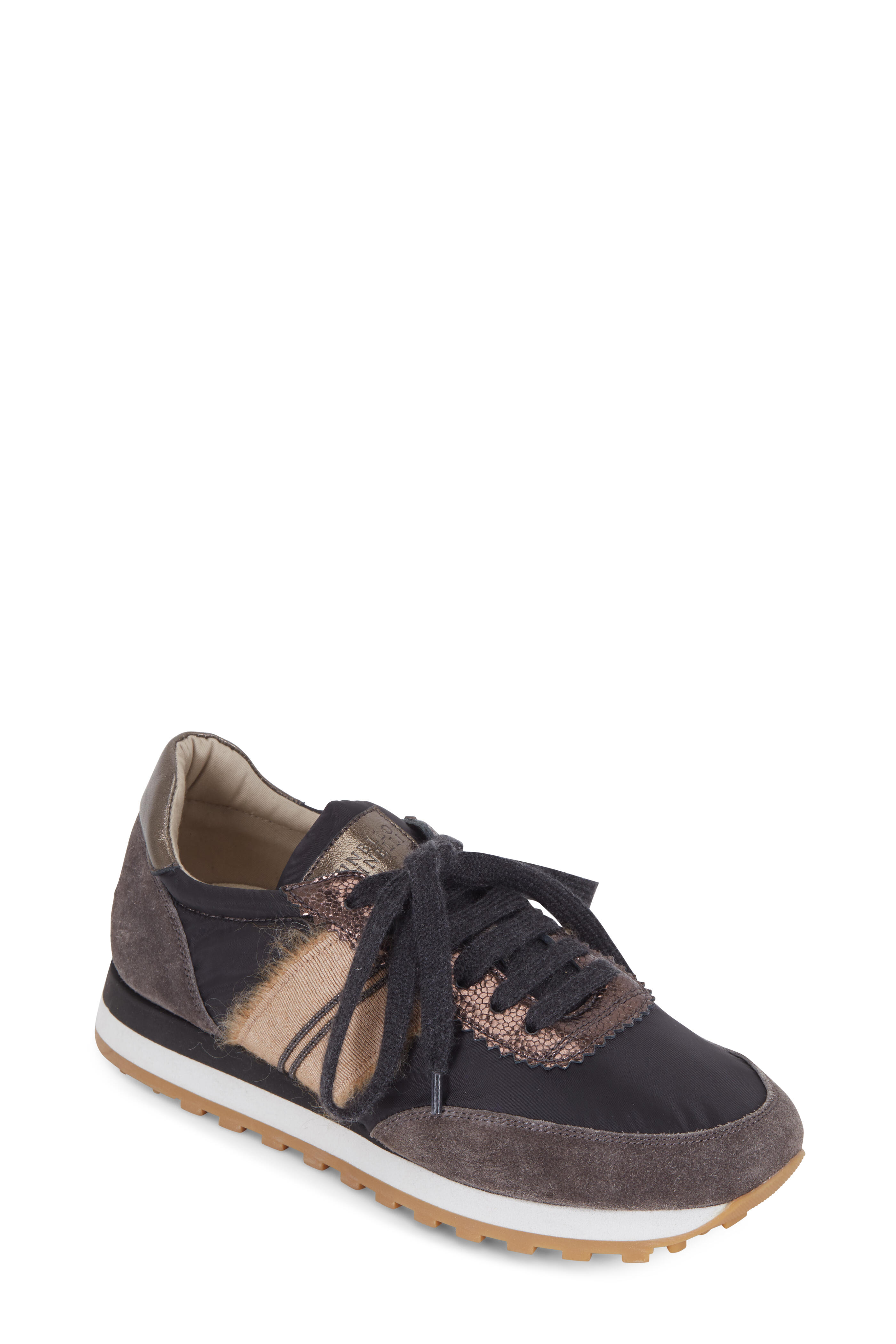 Nylon upper with suede trim. Round toe. Lace-up closure. Grosgrain ribbon and monili trim. Nylon lining; cushioned insole. Made in Italy.