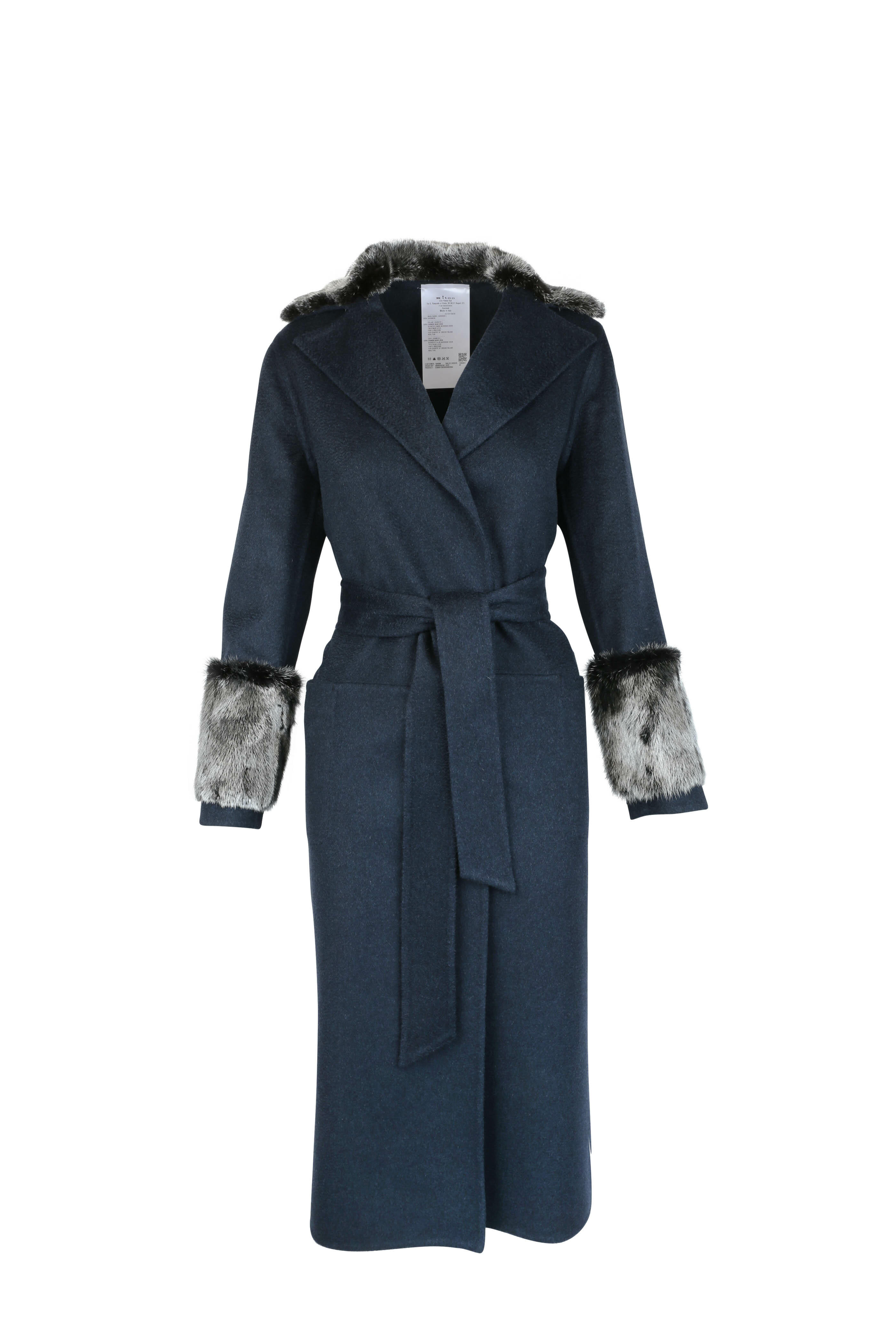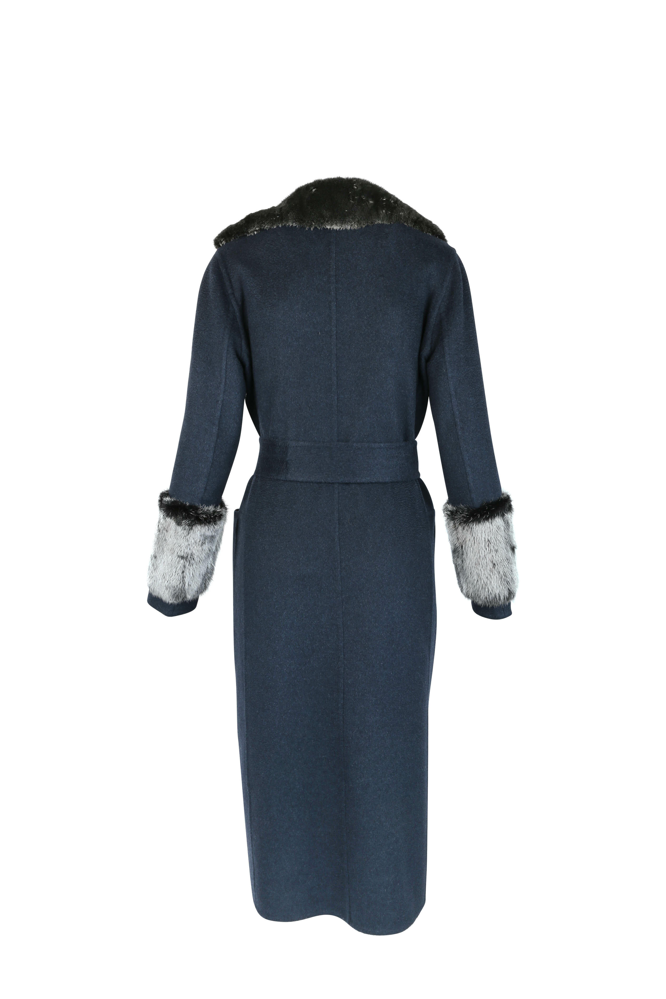 Specialist clean. Notched lapels. Detachable self-belt at waist. Lower patch pockets. Made in Italy. 100% cashmere; trim: 100% metallic mink (Finland).