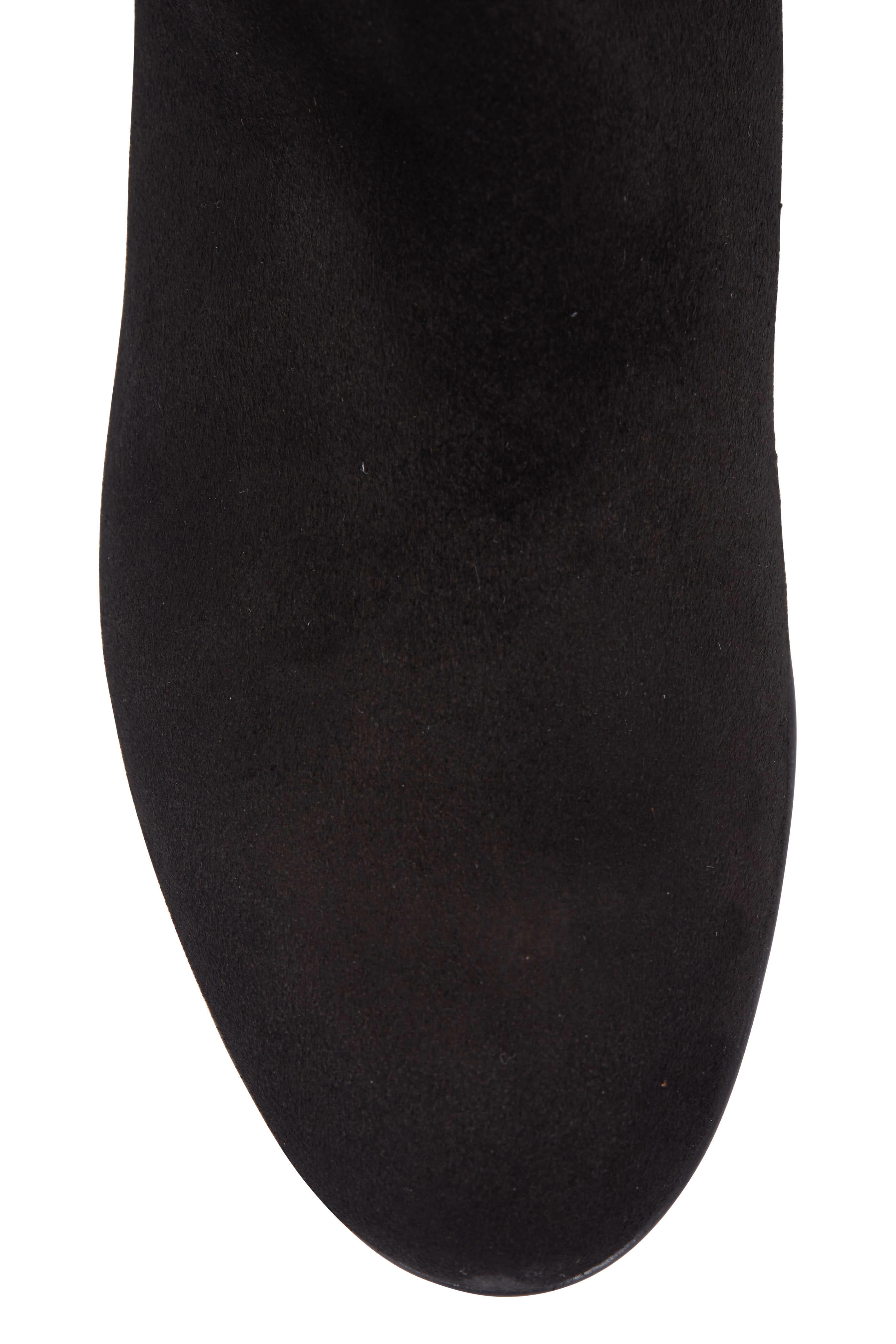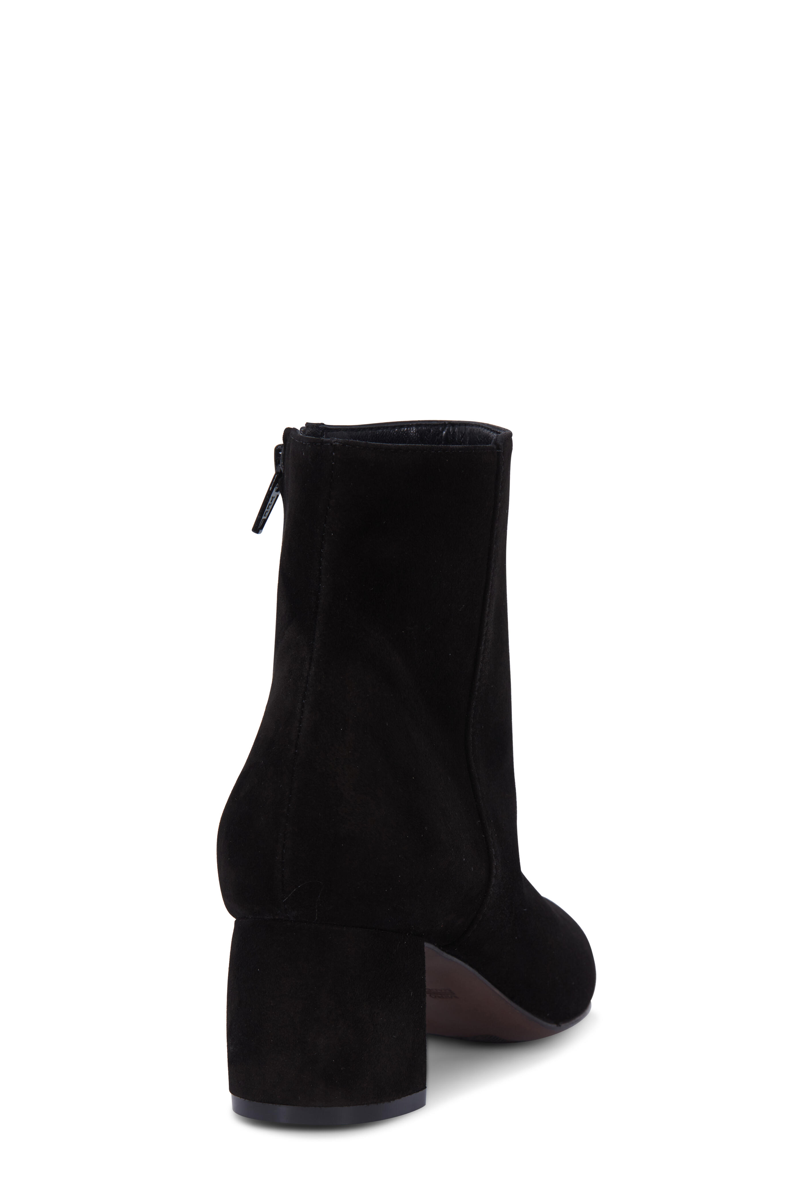 Suede upper. Tapered toe. Side zip closure. Leather lining, cushioned insole. Self covered curved block heel. Leather sole. Made in Italy. Heel measurement: 50mm (2"). Shaft: 5".