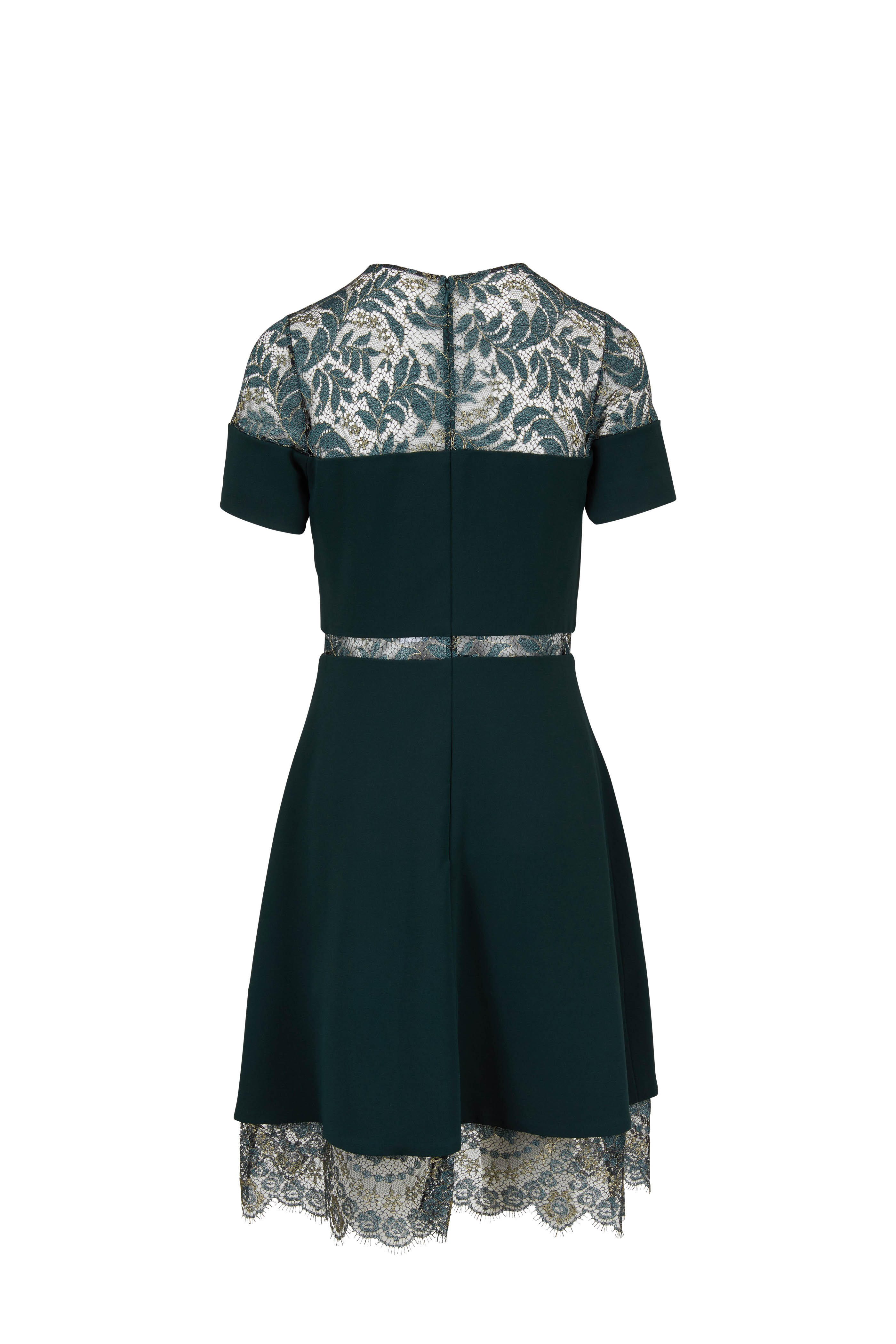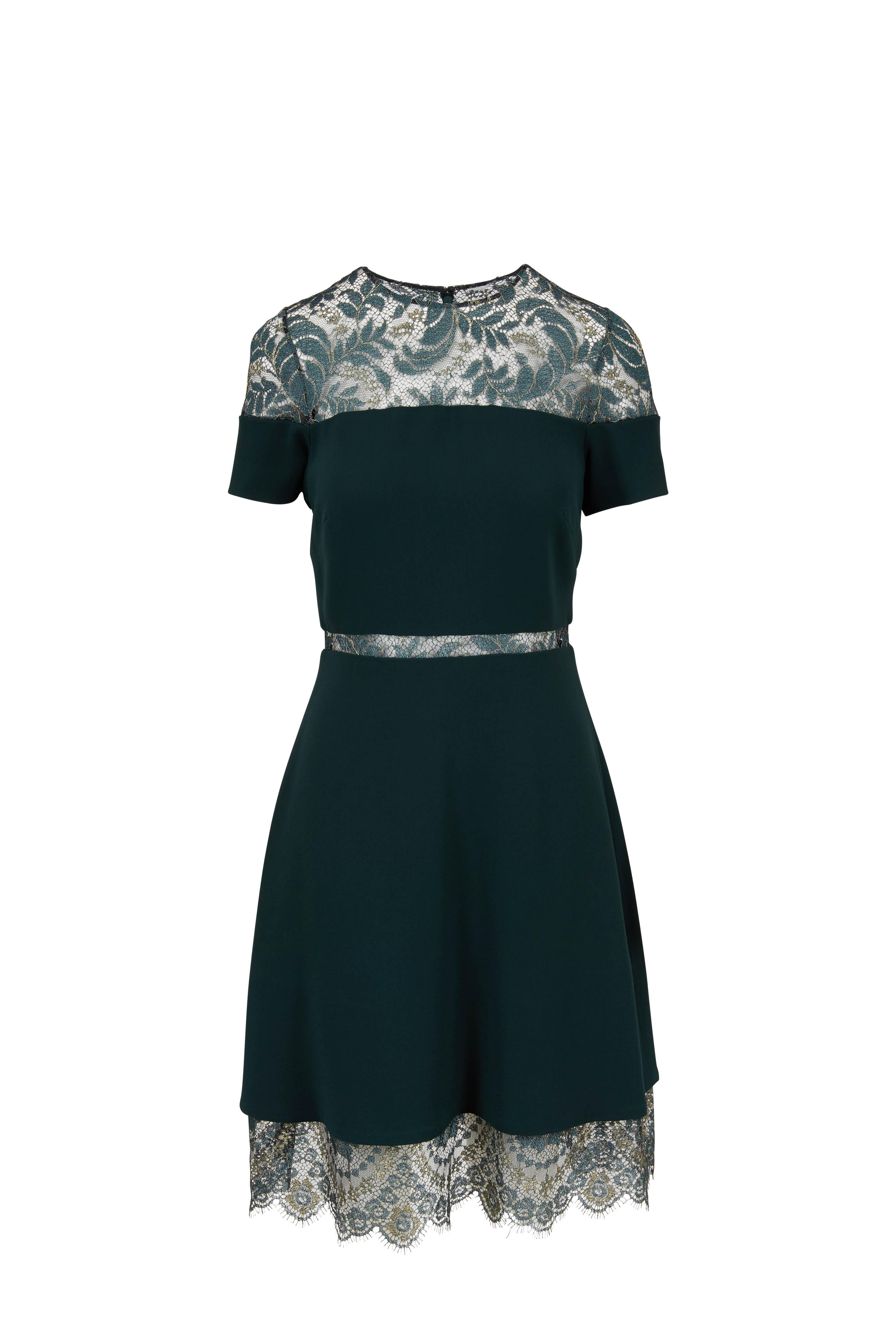 Round neckline. Concealed zip back closure. Lace trim at neck, waist and hem. A-line skirt. Made in the USA. 51% viscose, 46% acetate, 3% elastane; trim: 40% polyamide, 40% viscose, 20% metallic; lining: 100% silk. Dry clean.
