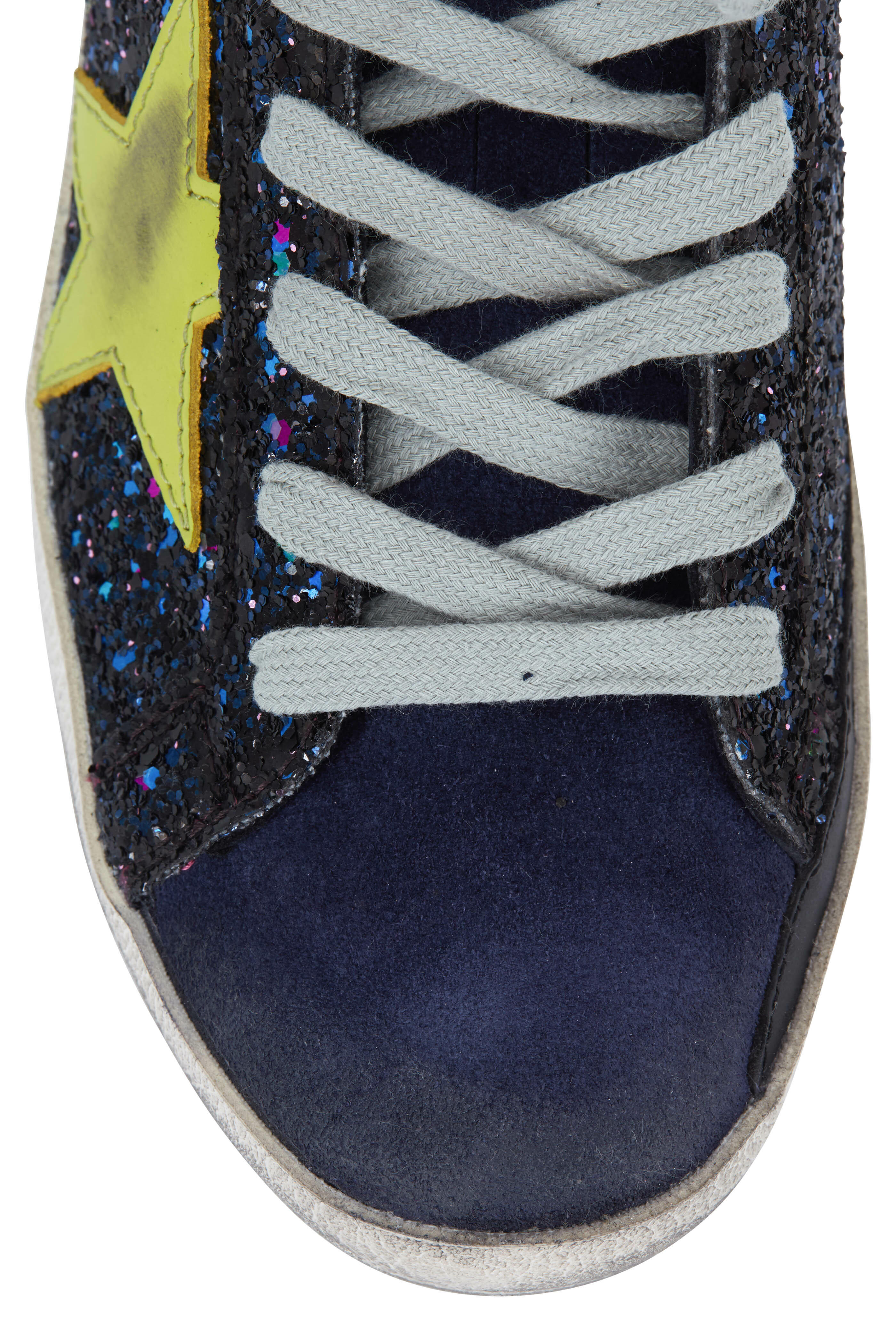 Glitter coated with leather trim upper. Round toe. Lace-up closure. Distressed green star detail. Contrast leather back heel. Unlined, detachable cushioned insole. Rubber sole. Made in Italy.
