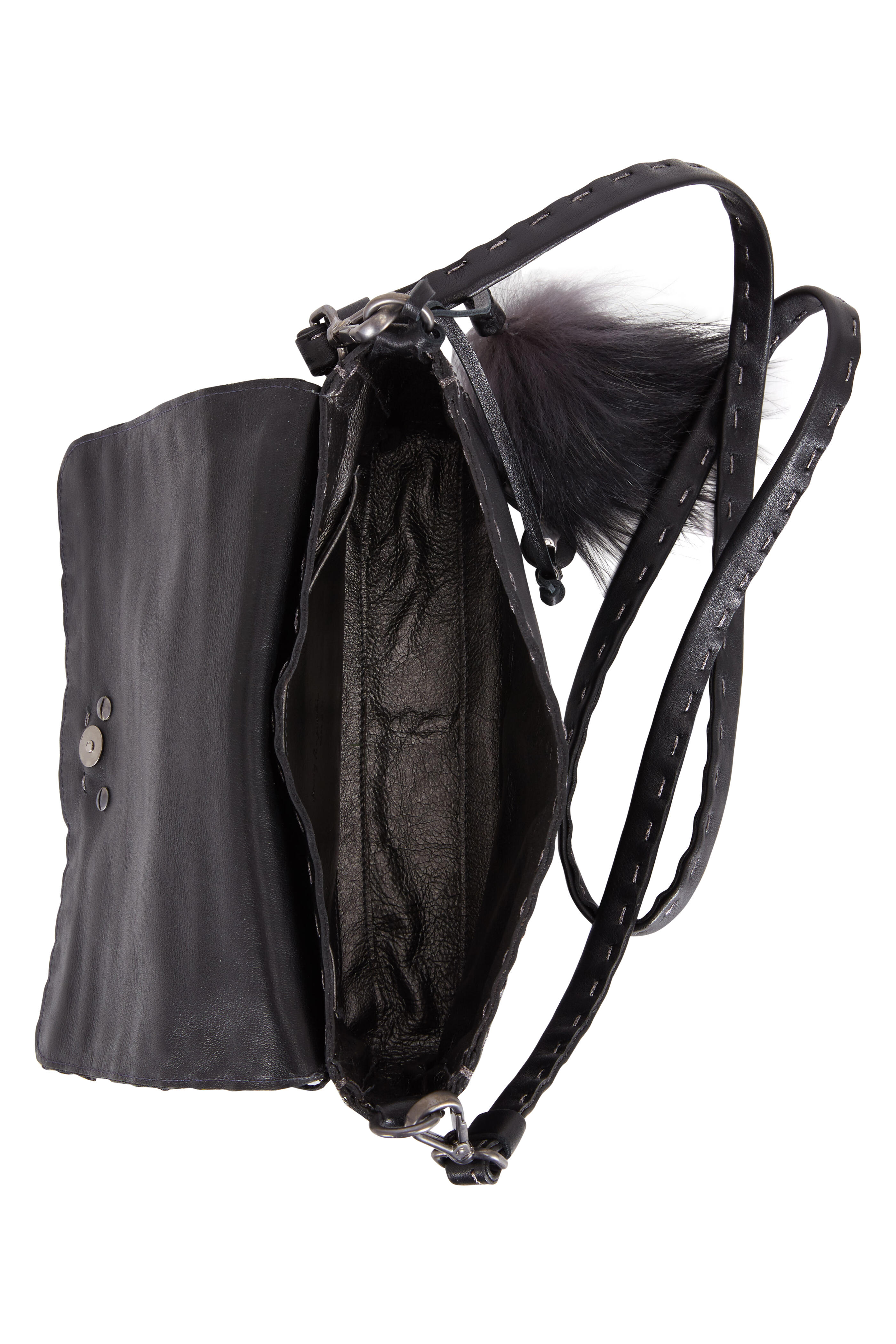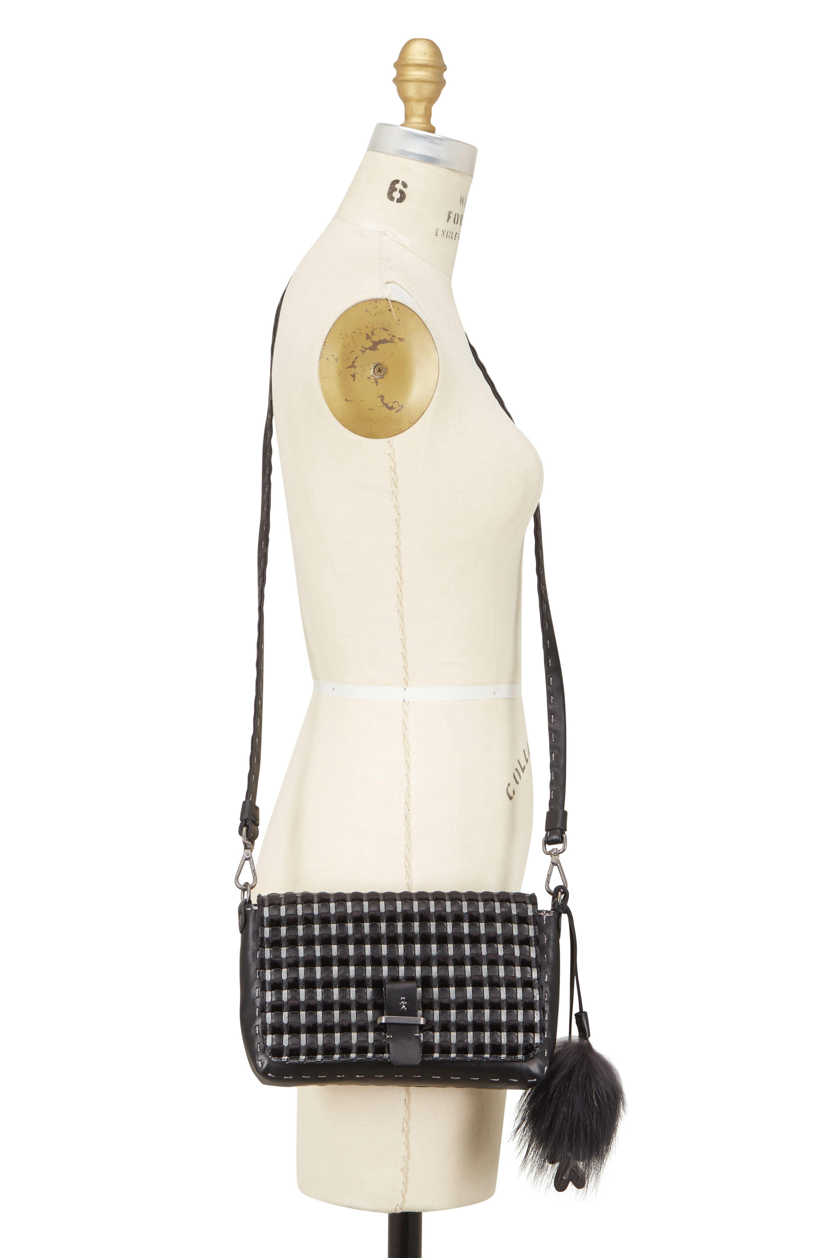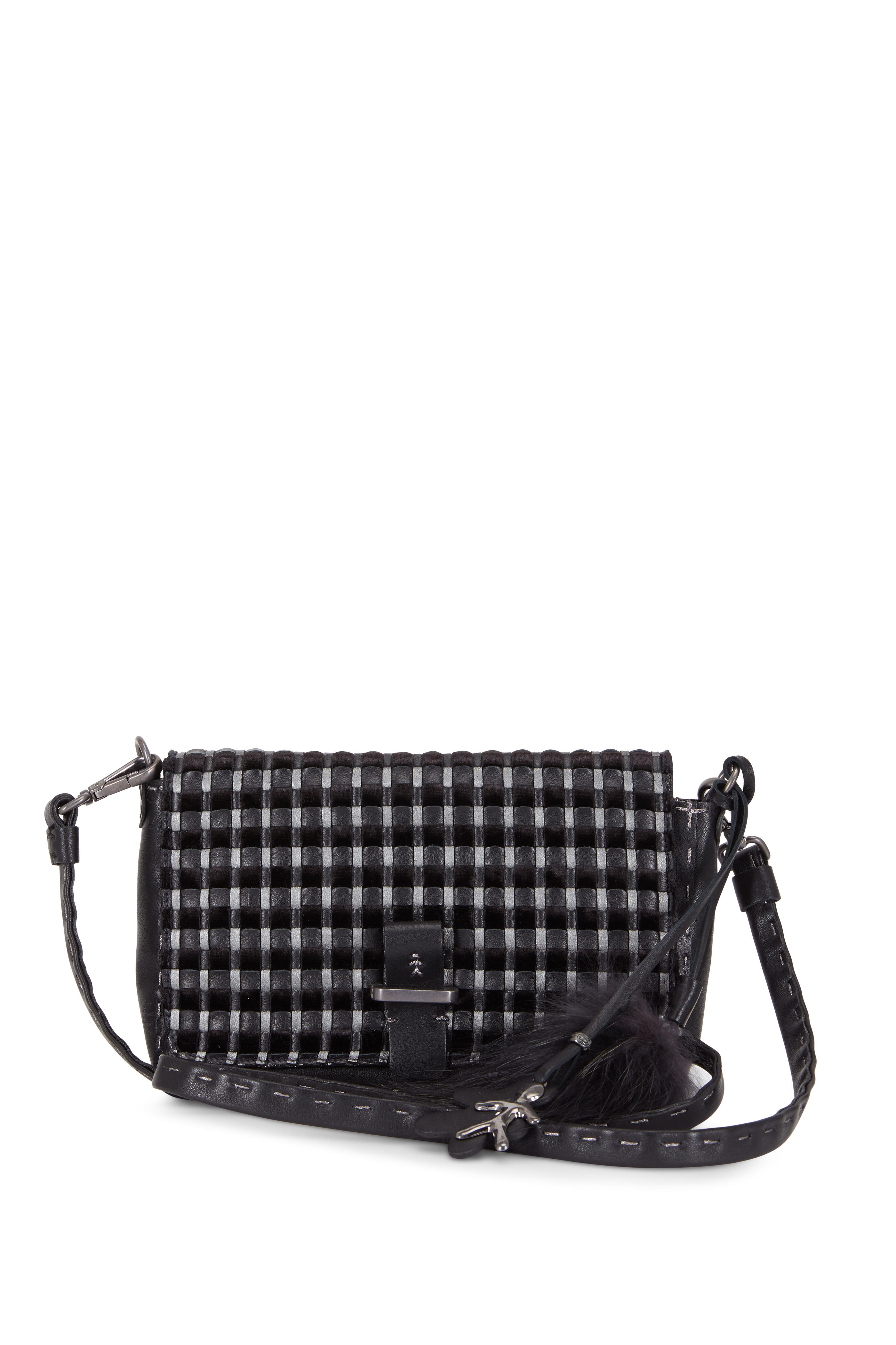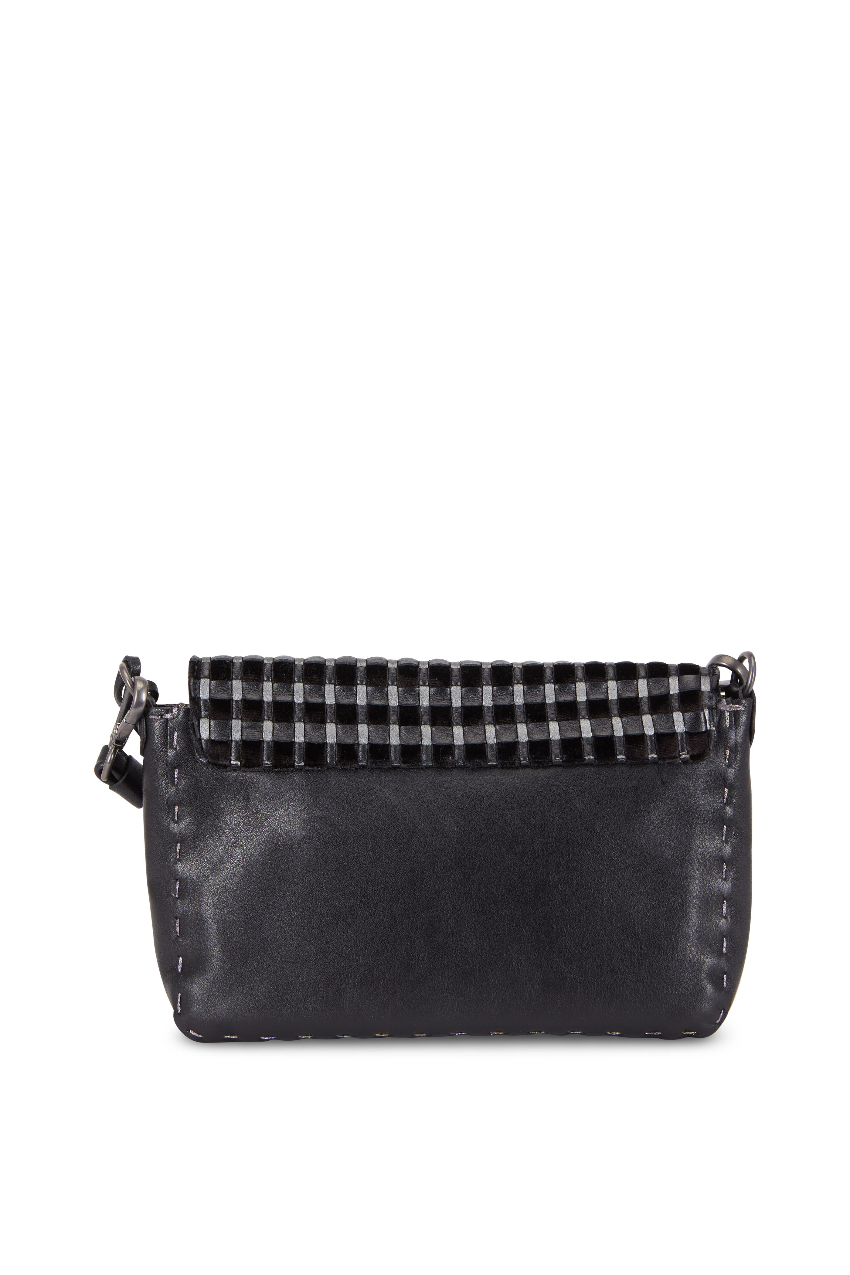 Smooth leather and woven leather and velvet. Detachable shoulder strap. Flap front; magnetic snap closure. Contrast silver stitching detail. One interior slip pocket. Lined in metallic leather. Made in Italy. Width: 9". Height: 5". Depth: 2". Detachable strap drop: 24".