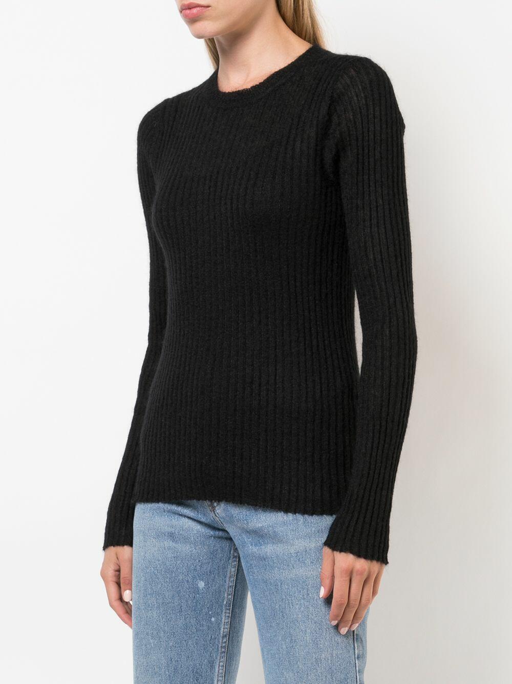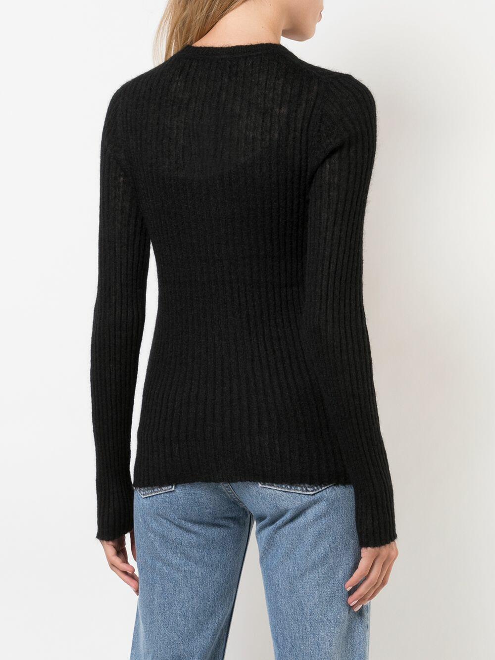Crew neckline. Imported. 65% mohair, 30% nylon, 5% wool. Dry clean.
