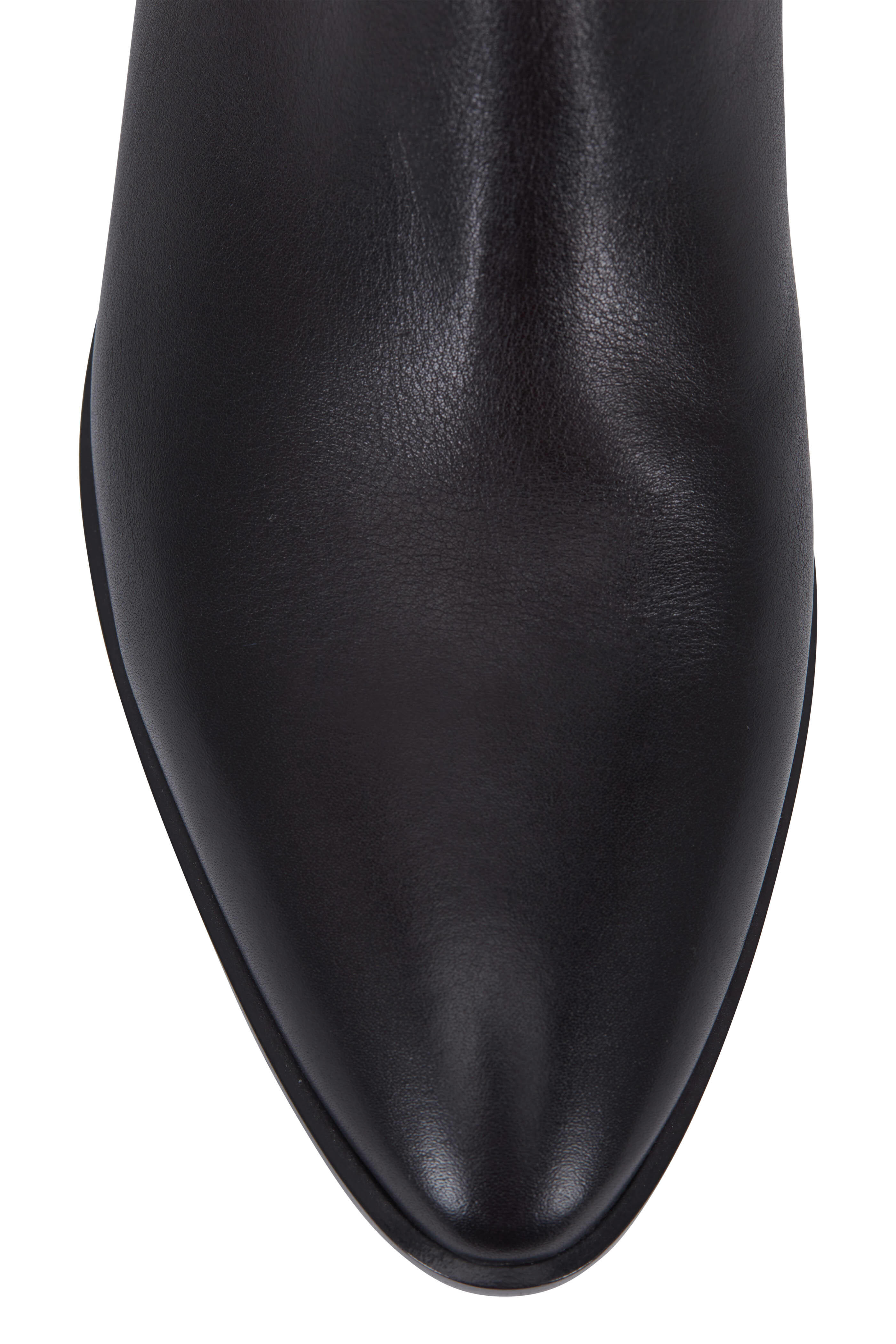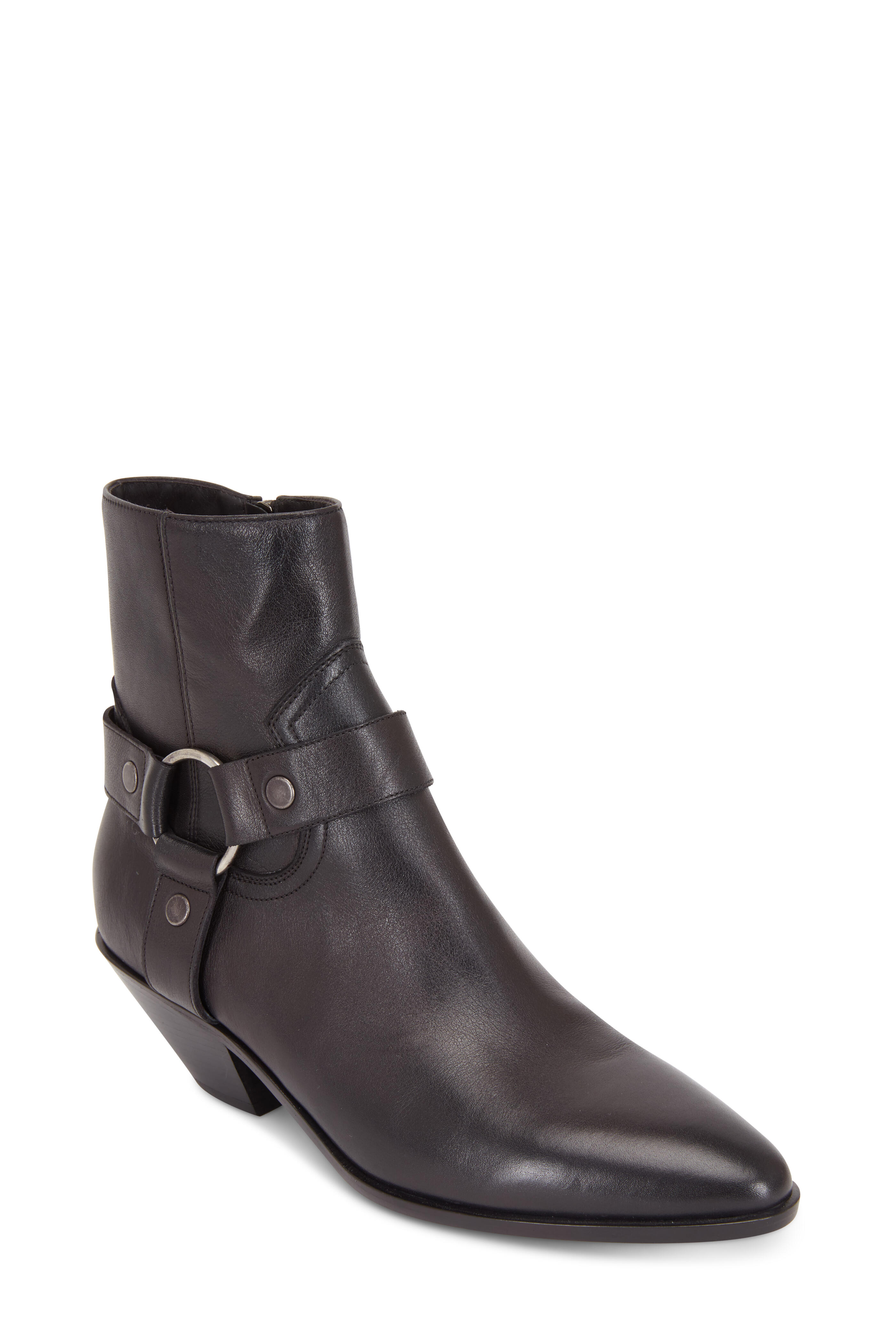 Calfskin leather. Almond toe. Side zip closure. Harness strap; snap closure. Leather lining and insole. Curved stacked heel. Leather sole. Made in Italy. Heel measurement: 45mm (2").