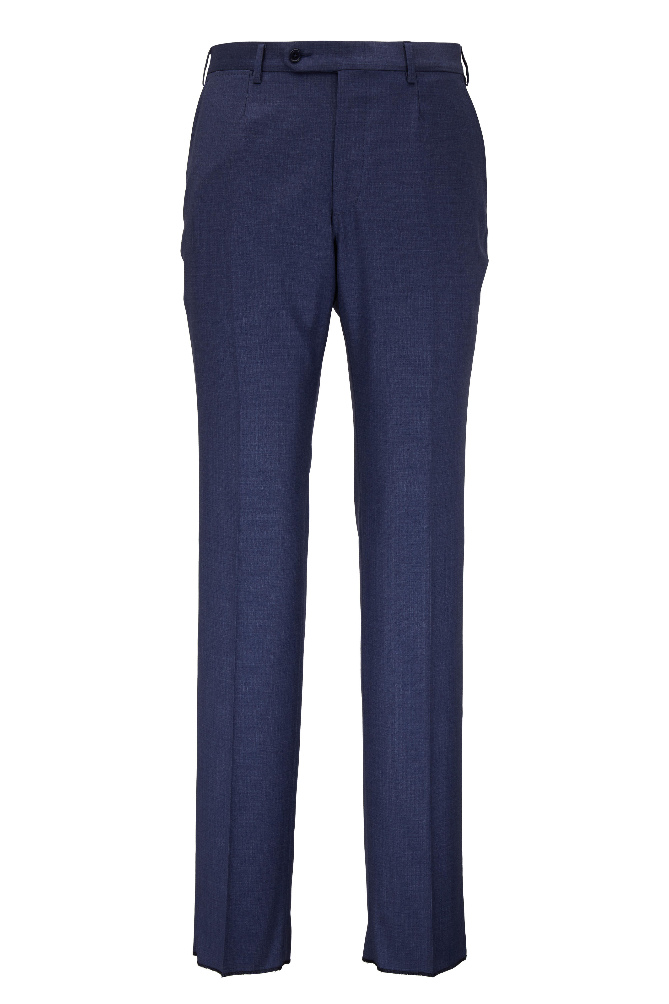 Made in Italy. Jacket: Fully lined. Notched lapels. Two button front closure. Chest welt pocket, lower flap pockets. Double vent. Pants: Two side slash pockets, two back button-besom pockets. Unfinished hem. 100% wool. Dry clean.