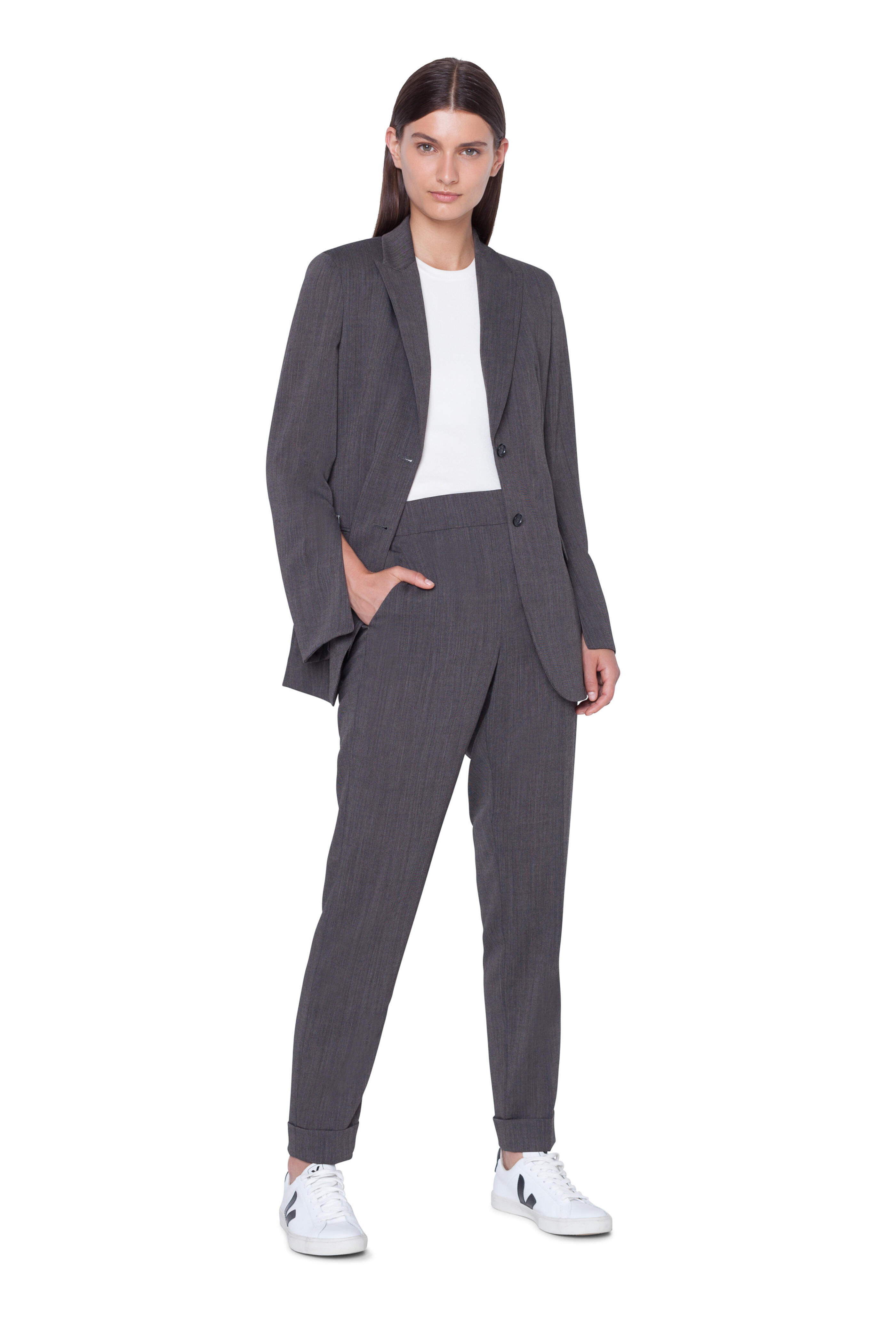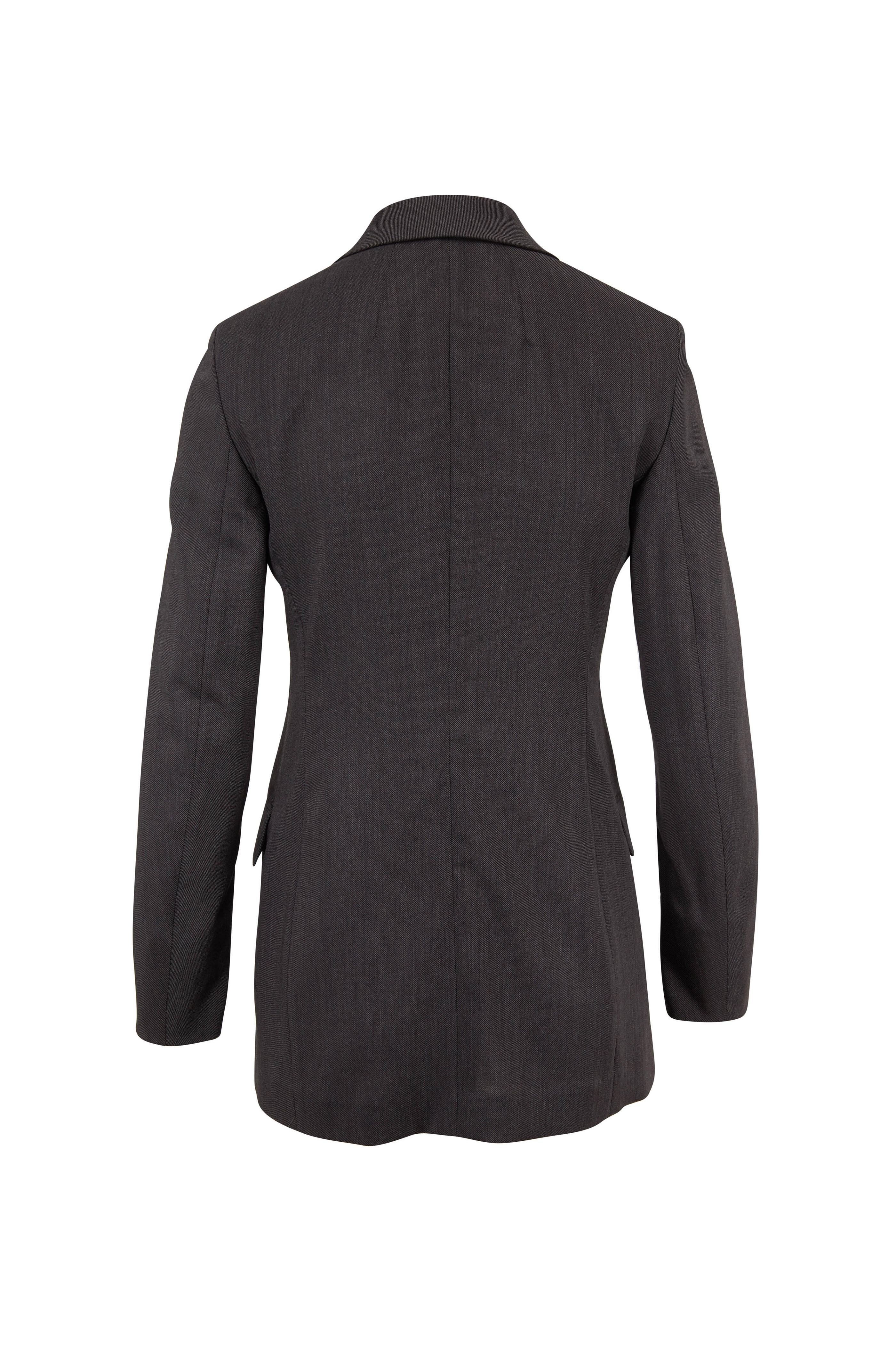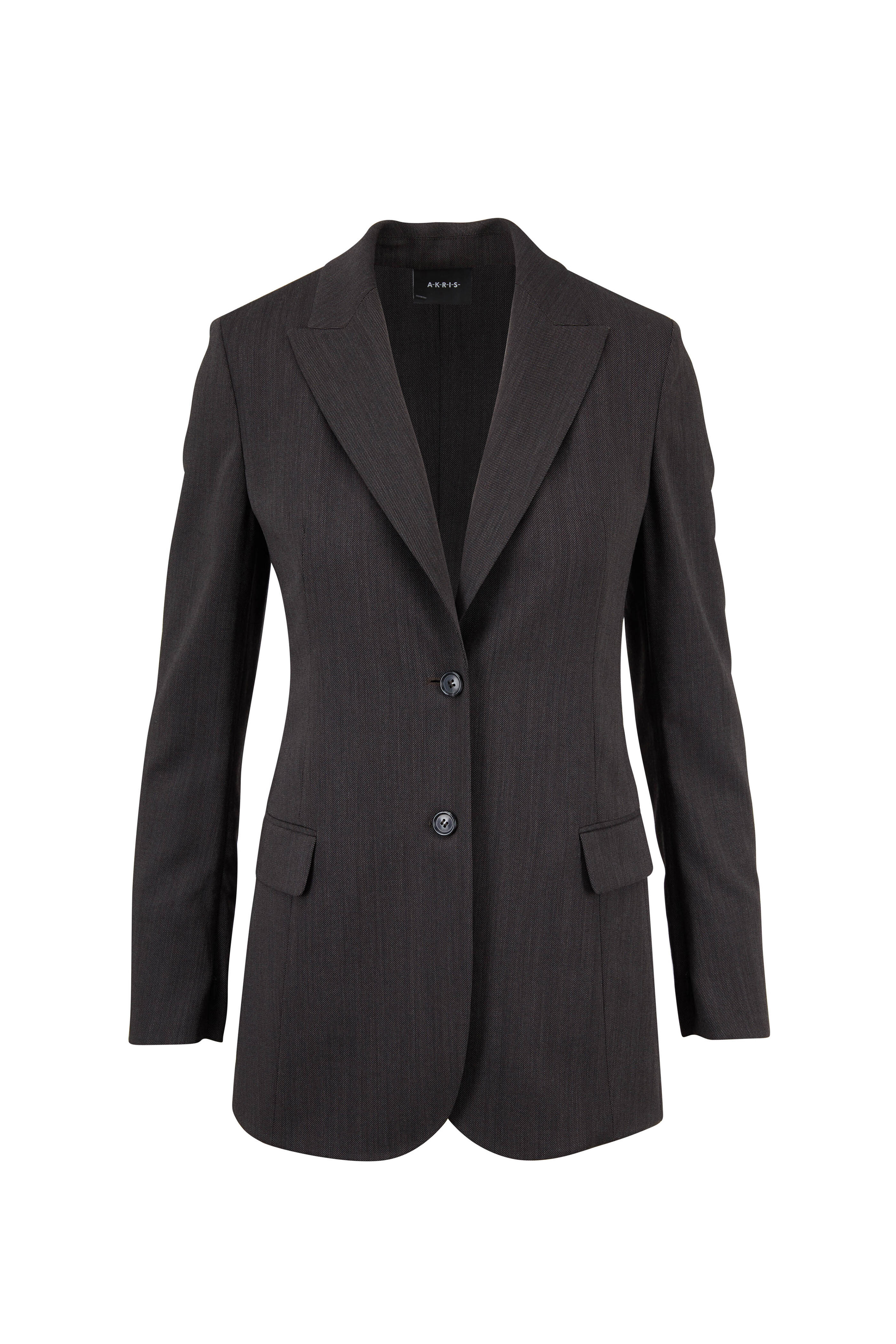 Peak lapels. Two button front closure. Waist flap pockets. Concealed zip cuffs. Imported. Fitted silhouette. 100% wool. Dry clean.