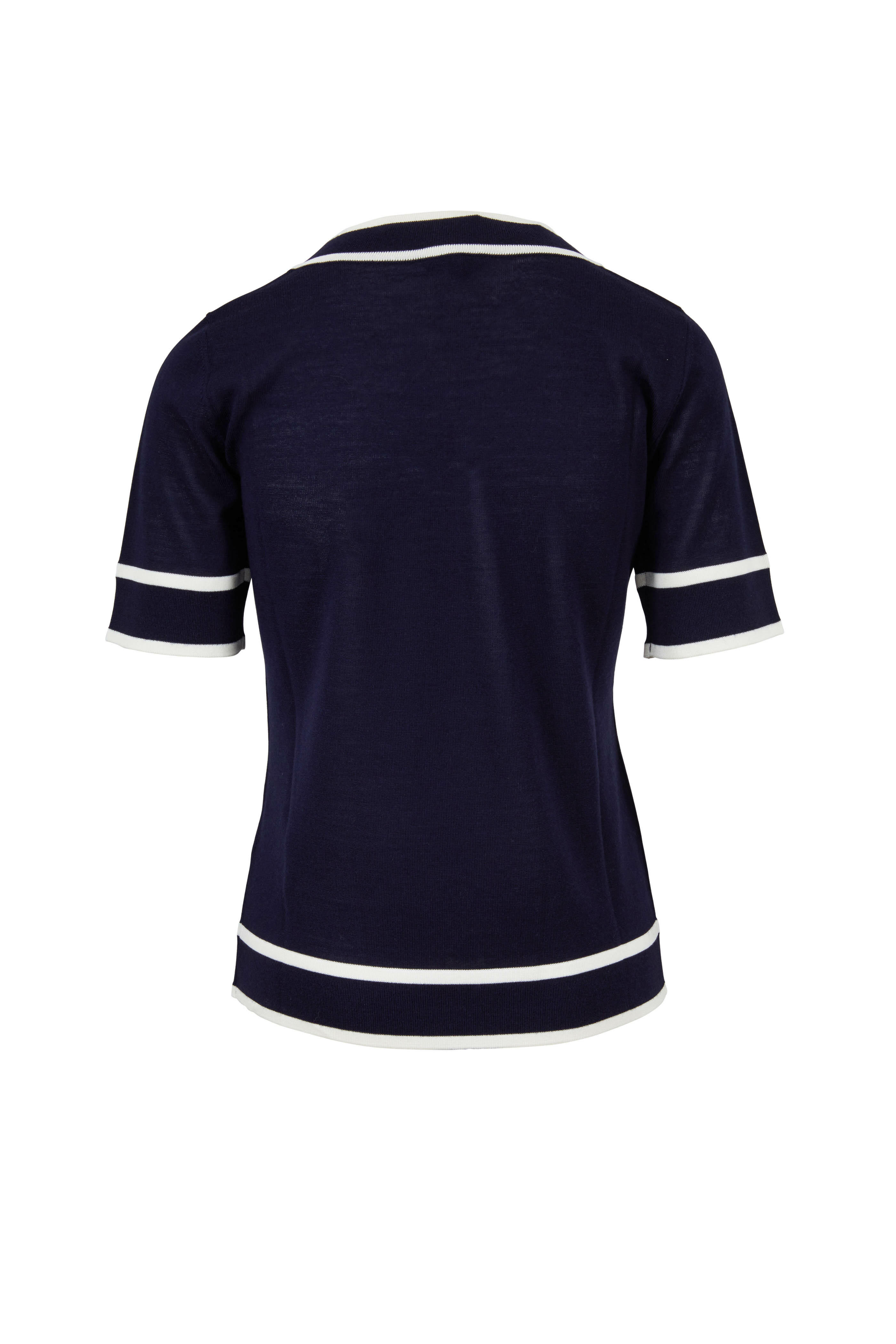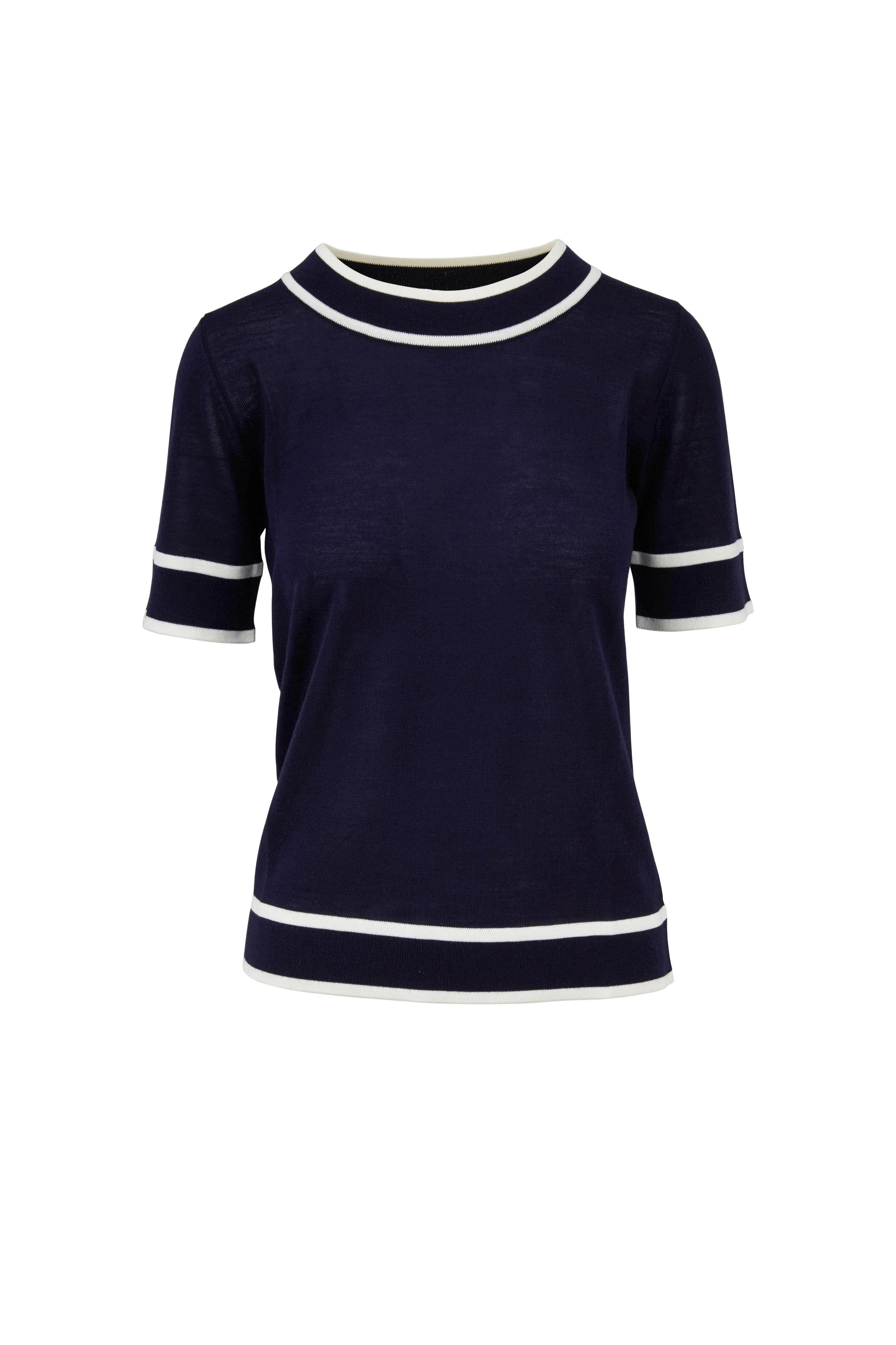 Tipped crew neckline. Ribbed trim. Made in Italy. 100% virgin wool. Dry clean.