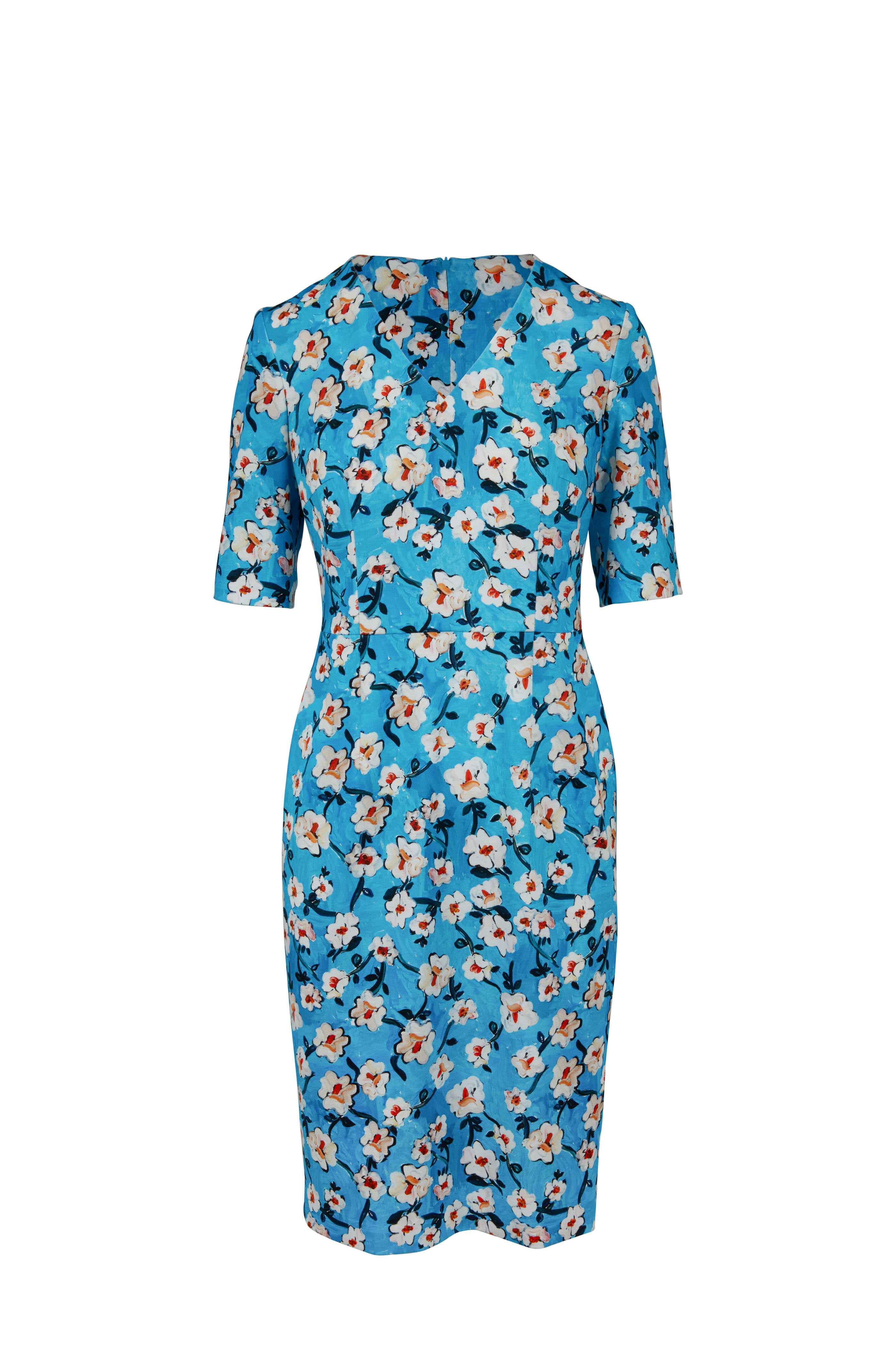 V-neckline. Concealed back zip. Back vent. Bust darts. Imported. 40" shoulder to hem. 95% viscose, 5% elastane; fully lined. Dry clean.