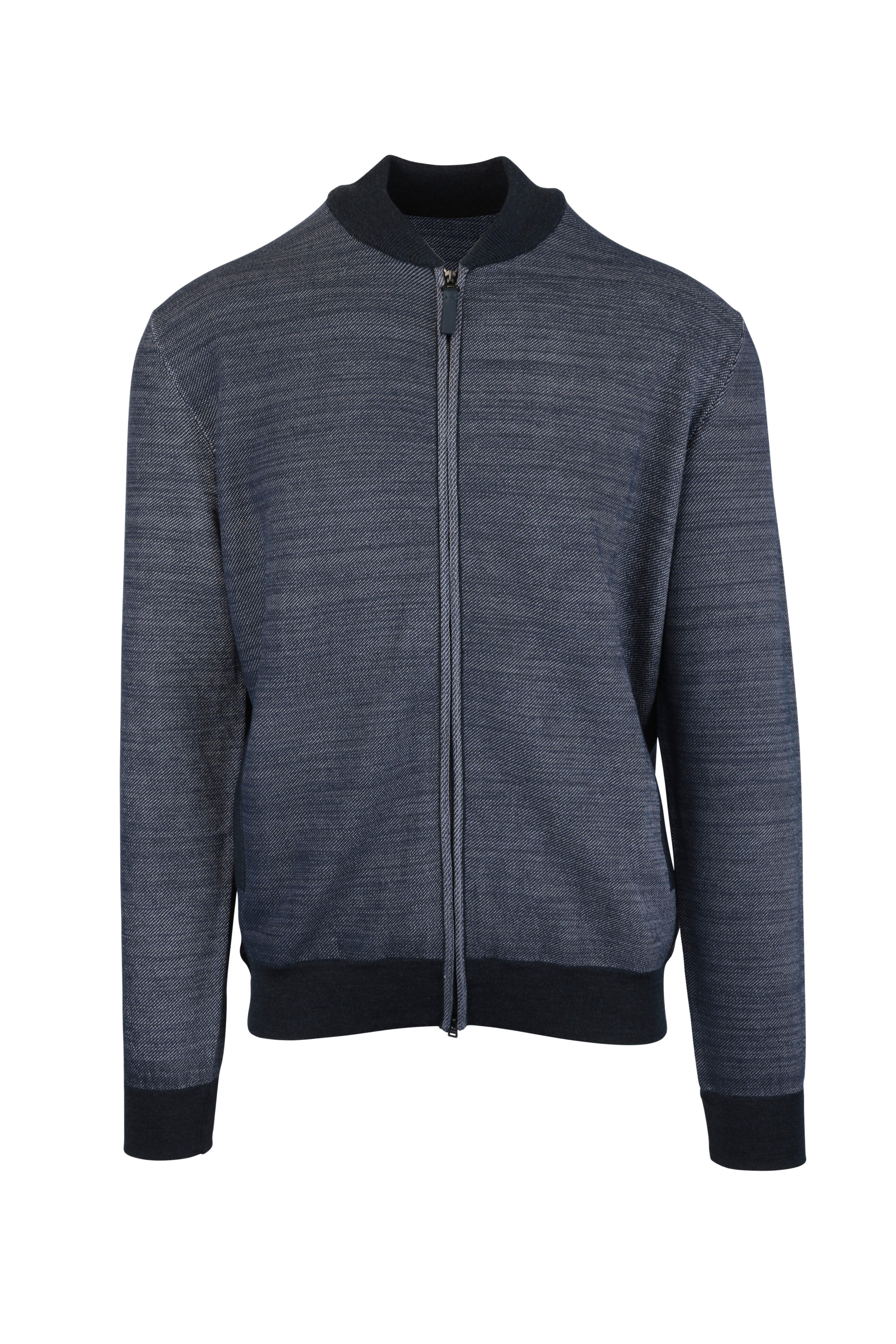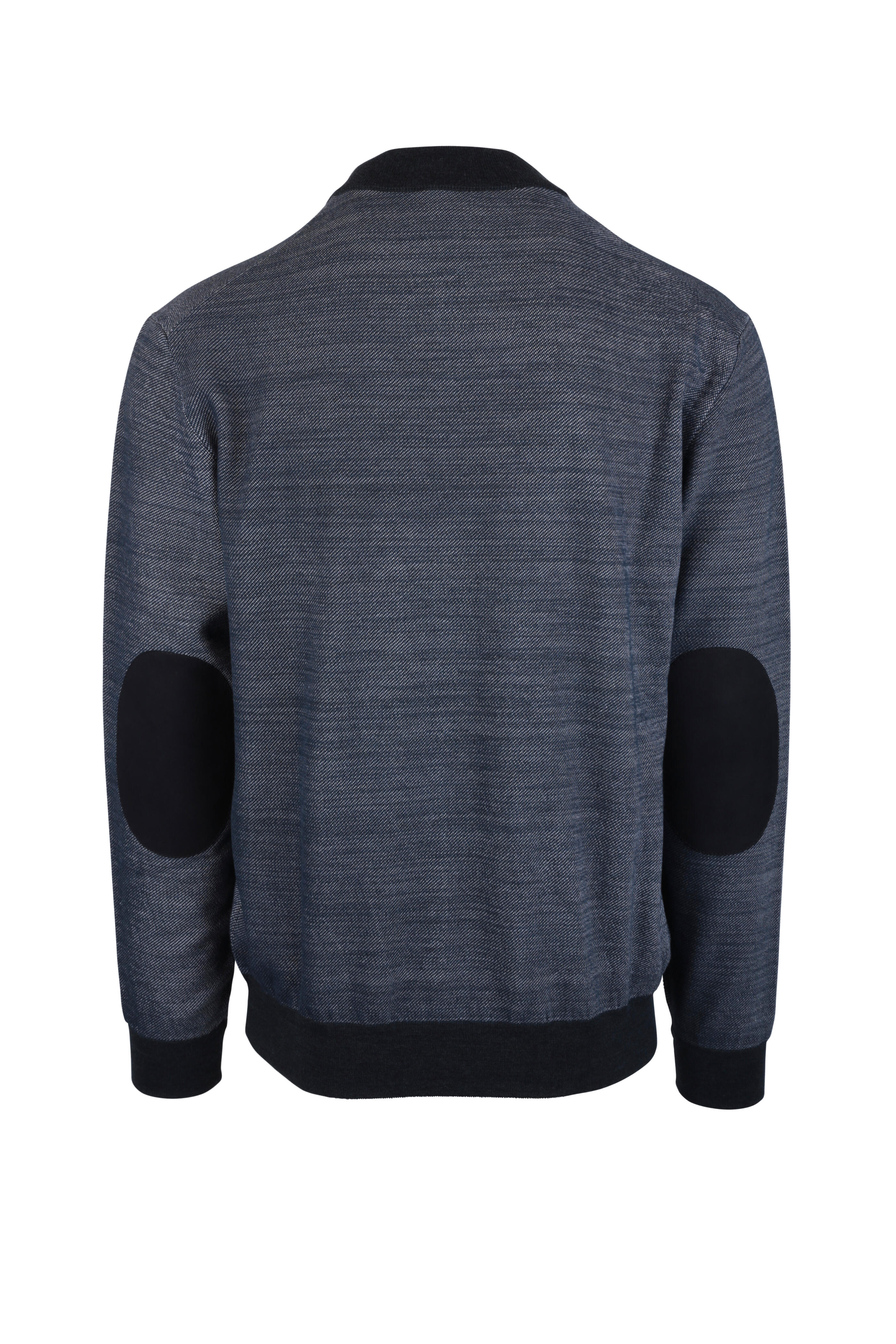 Baseball collar. Full zip closure. Elbow patch detail. Ribbed trim. Made in Italy. 70% wool, 30% silk. Dry clean.