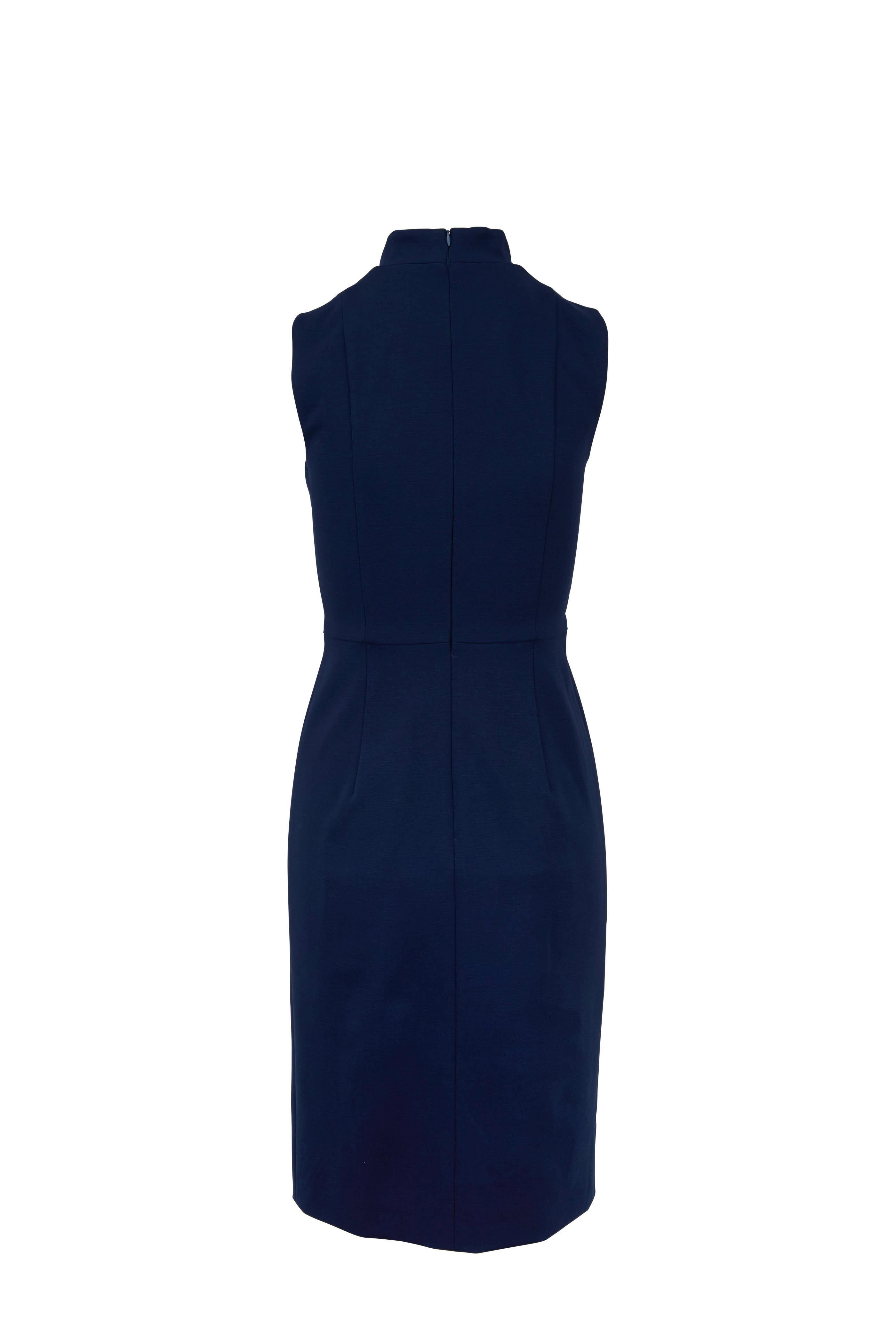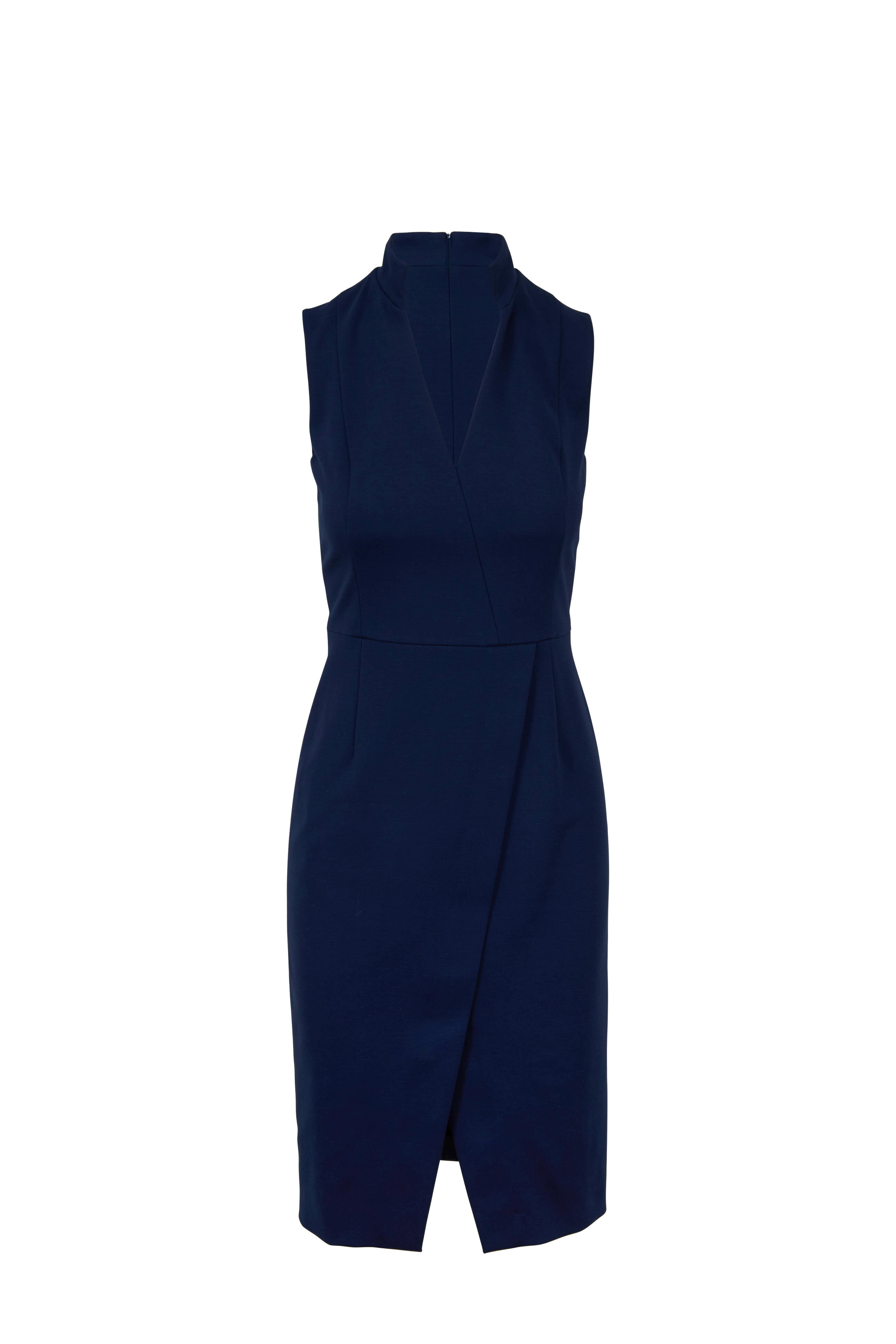 Stand collar; v-neckline. Concealed back zip closure. Banded at natural waist. Mock wrap skirt. Center slit. Imported. 40" shoulder to hem. 69% viscose, 25% nylon, 6% elastane. Dry clean.