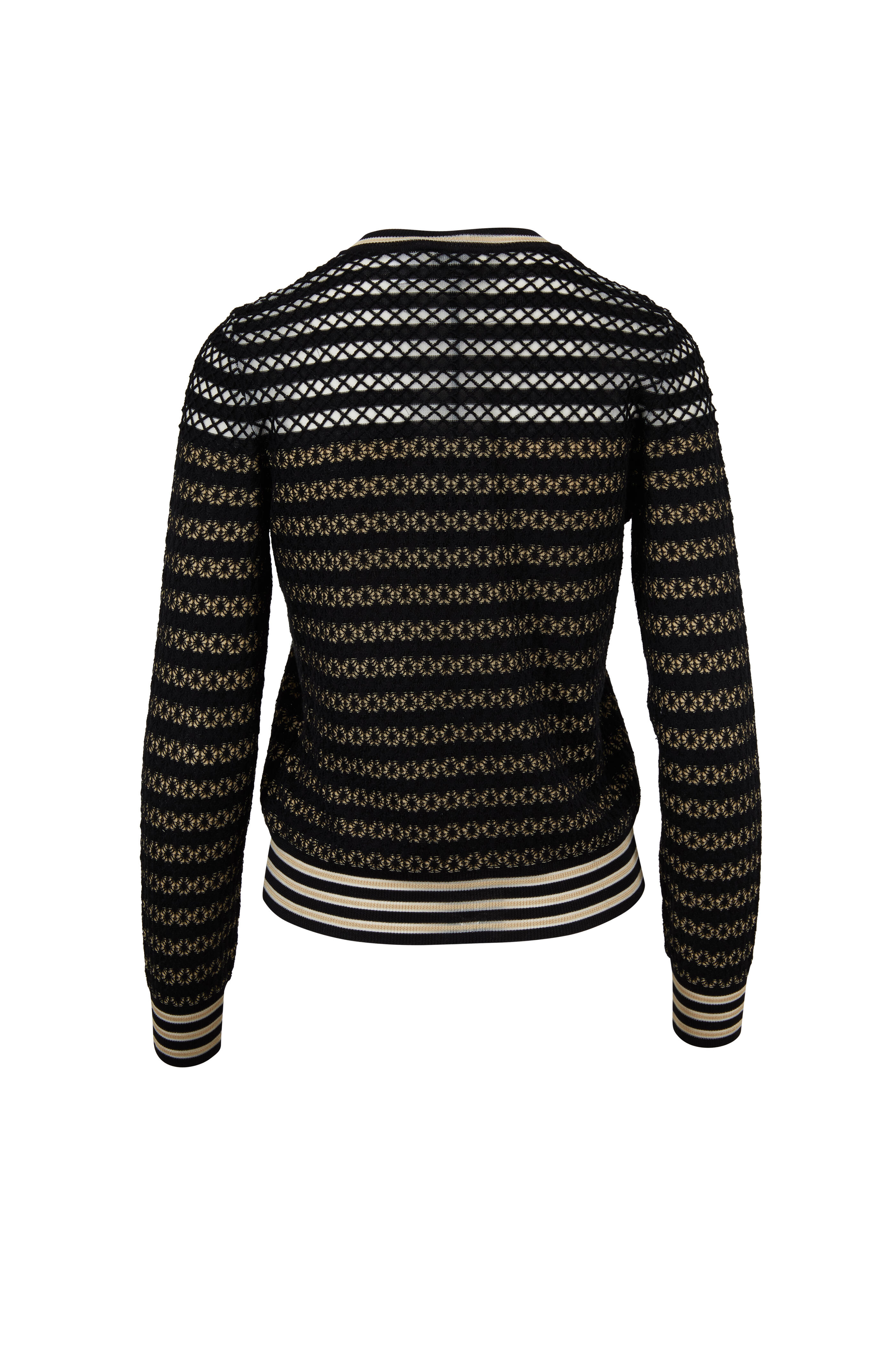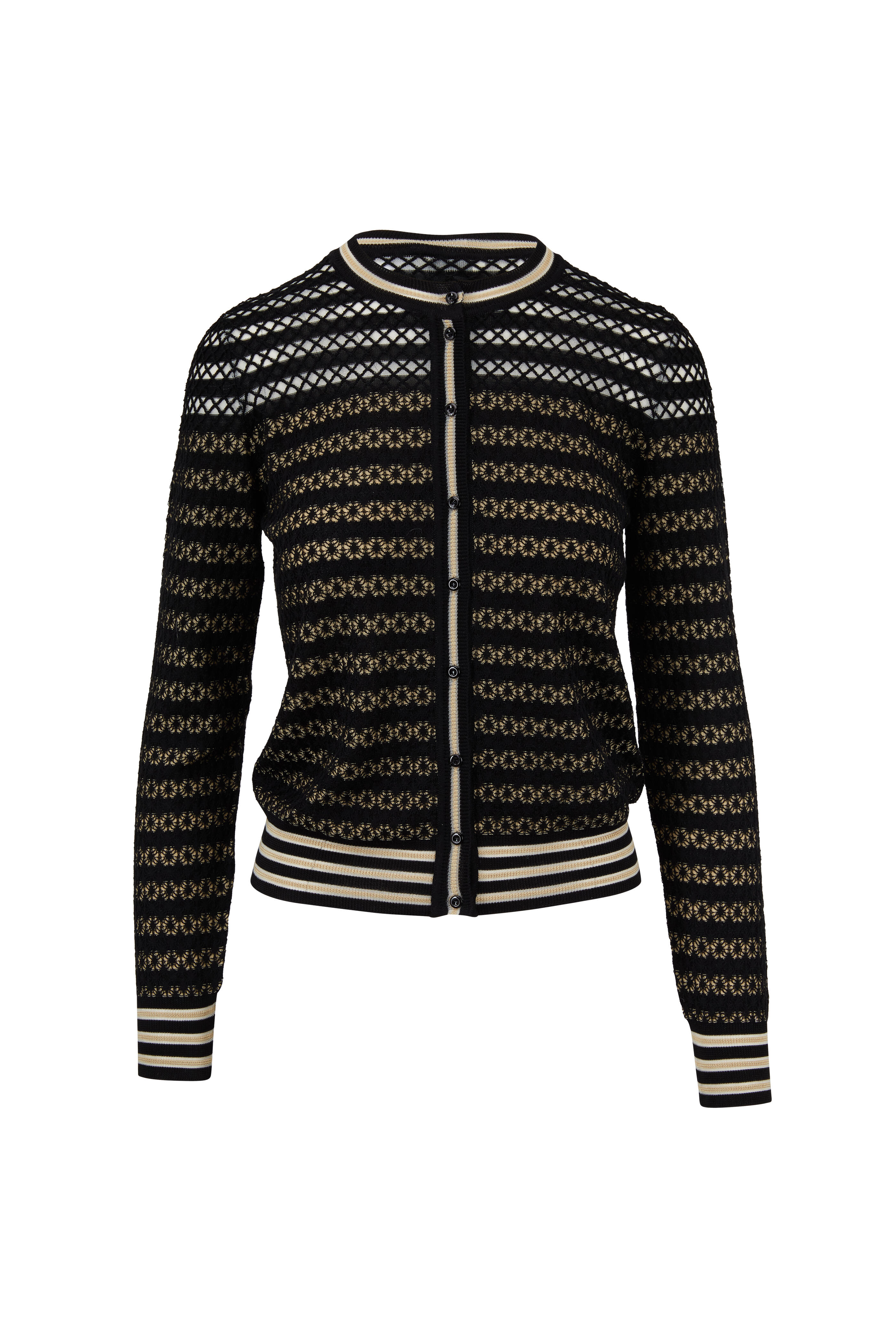 Contrast striped jewel neckline. Front button placket. Contrast striped trim. Made in Italy. 92% silk, 6% nylon, 2% polyester. Dry clean.