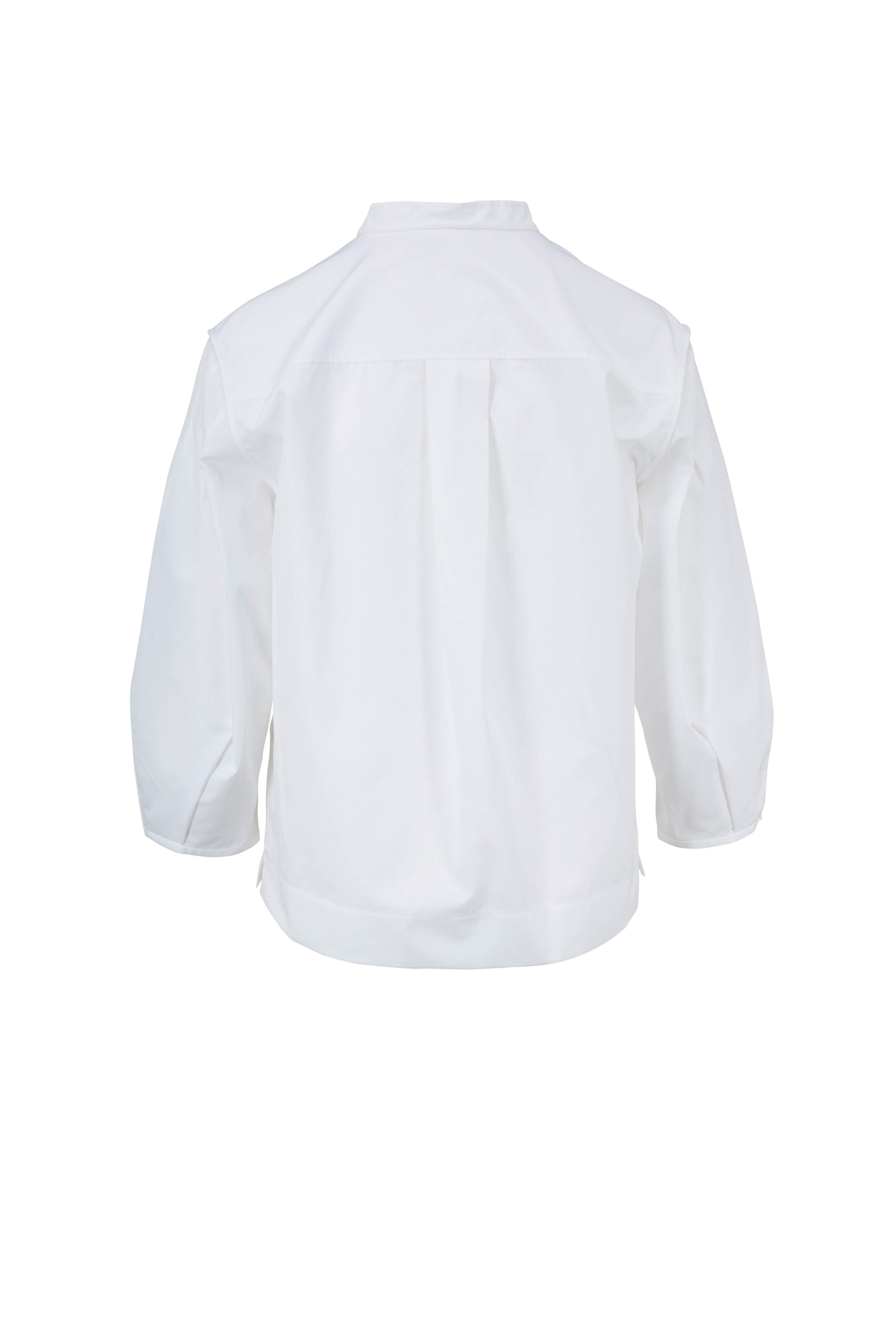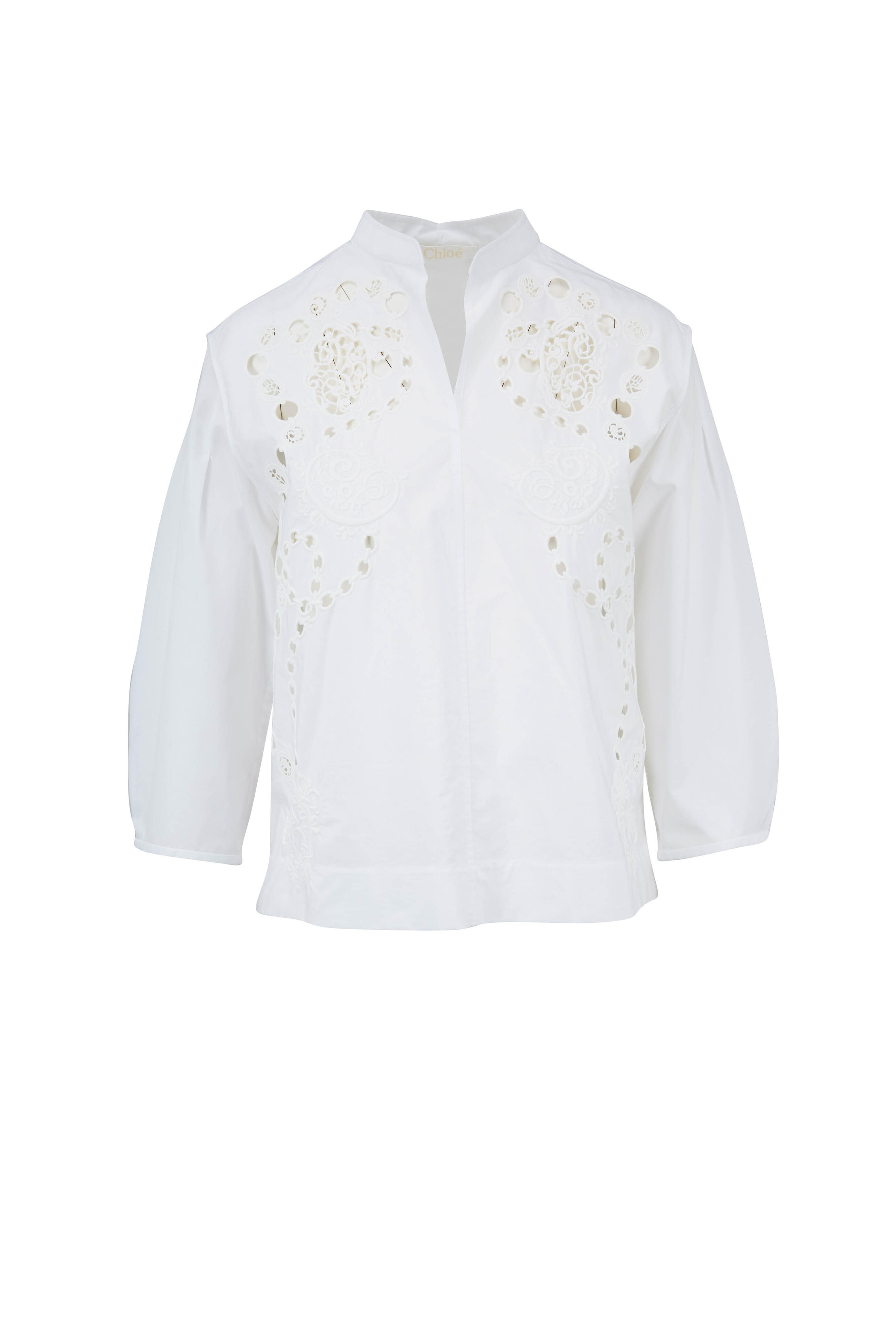 Mandarin collar. Split neckline. Eyelet and embroidery detailing. Slip over style. Center back inverted pleat. Single button; keyhole cuffs. Side slits. Imported. 100% cotton. Dry clean.