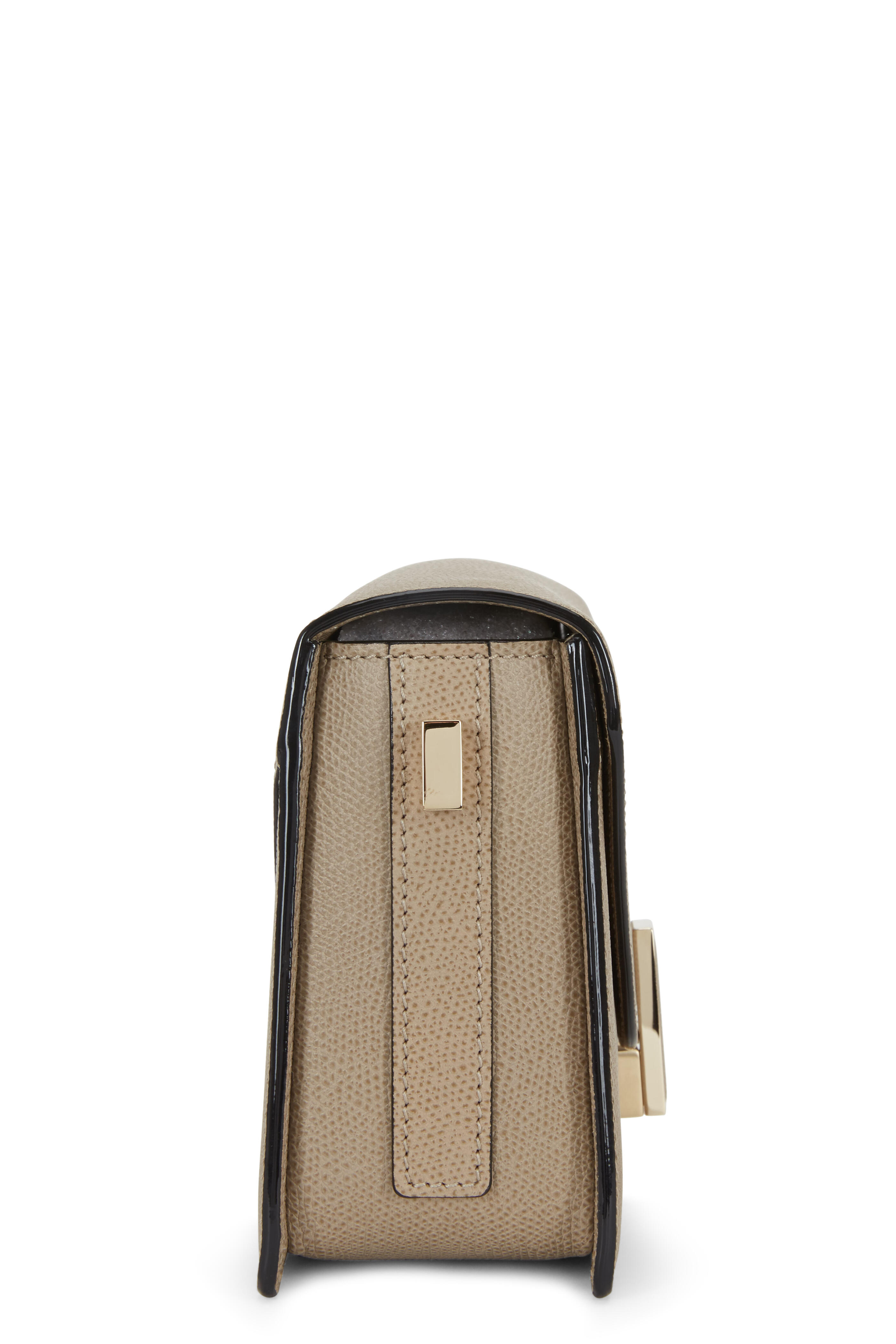 Saffiano leather. Flat shoulder strap. Flap front; turn-lock closure. One interior slip pocket. Hand painted edges. Lined in leather. Made in Italy. Width: 9". Height: 5 ½". Depth: 3". Strap drop: 20".