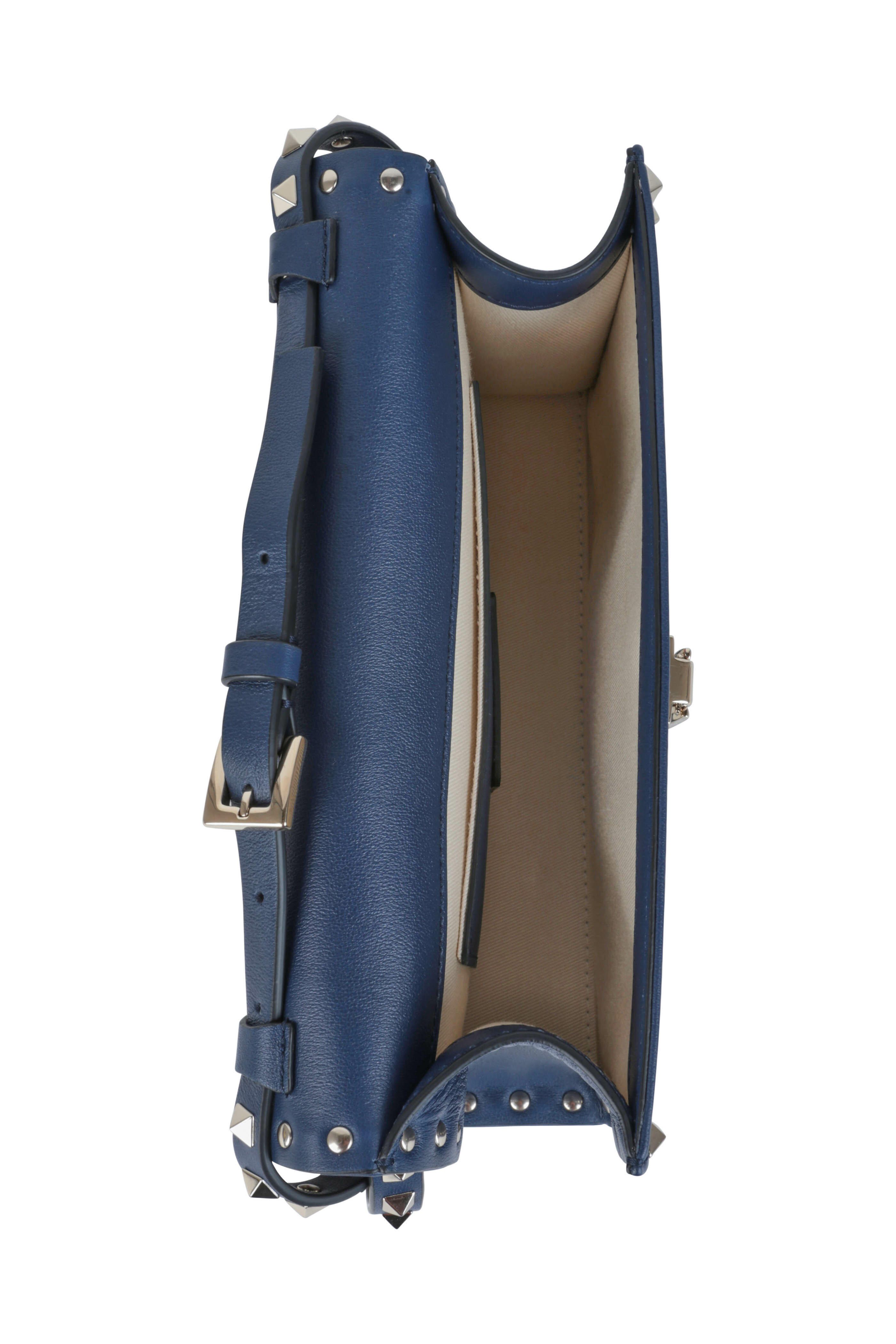 Leather. Removable and adjustable flat leather stud shoulder strap. Flap front with flip-lock closure. Signature gold-toned rockstud frame. Interior slip pocket. Lined in fabric. Made in Italy. Width: 9". Height: 6". Depth: 2".