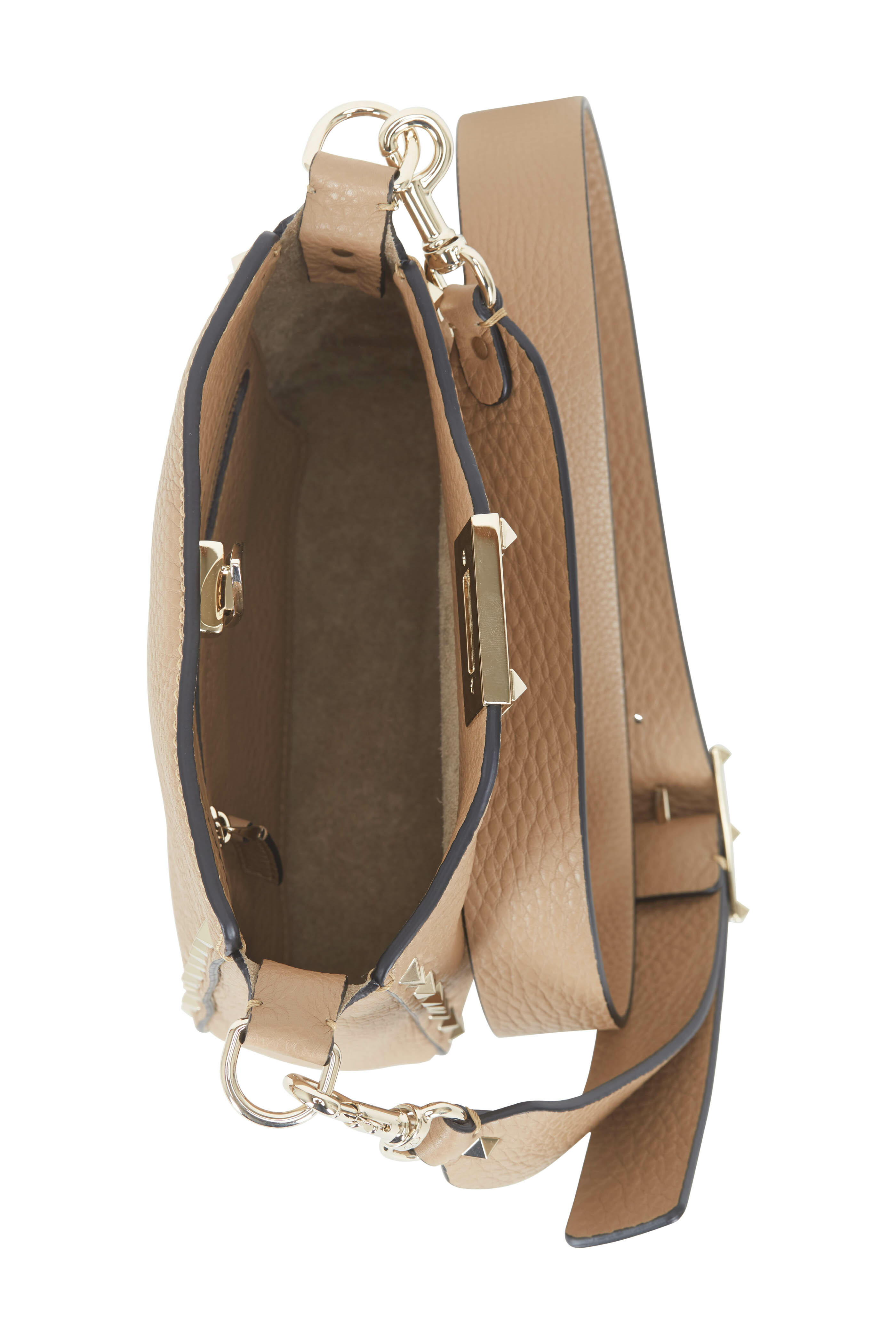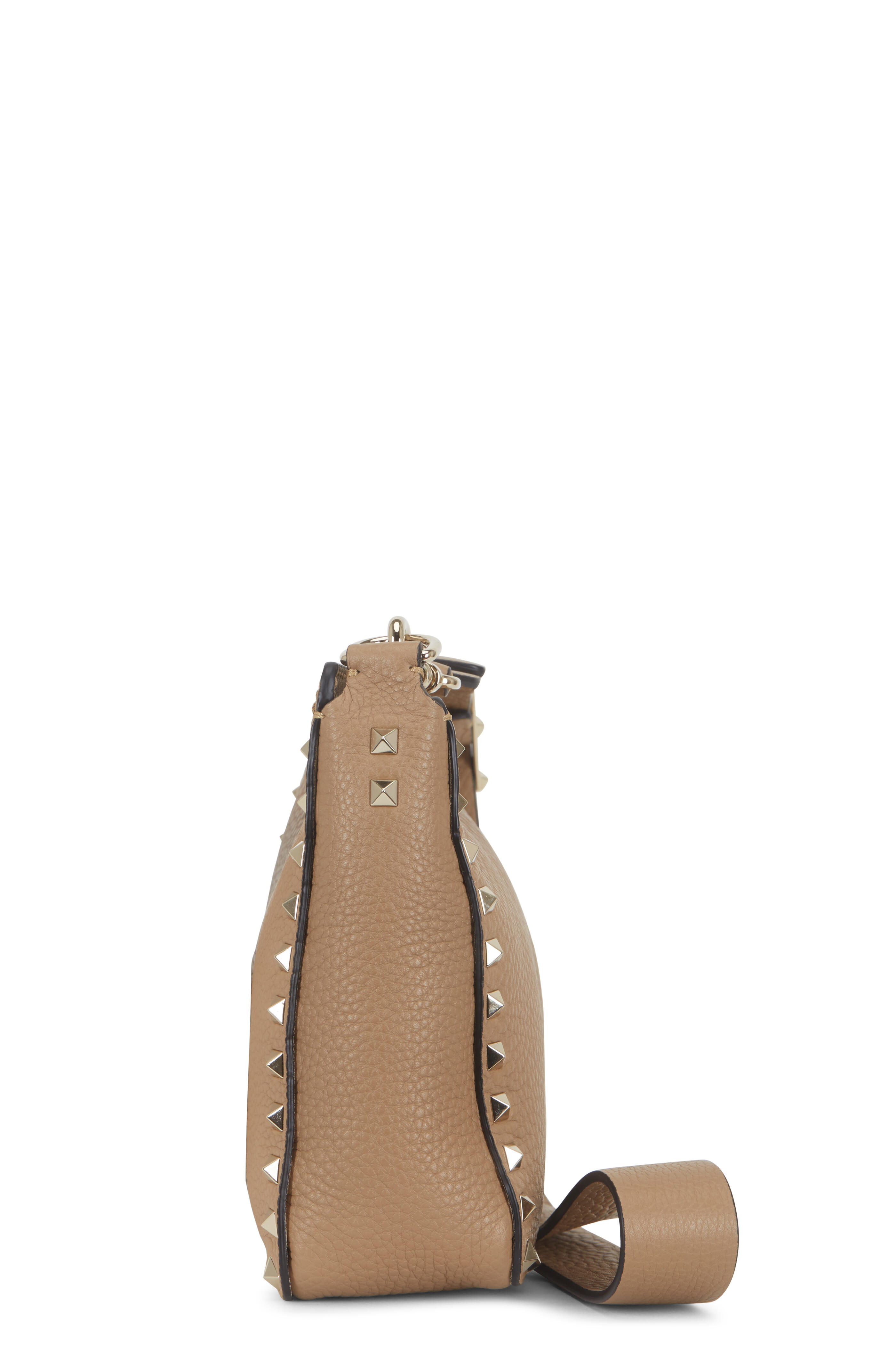 Grained calfskin leather. Adjustable flat crossbody strap. Flip-lock closure. Signature gold-toned rockstuds frame. One interior zipped pocket. Lined in suede. Made in Italy. Width: 7". Height: 7". Depth: 2 ½". Adjustable strap drop: 20".