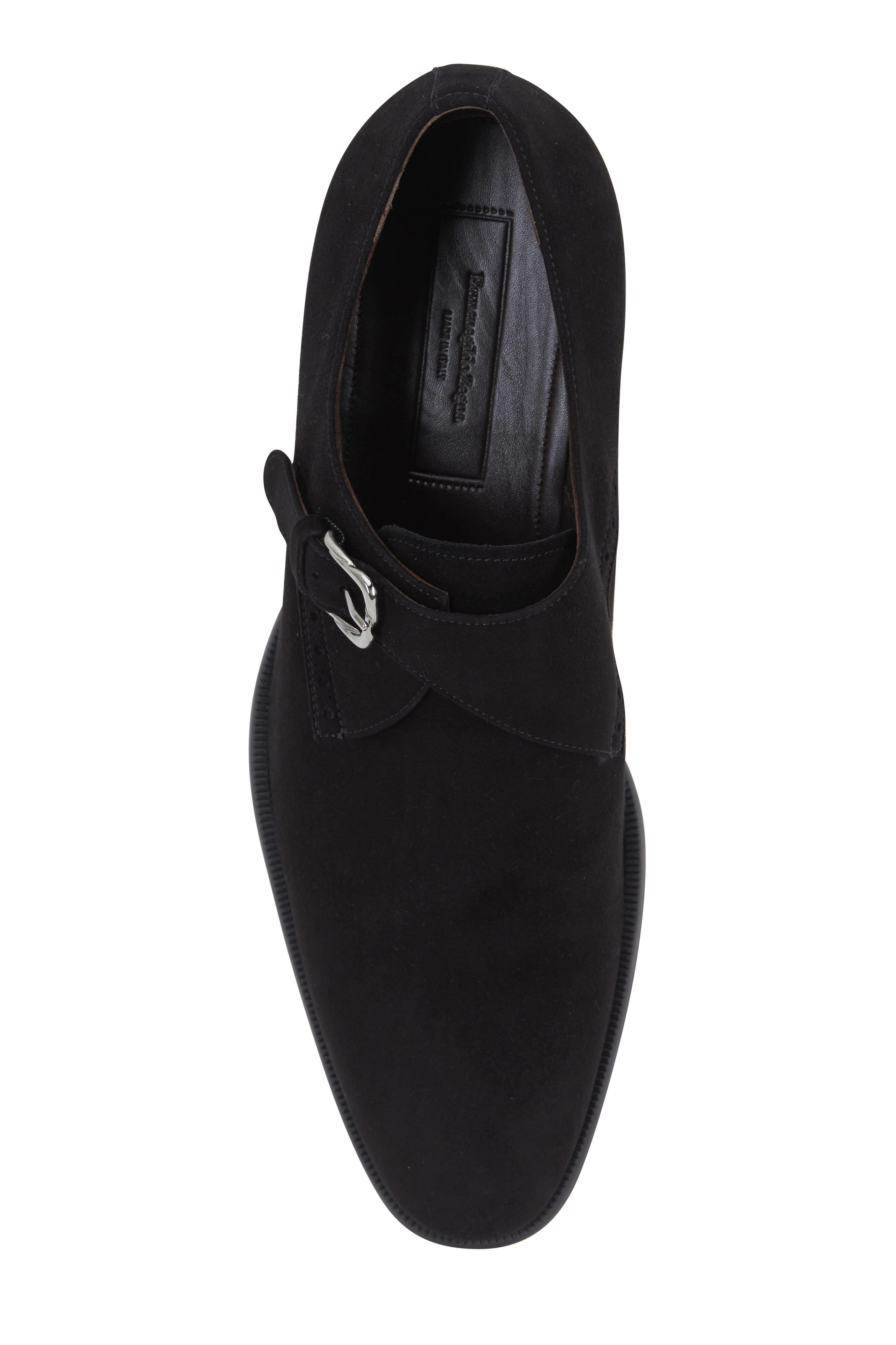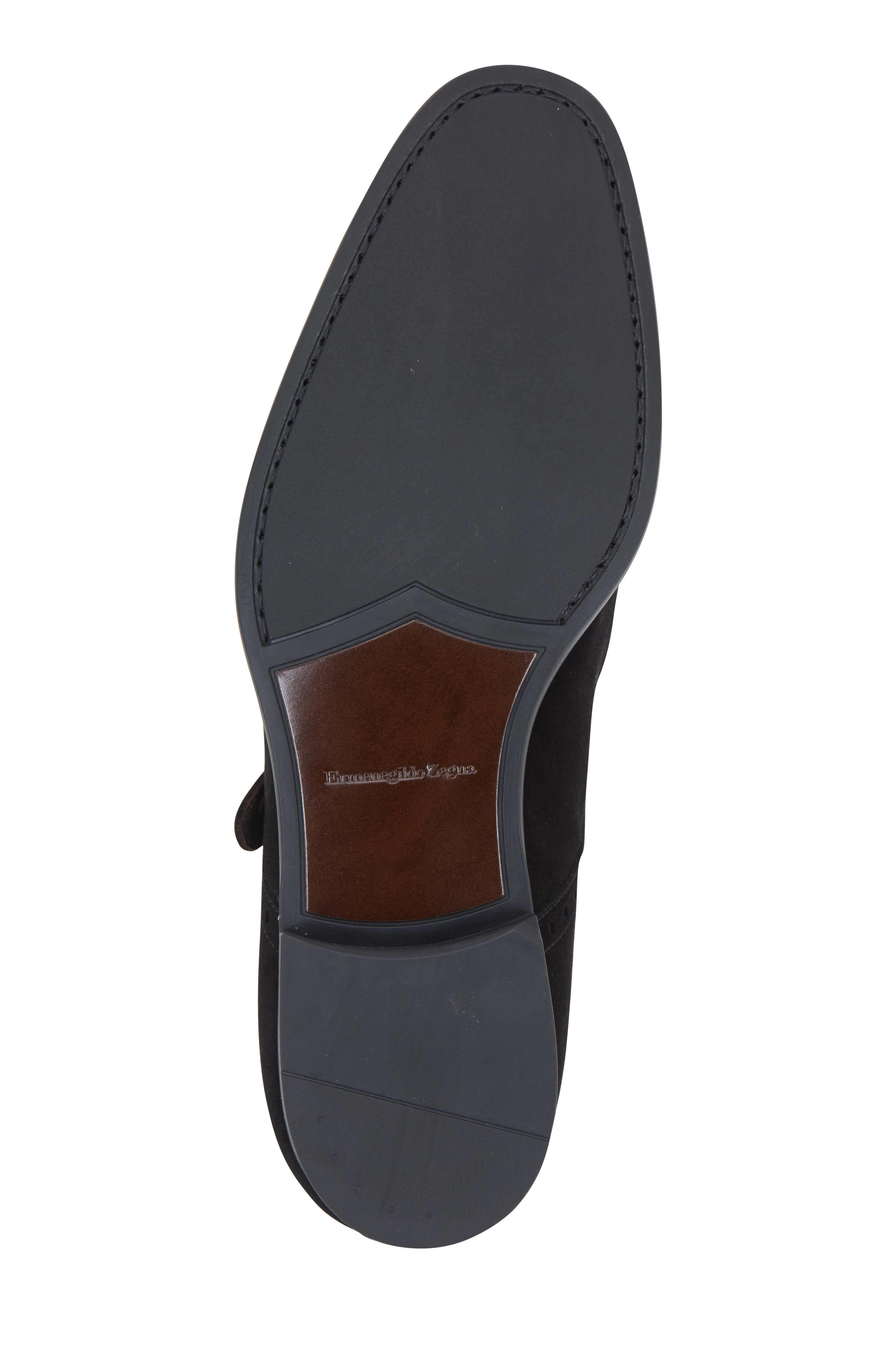 Calfskin suede upper. Tapered toe. Single monk strap; adjustable buckle. Brogue detailing. Leather lining and insole. Flexible rubber and leather sole. Made in Italy.