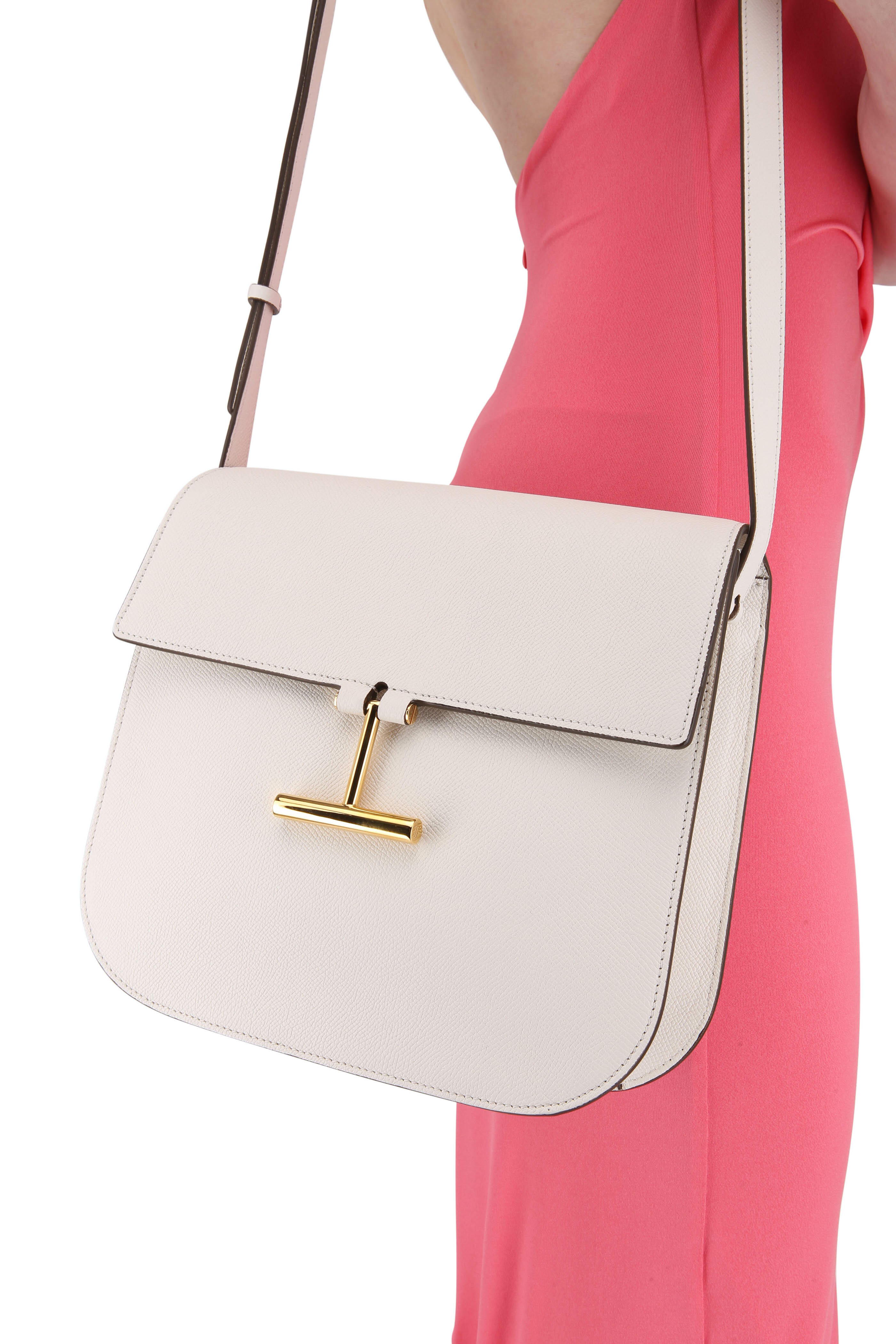 Grained calfskin leather. Adjustable shoulder strap. Front front; magnetic snap closure. Signature gold-tone T clasp. Exterior back slip pocket. One interior zip pocket. Lined in suede. Made in Italy. Width: 10". Height: 9". Depth: 3 ½". Adjustable strap drop: 22".