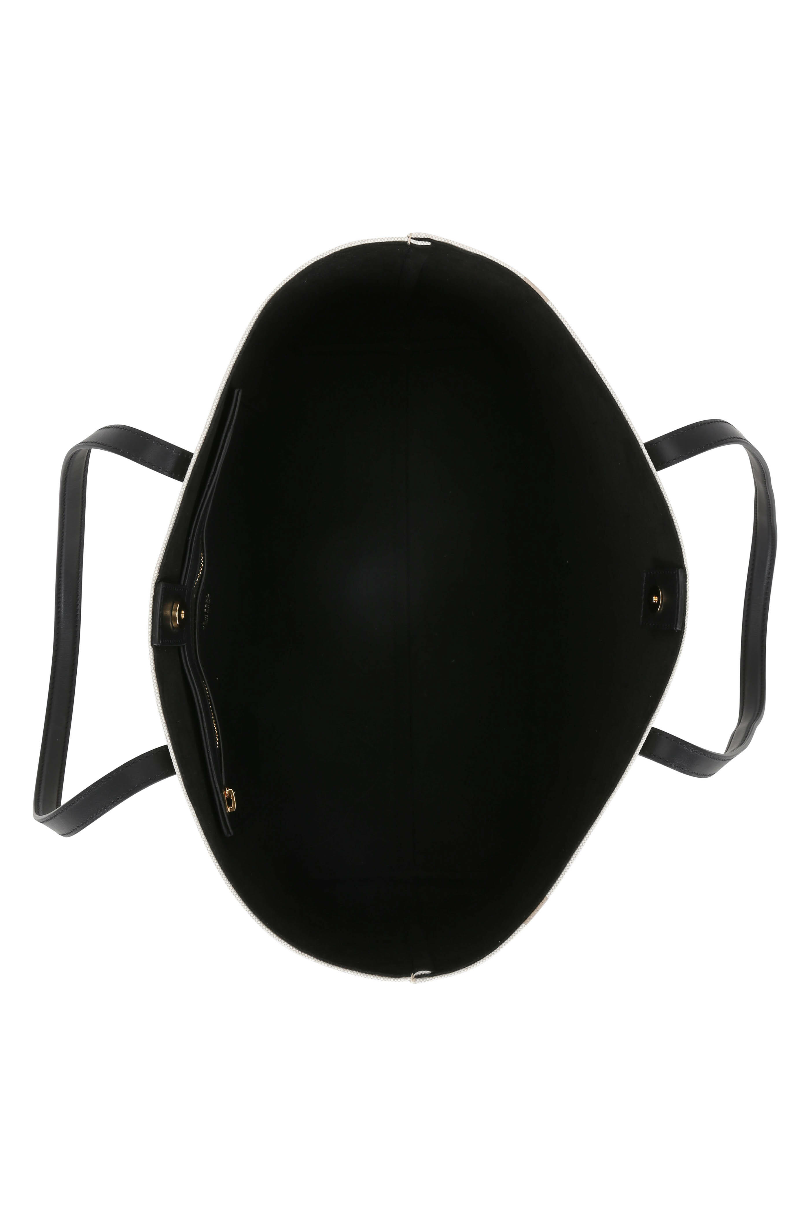 Canvas with leather trim. Dual shoulder straps with signature T detail. Open top; center tab-snap closure. Logo printed front. One interior zip pocket. Lined in microfiber. Made in Italy. Width: 14". Height: 11". Depth: 5". Handle drop: 10".